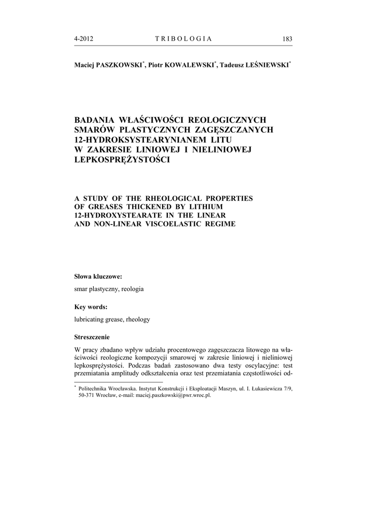 4-2012 TRIBOLOGIA 183 Maciej PASZKOWSKI *, Piotr KOWALEWSKI*, Tadeusz LEŚNIEWSKI* BADANIA WŁAŚCIWOŚCI REOLOGICZNYCH SMARÓW PLASTYCZNYCH ZAGĘSZCZANYCH 12-HYDROKSYSTEARYNIANEM LITU W ZAKRESIE LINIOWEJ I NIELINIOWEJ LEPKOSPRĘŻYSTOŚCI A STUDY OF THE RHEOLOGICAL PROPERTIES OF GREASES THICKENED BY LITHIUM 12-HYDROXYSTEARATE IN THE LINEAR AND NON-LINEAR VISCOELASTIC REGIME Słowa kluczowe: smar plastyczny, reologia Key words: lubricating grease, rheology Streszczenie W pracy zbadano wpływ udziału procentowego zagęszczacza litowego na właściwości reologiczne kompozycji smarowej w zakresie liniowej i nieliniowej lepkosprężystości. Podczas badań zastosowano dwa testy oscylacyjne: test przemiatania amplitudy odkształcenia oraz test przemiatania częstotliwości od* Politechnika Wrocławska. Instytut Konstrukcji i Eksploatacji Maszyn, ul. I. Łukasiewicza 7/9, 50-371 Wrocław, e-mail: [email protected]. 184 TRIBOLOGIA 4-2012 kształcenia. Test przemiatania amplitudy umożliwia ocenę stabilności mikrostruktury zagęszczacza w smarze plastycznym z podziałem na obszary liniowej i nieliniowej lepkosprężystości pod wpływem siły ścinającej, przy stałej częstotliwości i zmiennej amplitudzie odkształcenia. Testu przemiatania częstotliwości używa się głównie przy małych częstotliwościach oscylacji i stałym odkształceniu w celu zbadania mikrostruktury w obszarze liniowej lepkosprężystości. Badania przeprowadzono z wykorzystaniem reometru rotacyjnego Physica Anton-Paar MCR 101 pracującego w układzie stożek–płytka. WPROWADZENIE Smar plastyczny jest układem polidyspersyjnym, składającym się z fazy zdyspergowanej i dyspersyjnej. Fazę zdyspergowaną stanowią zagęszczacz i dodatki uszlachetniające, natomiast fazę dyspersyjną baza olejowa. Obecnie największą grupą smarów plastycznych są smary zagęszczane mydłami metali (około 90% produkcji światowej) [L. 1]. Wśród nich znajdują się przede wszystkim mydła litowe, wapniowe, sodowe i glinowe. Powstają one w wyniku reakcji zmydlania kwasów tłuszczowych wodorotlenkami tych metali bezpośrednio w oleju bazowym. Długość pojedynczych flokuł zagęszczacza litowego (12-hydroksystearynian litu) smaru świeżego może wynosić kilka mikrometrów, a ich średnica może wahać się w przedziale od 50 do 80 nm [L. 2]. Podczas ścinania smaru w węzłach tarcia silnie obciążonych długość pojedynczych flokuł może być kilkanaście razy mniejsza [L. 3]. W zależności od stopnia rozproszenia zagęszczacza kompozycja smarowa może zatem przyjmować cechy układu o rozdrobnieniu mechanicznym, suspensyjnym (wymiary cząstek przekraczają 0,5 µm) lub koloidalnym (wymiary cząstek mieszczą się w przedziale od 1 nm do 0,5 µm) [L. 4]. Na Rys. 1 przedstawiono zdjęcie mikrostruktury zagęszczacza litowego bez dodatków uszlachetniających (udział procentowy zagęszczacza 9%) wykonane w trybie detekcji faz za pomocą mikroskopu sił atomowych AFM. Rys. 1. Mikrostruktura zagęszczacza litowego w smarze plastycznym. Obszar skanowania 3×3 µm Fig. 1. Lithium thickener microstructure in lubricating grease. Scan area 3×3 µm 4-2012 TRIBOLOGIA 185 Smar plastyczny jest cieczą o złożonych właściwościach reologicznych. Wykazuje on cechy cieczy pseudoplastycznej z wyraźnie zaznaczoną granicą płynięcia. Gdy smar plastyczny poddamy oscylacji periodycznej naprężenia, jego odpowiedź w postaci odkształcenia względnego będzie przesunięta w fazie o kąt δ. Kąt ten zwany jest kątem przesunięcia fazowego. Na odpowiedź smaru plastycznego pod wpływem wymuszenia ma wpływ m.in. moduł sprężystości zespolonej |G*|. Moduł sprężystości zespolonej definiuje się jako sumę jego części rzeczywistej i urojonej: ∗ G= G′ + iG′′ (1) gdzie: G' jest modułem zachowawczym (składową sprężystą, będącą w fazie z naprężeniem), a G" jest modułem stratności (składową lepką przesuniętą w fazie w stosunku do naprężenia). Składowe G', G" są równe: σ0 cos δ γ0 σ G ′′ = 0 sin δ γ0 G′ = (2) (3) gdzie: σ0 jest naprężeniem stycznym przy szybkości ścinania dążącej do zera, γ0 jest szybkością ścinania dążącą do zera, a δ jest kątem przesunięcia fazowego. Moduł zachowawczy G' jest miarą energii zachowanej i oddawanej w każdym cyklu odkształcenia, natomiast moduł stratności G" jest miarą energii rozproszonej w postaci ciepła, w czasie jednego cyklu odkształcenia sinusoidalnego. Z równań (2) i (3) wynika, że kąt przesunięcia fazy δ można zapisać w postaci: tan δ = G′ G ′′ (4) Obecnie do analizy właściwości reologicznych smarów plastycznych w zakresie małych odkształceń wykorzystuje się najczęściej dwa rodzaje reologicznych testów oscylacyjnych: test przemiatania amplitudy i test przemiatania częstotliwości. Test przemiatania amplitudy umożliwia ocenę stabilności mikrostruktury zagęszczacza w smarze plastycznym z podziałem na obszary odkształcenia sprężystego (zwanego obszarem liniowej lepkosprężystości), plastycznego i płynięcia pod wpływem siły ścinającej, przy stałej częstotliwości i zmiennej amplitudzie odkształcenia. Testu przemiatania częstotliwości używa się głównie przy małych częstotliwościach oscylacji i stałym odkształceniu w celu zbadania mikrostruktury w obszarze liniowej lepkosprężystości. Reologiczne badania dynamiczno-oscylacyjne są obecnie podstawowym narzędziem w ocenie stabilności mechanicznej siatki zagęszczacza smaru plastycznego TRIBOLOGIA 186 4-2012 [L. 5, 6]. Stopień usieciowania mikrostruktury smaru oraz jej stabilność mechaniczna mogą mieć istotny wpływ na zachowanie się kompozycji smarowej podczas rozruchu smarowanych węzłów tarcia oraz w układach smarowniczych, generując dodatkowe opory przepływu smaru. Celem powyższej pracy było zbadanie wpływu udziału procentowego 12-hydroksystearynianu litu na stabilność mikrostruktury zagęszczacza