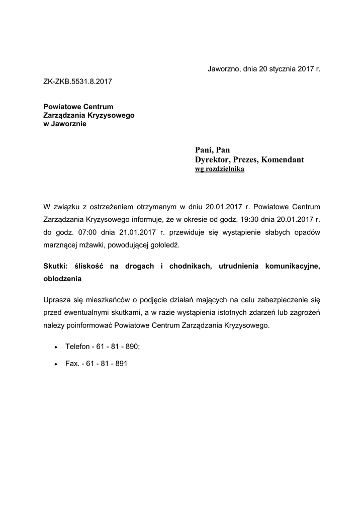 Jaworzno, dnia 20 stycznia 2017 r. ZK-ZKB.5531.8.2017 Powiatowe Centrum Zarządzania Kryzysowego w Jaworznie Pani, Pan Dyrektor, Prezes, Komendant wg rozdzielnika W związku z ostrzeżeniem otrzymanym w dniu 20.01.2017 r. Powiatowe Centrum Zarządzania Kryzysowego informuje, że w okresie od godz. 19:30 dnia 20.01.2017 r. do godz. 07:00 dnia 21.01.2017 r. przewiduje się wystąpienie słabych opadów marznącej mżawki, powodującej gołoledź. Skutki: śliskość na drogach i chodnikach, utrudnienia komunikacyjne, oblodzenia Uprasza się mieszkańców o podjęcie działań mających na celu zabezpieczenie się przed ewentualnymi skutkami, a w razie wystąpienia istotnych zdarzeń lub zagrożeń należy poinformować Powiatowe Centrum Zarządzania Kryzysowego. Telefon - 61 - 81 - 890; Fax. - 61 - 81 - 891