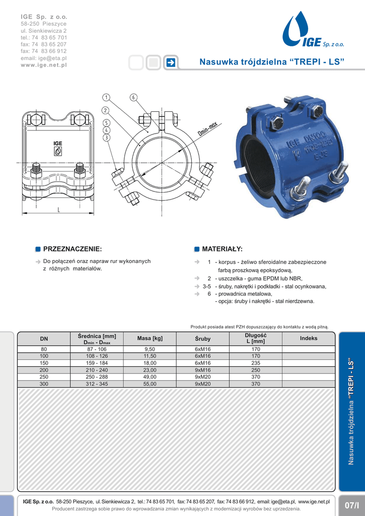 IGE Sp. z o.o. 58-250 Pieszyce ul. Sienkiewicza 2 tel.: 74 83 65 701 fax: 74 83 65 207 fax: 74 83 66 912 email: [email protected] w w w. i g e . n e t . pl Sp. z o.o. Nasuwka trójdzielna “TREPI - LS” PRZEZNACZENIE: MATERIAŁY: Do połączeń oraz napraw rur wykonanych z różnych materiałów. 1 - korpus - żeliwo sferoidalne zabezpieczone farbą proszkową epoksydową, 2 - uszczelka - guma EPDM lub NBR, 3-5 - śruby, nakrętki i podkładki - stal ocynkowana, 6 - prowadnica metalowa, - opcja: śruby i nakrętki - stal nierdzewna. Produkt posiada atest PZH dopuszczający do kontaktu z wodą pitną. Średnica [mm] Dmin - Dmax Masa [kg] Śruby Długość L [mm] 80 100 150 200 250 300 87 - 106 108 - 126 159 - 184 210 - 240 250 - 288 312 - 345 9,50 11,50 18,00 23,00 49,00 55,00 6xM16 6xM16 6xM16 9xM16 9xM20 9xM20 170 170 235 250 370 370 Indeks IGE Sp. z o.o. 58-250 Pieszyce, ul. Sienkiewicza 2, tel.: 74 83 65 701, fax: 74 83 65 207, fax: 74 83 66 912, email: [email protected], www.ige.net.pl Producent zastrzega sobie prawo do wprowadzania zmian wynikających z modernizacji wyrobów bez uprzedzenia. Nasuwka trójdzielna “TREPI - LS” DN 07/I