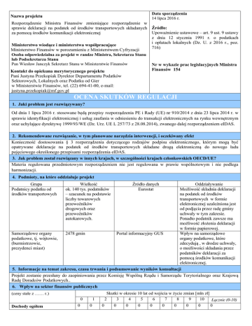 Data sporządzenia 14 lipca 2016 r. Nazwa projektu Rozporządzenie Ministra Finansów zmieniające rozporządzenie w sprawie deklaracji na podatek od środków transportowych składanych Źródło: Upoważnienie ustawowe – art. 9 ust. 9 ustawy za pomocą środków komunikacji elektronicznej z dnia 12 stycznia 1991 r. o podatkach i opłatach lokalnych (Dz. U. z 2016 r., poz. Ministerstwo wiodące i ministerstwa współpracujące 716) Ministerstwo Finansów w porozumieniu z Ministerstwem Cyfryzacji Osoba odpowiedzialna za projekt w randze Ministra, Sekretarza Stanu lub Podsekretarza Stanu Pan Wiesław Janczyk Sekretarz Stanu w Ministerstwie Finansów Nr w wykazie prac legislacyjnych Ministra Finansów 154 Kontakt do opiekuna merytorycznego projektu Pani Justyna Przekopiak Dyrektor Departamentu Podatków Sektorowych, Lokalnych oraz Podatku od Gier w Ministerstwie Finansów, tel. (22) 694-41-00, e-mail: [email protected] OCENA SKUTKÓW REGULACJI 1. Jaki problem jest rozwiązywany? Od dnia 1 lipca 2016 r. stosowane będą przepisy rozporządzenia PE i Rady (UE) nr 910/2014 z dnia 23 lipca 2014 r. w sprawie identyfikacji elektronicznej i usług zaufania w odniesieniu do transakcji elektronicznych na rynku wewnętrznym oraz uchylające dyrektywę 1999/93/WE (Dz. Urz. UE L 257/73 z 28.08.2014), zwanego dalej rozporządzeniem eIDAS. 2. Rekomendowane rozwiązanie, w tym planowane narzędzia interwencji, i oczekiwany efekt Konieczność dostosowania § 3 rozporządzenia dotyczącego rodzajów podpisu elektronicznego, którym mogą być opatrywane deklaracje na podatek od środków transportowych składane drogą elektroniczną do nowego ładu pojęciowego określonego przepisami rozporządzenia eIDAS. 3. Jak problem został rozwiązany w innych krajach, w szczególności krajach członkowskich OECD/UE? Materia regulowana przedmiotowym rozporządzeniem nie jest regulowana w prawie wspólnotowym i nie podlega harmonizacji. 4. Podmioty, na które oddziałuje projekt Oddziaływanie Możliwość składnia deklaracji na podatek od środków transportowych w formie elektronicznej uzależniona jest od podjęcia przez radę gminy uchwały w tym zakresie. Ponadto podatnik zawsze ma możliwość złożenia deklaracji w formie papierowej. Samorządowe organy 2478 gmin Portal informacyjny GUS Wpływ na samorządowe podatkowe, tj. wójtowie, organy podatkowe, które (burmistrzowie, zdecydują , w drodze uchwały, prezydenci miast) o możliwości składania przez podatników deklaracji za pomocą środków komunikacji elektronicznej. 5. Informacje na temat zakresu, czasu trwania i podsumowanie wyników konsultacji Projekt zostanie przesłany do zaopiniowania przez Komisję Wspólną Rządu i Samorządu Terytorialnego oraz Krajową Radę Doradców Podatkowych.. 6. Wpływ na sektor finansów publicznych Grupa Podatnicy podatku od środków transportowych Wielkość ok. 140 tys. podatników – szacunek na podstawie liczby towarowych przewoźników drogowych oraz przewoźników autokarowych. (ceny stałe z …… r.) 0 Dochody ogółem 0 1 0 Źródło danych Eurostat Skutki w okresie 10 lat od wejścia w życie zmian [mln zł] 2 3 4 5 6 7 8 9 10 Łącznie (0-10) 0 0 0 0 0 0 0 0 0 0 budżet państwa JST pozostałe jednostki (oddzielnie) 0 Wydatki ogółem 0 0 0 0 0 0 0 0 0 0 0 budżet państwa JST pozostałe jednostki (oddzielnie) Saldo ogółem budżet państwa JST pozostałe jednostki (oddzielnie) Źródła finansowania Dodatkowe informacje, w tym wskazanie źródeł danych i przyjętych do obliczeń założeń Możliwość przesyłania deklaracji na podatek od środków transportowych za pomocą środków komunikacji elektronicznej jest rozwiązaniem stosowanym od 2007 roku. Projektowana zmiana rozporządzenia nie spowoduje zatem zmniejszenia dochodów podmiotów sektora finansów publicznych, w tym budżetu państwa i budżetu jednostek samorządu terytorialnego, nie spowoduje również zwiększenia wydatków jednostek sektora finansów publicznych w stosunku do wielkości wynikających z obowiązujących przepisów. 7. Wpływ na konkurencyjność gospodarki i przedsiębiorczość, w tym funkcjonowanie przedsiębiorców oraz na rodzinę, obywateli i gospodarstwa domowe Czas w latach od wejścia w życie zmian W ujęciu duże przedsiębiorstwa sektor mikro-, małych i pieniężnym średnich (w mln zł, przedsiębiorstw ceny stałe z rodzina, obywatele oraz …… r.) gospodarstwa domowe (dodaj/usuń) W ujęciu duże przedsiębiorstwa niepieniężnym sektor mikro-, małych i średnich przedsiębiorstw rodzina, obywatele oraz gospodarstwa domowe 0 Skutki 1 2 3 5 10 Łącznie (0-10) (dodaj/usuń) Niemierzalne (dodaj/usuń) Dodatkowe informacje, w tym wskazanie Rozporządzenie nie wpłynie na konkurencyjność gospodarki i przedsiębiorczość, w tym źródeł danych i na funkcjonowanie przedsiębiorstw. przyjętych do obliczeń założeń 8. Zmiana obciążeń regulacyjnych (w tym obowiązków informacyjnych) wynikających z projektu ˟ nie dotyczy Wprowadzane są obciążenia poza bezwzględnie tak nie wymaganymi przez UE (szczegóły w odwróconej tabeli nie dotyczy zgodności). zmniejszenie liczby dokumentów zmniejszenie liczby procedur skrócenie czasu na załatwienie sprawy inne: zwiększenie liczby dokumentów zwiększenie liczby procedur wydłużenie czasu na załatwienie sprawy inne: Wprowadzane obciążenia są przystosowane do ich elektronizacji. tak nie nie dotyczy Komentarz: 9. Wpływ na rynek pracy Projekt nie wywiera wpływu na rynek pracy. 10. Wpływ na pozostałe obszary środowisko naturalne sytuacja i rozwój regionalny inne: Omówienie wpływu demografia mienie państwowe informatyzacja zdrowie Brak wpływu projektu na pozostałe obszary. 11. Planowane wykonanie przepisów aktu prawnego Rozporządzenie wejdzie w życie w II połowie 2016 r. 12. W jaki sposób i kiedy nastąpi ewaluacja efektów projektu oraz jakie mierniki zostaną zastosowane? Ze względu na przedmiot projektu nie przewiduje si