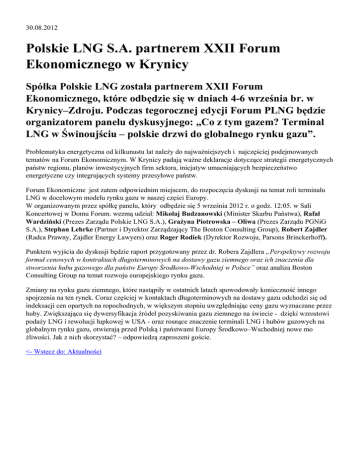 30.08.2012 Polskie LNG S.A. partnerem XXII Forum Ekonomicznego w Krynicy Spółka Polskie LNG została partnerem XXII Forum Ekonomicznego, które odbędzie się w dniach 4-6 września br. w Krynicy–Zdroju. Podczas tegorocznej edycji Forum PLNG będzie organizatorem panelu dyskusyjnego: „Co z tym gazem? Terminal LNG w Świnoujściu – polskie drzwi do globalnego rynku gazu”. Problematyka energetyczna od kilkunastu lat należy do najważniejszych i najczęściej podejmowanych tematów na Forum Ekonomicznym. W Krynicy padają ważne deklaracje dotyczące strategii energetycznych państw regionu, planów inwestycyjnych firm sektora, inicjatyw umacniających bezpieczeństwo energetyczne czy integrujących systemy przesyłowe państw. Forum Ekonomiczne jest zatem odpowiednim miejscem, do rozpoczęcia dyskusji na temat roli terminalu LNG w docelowym modelu rynku gazu w naszej części Europy. W organizowanym przez spółkę panelu, który odbędzie się 5 września 2012 r. o godz. 12:05. w Sali Koncertowej w Domu Forum. wezmą udział: Mikołaj Budzanowski (Minister Skarbu Państwa), Rafał Wardziński (Prezes Zarządu Polskie LNG S.A.), Grażyna Piotrowska – Oliwa (Prezes Zarządu PGNiG S.A.), Stephan Lehrke (Partner i Dyrektor Zarządzający The Boston Consulting Group), Robert Zajdler (Radca Prawny, Zajdler Energy Lawyers) oraz Roger Rodiek (Dyrektor Rozwoju, Parsons Brinckerhoff). Punktem wyjścia do dyskusji będzie raport przygotowany przez dr. Robera Zajdlera „Perspektywy rozwoju formuł cenowych w kontraktach długoterminowych na dostawy gazu ziemnego oraz ich znaczenia dla stworzenia hubu gazowego dla państw Europy Środkowo-Wschodniej w Polsce” oraz analiza Boston Consulting Group na temat rozwoju europejskiego rynku gazu. Zmiany na rynku gazu ziemnego, które nastąpiły w ostatnich latach spowodowały konieczność innego spojrzenia na ten rynek. Coraz częściej w kontaktach długoterminowych na dostawy gazu odchodzi się od indeksacji cen opartych na ropochodnych, w większym stopniu uwzględniając ceny gazu wyznaczane przez huby. Zwiększająca się dywersyfikacja źródeł pozyskiwania gazu ziemnego na świecie - dzięki wzrostowi podaży LNG i rewolucji łupkowej w USA - oraz rosnące znaczenie terminali LNG i hubów gazowych na globalnym rynku gazu, otwierają przed Polską i państwami Europy Środkowo–Wschodniej nowe mo żliwości. Jak z nich skorzystać? – odpowiedzą zaproszeni goście. <- Wstecz do: Aktualności