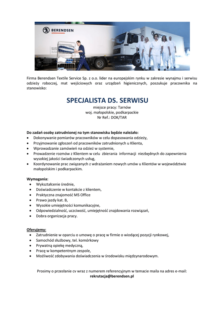 Firma Berendsen Textile Service Sp. z o.o. lider na europejskim rynku w zakresie wynajmu i serwisu odzieży roboczej, mat wejściowych oraz urządzeo higienicznych, poszukuje pracownika na stanowisko: SPECJALISTA DS. SERWISU miejsce pracy: Tarnów woj. małopolskie, podkarpackie Nr Ref.: DOK/TAR Do zadao osoby zatrudnionej na tym stanowisku będzie należało: Dokonywanie pomiarów pracowników w celu dopasowania odzieży, Przyjmowanie zgłoszeo od pracowników zatrudnionych u Klienta, Wprowadzanie zamówieo na odzież w systemie, Prowadzenie rozmów z Klientem w celu zbierania informacji niezbędnych do zapewnienia wysokiej jakości świadczonych usług, Koordynowanie prac związanych z wdrażaniem nowych umów u Klientów w województwie małopolskim i podkarpackim. Wymagania: Wykształcenie średnie, Doświadczenie w kontakcie z klientem, Praktyczna znajomośd MS Office Prawo jazdy kat. B, Wysokie umiejętności komunikacyjne, Odpowiedzialnośd, uczciwośd, umiejętnośd znajdowania rozwiązao, Dobra organizacja pracy. Oferujemy: Zatrudnienie w oparciu o umowę o pracę w firmie o wiodącej pozycji rynkowej, Samochód służbowy, tel. komórkowy Prywatną opiekę medyczną, Pracę w kompetentnym zespole, Możliwośd zdobywania doświadczenia w środowisku międzynarodowym. Prosimy o przesłanie cv wraz z numerem referencyjnym w temacie maila na adres e-mail: [email protected]