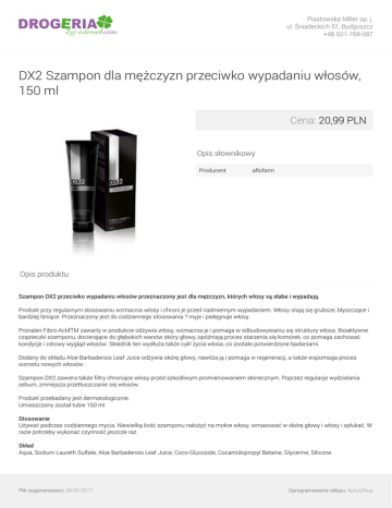 Piastowska Miller sp. j. ul. Śniadeckich 51, Bydgoszcz +48 501-768-087 DX2 Szampon dla mężczyzn przeciwko wypadaniu włosów, 150 ml Cena: 20,99 PLN Opis słownikowy Producent aflofarm Opis produktu Szampon DX2 przeciwko wypadaniu włosów przeznaczony jest dla mężczyzn, których włosy są słabe i wypadają. Produkt przy regularnym stosowaniu wzmacnia włosy i chroni je przed nadmiernym wypadaniem. Włosy stają się grubsze, błyszczące i bardziej lśniące. Przeznaczony jest do codziennego stosowania ? myje i pielęgnuje włosy. Pronalen Fibro-ActifTM zawarty w produkcie odżywia włosy, wzmacnia je i pomaga w odbudowywaniu się struktury włosa. Bioaktywne cząsteczki szamponu, docierające do głębokich warstw skóry głowy, opóźniają proces starzenia się komórek, co pomaga zachować kondycje i zdrowy wygląd włosów. Składnik ten wydłuża także cykl życia włosa, co zostało potwierdzone badaniami. Dodany do składu Aloe Barbadensis Leaf Juice odżywia skórę głowy, nawilża ją i pomaga w regeneracji, a także wspomaga proces wzrostu nowych włosów. Szampon DX2 zawiera także filtry chroniące włosy przed szkodliwym promieniowaniem słonecznym. Poprzez regulacje wydzielania sebum, zmniejsza przetłuszczanie się włosów. Produkt przebadany jest dermatologicznie. Umieszczony został tubie 150 ml. Stosowanie Używać podczas codziennego mycia. Niewielką ilość szamponu nałożyć na mokre włosy, wmasować w skórę głowy i włosy i spłukać. W razie potrzeby wykonać czynność jeszcze raz. Skład Aqua, Sodium Laureth Sulfate, Aloe Barbadensis Leaf Juice, Coco-Glucoside, Cocamidopropyl Betaine, Glycerine, Silicone Plik wygenerowano: 08-03-2017 Oprogramowanie sklepu: AptusShop Piastowska Miller sp. j. ul. Śniadeckich 51, Bydgoszcz +48 501-768-087 Quaternium-16/Undeceth-11/Butyloctanol/Undeceth-5, Butylene Glycol/Glycine Soja Germ Extract/Triticum Vulgare Germ Extract, PEG-4 Rapeseedamide, Sodium Chloride, PEG-120 Methyl Glucose Trioleate/ Propylene Glycol, Benzyl Alcohol/Methylchloroisothiazolinone/Mathylisothiazolinone, Parfum, Citric Acid. Plik wygenerowano: 08-03-2017 Powered by TCPDF (www.tcpdf.org) Oprogramowanie sklepu: AptusShop