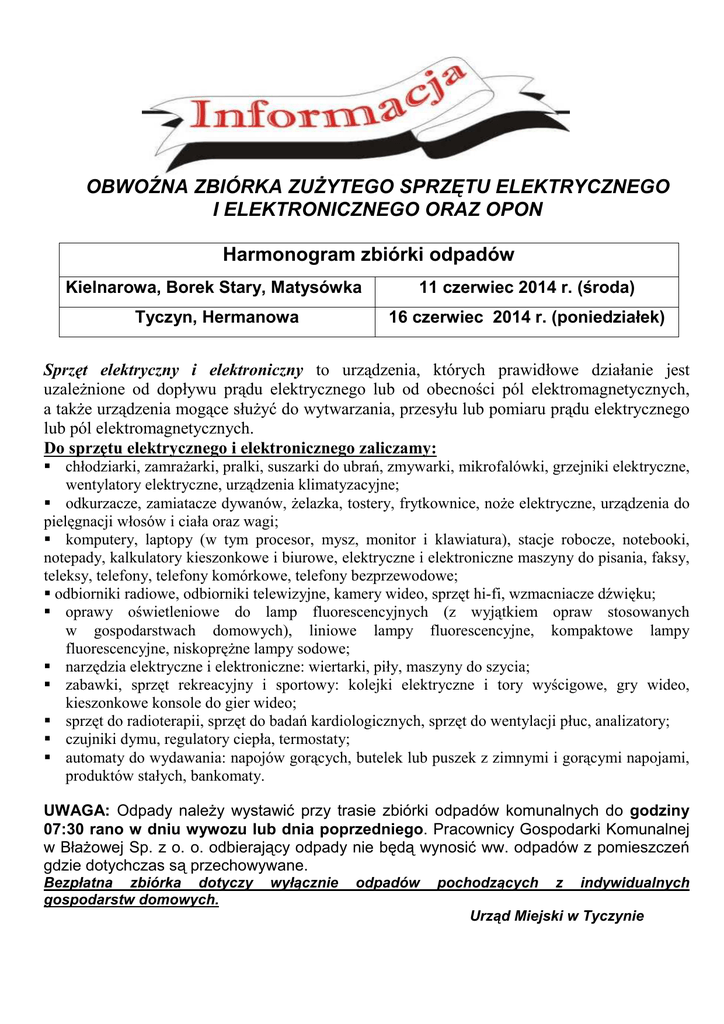 OBWOŹNA ZBIÓRKA ZUŻYTEGO SPRZĘTU ELEKTRYCZNEGO I ELEKTRONICZNEGO ORAZ OPON Harmonogram zbiórki odpadów Kielnarowa, Borek Stary, Matysówka 11 czerwiec 2014 r. (środa) Tyczyn, Hermanowa 16 czerwiec 2014 r. (poniedziałek) Sprzęt elektryczny i elektroniczny to urządzenia, których prawidłowe działanie jest uzależnione od dopływu prądu elektrycznego lub od obecności pól elektromagnetycznych, a także urządzenia mogące służyć do wytwarzania, przesyłu lub pomiaru prądu elektrycznego lub pól elektromagnetycznych. Do sprzętu elektrycznego i elektronicznego zaliczamy: chłodziarki, zamrażarki, pralki, suszarki do ubrań, zmywarki, mikrofalówki, grzejniki elektryczne, wentylatory elektryczne, urządzenia klimatyzacyjne; odkurzacze, zamiatacze dywanów, żelazka, tostery, frytkownice, noże elektryczne, urządzenia do pielęgnacji włosów i ciała oraz wagi; komputery, laptopy (w tym procesor, mysz, monitor i klawiatura), stacje robocze, notebooki, notepady, kalkulatory kieszonkowe i biurowe, elektryczne i elektroniczne maszyny do pisania, faksy, teleksy, telefony, telefony komórkowe, telefony bezprzewodowe; odbiorniki radiowe, odbiorniki telewizyjne, kamery wideo, sprzęt hi-fi, wzmacniacze dźwięku; oprawy oświetleniowe do lamp fluorescencyjnych (z wyjątkiem opraw stosowanych w gospodarstwach domowych), liniowe lampy fluorescencyjne, kompaktowe lampy fluorescencyjne, niskoprężne lampy sodowe; narzędzia elektryczne i elektroniczne: wiertarki, piły, maszyny do szycia; zabawki, sprzęt rekreacyjny i sportowy: kolejki elektryczne i tory wyścigowe, gry wideo, kieszonkowe konsole do gier wideo; sprzęt do radioterapii, sprzęt do badań kardiologicznych, sprzęt do wentylacji płuc, analizatory; czujniki dymu, regulatory ciepła, termostaty; automaty do wydawania: napojów gorących, butelek lub puszek z zimnymi i gorącymi napojami, produktów stałych, bankomaty. UWAGA: Odpady należy wystawić przy trasie zbiórki odpadów komunalnych do godziny 07:30 rano w dniu wywozu lub dnia poprzedniego. Pracownicy Gospodarki Komunalnej w Błażowej Sp. z o. o. odbierający odpady nie będą wynosić ww. odpadów z pomieszczeń gdzie dotychczas są przechowywane. Bezpłatna zbiórka dotyczy gospodarstw domowych. wyłącznie odpadów pochodzących z indywidualnych Urząd Miejski w Tyczynie