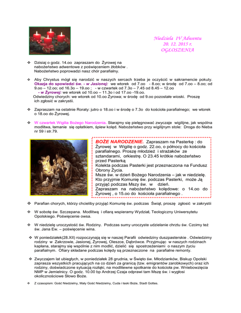 Niedziela IV Adwentu 20. 12. 2015 r. OGŁOSZENIA Dzisiaj o godz. 14.oo zapraszam do Żyrowej na nabożeństwo adwentowe z poświęceniem żłobków . Nabożeństwo poprowadzi nasz chór parafialny. Aby Chrystus mógł się narodzić w naszych sercach trzeba je oczyścić w sakramencie pokuty. Okazja do spowiedzi św. - w Jasionej: we wtorek od 7.oo - 8.oo; w środę od 7.oo – 8.oo; od 9.oo – 12.oo; od 16.3o – 19.oo ; - w czwartek od 7.3o – 7.45 od 8.45 – 12.oo - w Żyrowej: we wtorek od 10.oo – 11.3o i od 17.oo -19.oo. Odwiedziny chorych: we wtorek od 10.oo Żyrowa; w środę od 9.oo pozostałe wioski. Proszę ich zgłosić w zakrystii. Zapraszam na ostatnie Roraty: jutro o 18.oo i w środę o 7.3o do kościoła parafialnego; we wtorek o 18.oo do Żyrowej. W czwartek Wigilia Bożego Narodzenia. Starajmy się pielęgnować zwyczaje wigilijne, jak wspólna modlitwa, łamanie się opłatkiem, śpiew kolęd. Nabożeństwo przy wigilijnym stole: Droga do Nieba nr 59 i str.79. BOŻE NARODZENIE. Zapraszam na Pasterkę : do Żyrowej w Wigilię o godz. 22.oo, o północy do kościoła parafialnego. Proszę młodzież i strażaków ze sztandarami, orkiestrę. O 23.45 krótkie nabożeństwo przed Pasterką Kolekta podczas Pasterki jest przeznaczona na Fundusz Obrony Życia. Msze św. w dzień Bożego Narodzenia – jak w niedzielę. Kto przyjmie Komunię św. podczas Pasterki, może Ją przyjąć podczas Mszy św. w dzień. Zapraszam na nabożeństwo kolędowe: o 14.oo do Żyrowej , o 15.oo do kościoła parafialnego . Parafian chorych, którzy chcieliby przyjąć Komunię św. podczas Świąt, proszę zgłosić w zakrystii W sobotę św. Szczepana. Modlitwą i ofiarą wspieramy WydziaŁ Teologiczny Uniwersytetu Opolskiego. Poświęcenie owsa. W niedzielę uroczystość św. Rodziny. Podczas sumy uroczyste udzielanie chrztu św. Czcimy też św. Jana Ew. – poświęcenie wina. W poniedziałek(28.XII) rozpoczynają się w naszej Parafii odwiedziny duszpasterskie . Odwiedzimy rodziny w Zakrzowie, Jasionej, Żyrowej, Oleszce, Dąbrówce. Przyjmując w naszych rodzinach kapłana, starajmy się wspólnie z nim modlić, dzielić się spostrzeżeniami o naszym życiu parafialnym. Ofiary składane podczas kolędy są przeznaczone na parafialne remonty. Zwyczajem lat ubiegłych, w poniedziałek 28 grudnia, w Święto św. Młodzianków, Biskup Opolski zaprasza wszystkich pracujących na co dzień za granicą (tzw. emigrantów zarobkowych) oraz ich rodziny, doświadczone sytuacją rozłąki, na modlitewne spotkanie do kościoła pw. Wniebowzięcia NMP w Jemielnicy. O godz. 10.00 bp Andrzej Czaja odprawi tam Mszę św. i wygłosi okolicznościowe Słowo Boże. Z czasopism: Gość Niedzielny, Mały Gość Niedzielny, Cuda i łaski Boże, Stadt Gottes.