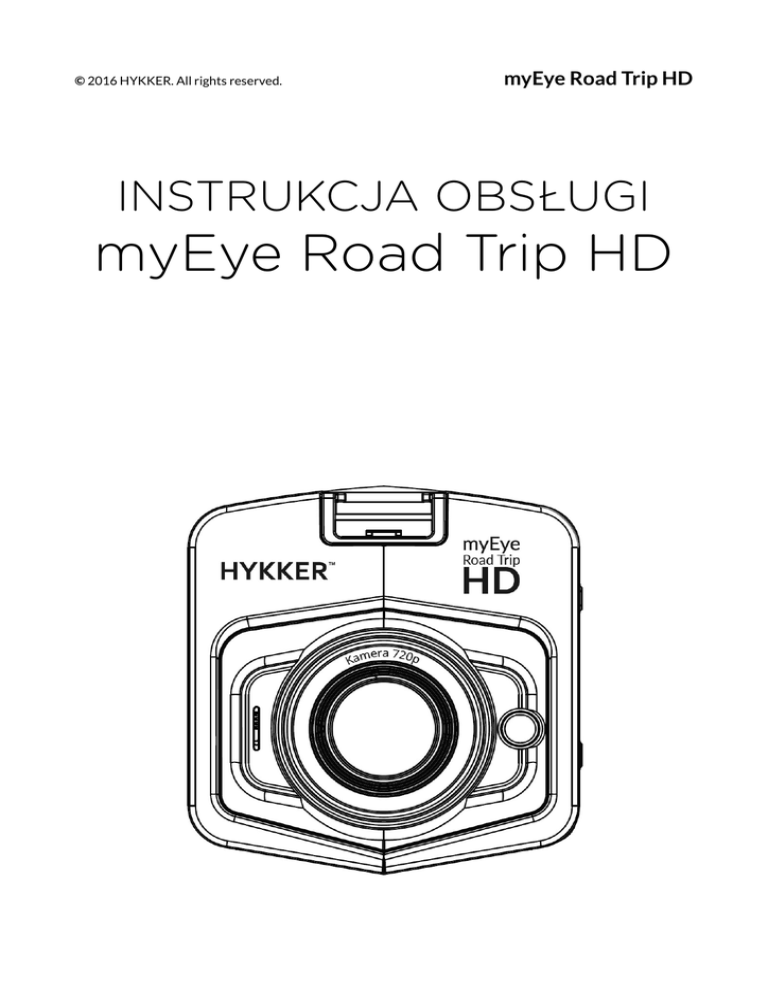 © 2016 HYKKER. All rights reserved. myEye Road Trip HD INSTRUKCJA OBSŁUGI myEye Road Trip HD © 2016 HYKKER. All rights reserved. myEye Road Trip HD Dziękujemy za wybranie urządzenia marki Hykker. Niniejsza instrukcja ma na celu zapoznanie użytkownika z obsługą i funkcjami urządzenia. Ta instrukcja jest nierozłączną częścią urządzenia. Należy zachować ją w całości i w miejscu łatwo dostępnym przez cały czas użytkowania zestawu. Bez uprzedniej pisemnej zgody producenta żadna część niniejszej instrukcji obsługi nie może być powielana, rozpowszechniana, tłumaczona ani przekazywana w jakiejkolwiek formie czy przy użyciu jakichkolwiek środków elektronicznych bądź mechanicznych, w tym przez tworzenie fotokopii, rejestrowanie lub przechowywanie w jakichkolwiek systemach przechowywania i udostępniania informacji. Nr partii: 201604 2 © 2016 HYKKER. All rights reserved. myEye Road Trip HD BEZPIECZEŃSTWO Zapoznaj się uważnie z podanymi tu wskazówkami. Nieprzestrzeganie tych wskazówek może być niebezpieczne lub niezgodne z prawem. NIE RYZYKUJ Nie należy zostawiać urządzenia lub akcesoriów na widoku po opuszczeniu samochodu. Mogą one stać się łatwym łupem dla złodziei. BEZPIECZEŃSTWO W RUCHU DROGOWYM Nie należy obsługiwać urządzenia podczas prowadzenia pojazdów. Należy upewnić się, że produkt i jego elementy, np. przewód ładowarki samochodowej, w żaden sposób nie przeszkadzają kierowcy w kierowaniu samochodem. Należy przestrzegać wszystkich praw dotyczących używania urządzeń przenośnych w pojazdach. Należy upewnić się, że zestaw myEye Road Trip HD nie będzie przeszkadzał, ani nie spowoduje obrażeń w przypadku zadziałania systemu poduszek powietrznych. OBSZARY O OGRANICZONYM DOSTĘPIE Nie włączaj urządzenia w miejscach, w których zabrania się korzystania z urządzeń elektronicznych, ani wtedy, gdy może to spowodować zakłócenia lub inne zagrożenia. Urządzenie może zakłócać pracę sprzętu medycznego w szpitalach i placówkach ochrony zdrowia. Należy się stosować do wszelkiego rodzaju zakazów, przepisów i ostrzeżeń przekazywanych przez personel medyczny. PROFESJONALNY SERWIS Naprawiać ten produkt może wyłącznie wykwalifikowany serwis lub autoryzowany punkt serwisowy. Naprawa urządzenia przez niewykwalifikowany serwis lub przez nieautoryzowany punkt serwisowy grozi uszkodzeniem urządzenia i utratą gwarancji. 3 © 2016 HYKKER. All rights reserved. myEye Road Trip HD AKUMULATORY I AKCESORIA Należy unikać wystawiania akumulatora na działanie bardzo niskich lub bardzo wysokich temperatur (poniżej 0°C / 32°F lub powyżej 40°C / 100°F ). Nie pozostawiać urządzenia na dłuższy okres czasu przyklejonego do szyby samochodu przy dużym nasłonecznieniu lub w zimie przy niskiej temperaturze otoczenia. Najlepiej każdorazowo po zakończonej jeździe urządzenie chować w zacienionym miejscu (np. schowku samochodowym). Ekstremalne temperatury mogą mieć wpływ na pojemność i żywotność akumulatora. Unikać też należy kontaktu akumulatora z płynami i metalowymi przedmiotami. Taki kontakt może doprowadzić do całkowitego lub częściowego uszkodzenia akumulatora. Akumulatora należy używać tylko zgodnie z jego przeznaczeniem. Nieużywaną ładowarkę należy odłączać od zasilania. Przeładowanie akumulatora może powodować jego uszkodzenie. W związku z tym, nie należy jednorazowo ładować akumulatora dłużej niż 12 godzin. Sugeruje się nie pozostawiać ładowanego urządzenia bez nadzoru. W przypadku uszkodzenia przewodu ładowarki nie należy go naprawiać, tylko wymienić ładowarkę na nową. Należy używać tylko oryginalnych akcesoriów Hykker, które dostępne są w zestawie z urządzeniem. WODOODPORNOŚĆ To urządzenie nie jest wodoodporne. Chroń je przed wilgocią. DZIECI Urządzenie nie jest zabawką. Przechowuj urządzenie oraz jego akcesoria z dala od zasięgu dzieci. 4 myEye Road Trip HD © 2016 HYKKER. All rights reserved. Korzystanie z instrukcji obsługi Zdjęcia urządzenia oraz zrzuty ekranu zamieszczone w tej instrukcji obsługi mogą się różnić od rzeczywistego produktu. Akcesoria dołączone do zestawu myEye mogą wyglądać inaczej niż na ilustracjach zamieszczonych w niniejszej instrukcji. Najnowszą wersję instrukcji obsługi można znaleźć na stronie WWW firmy: http://www.hykker.com Ważne informacje Producent nie odpowiada za nieprawidłowości, które mogą się pojawić podczas edytowana ustawień rejestru i modyfikowania oprogramowania systemu operacyjnego. Próby wprowadzania zmian w systemie operacyjnym mogą być przyczyną nieprawidłowego działania urządzenia, oraz podstawą do unieważnienia gwarancji. Dane producenta myPhone Sp. z o.o. ul. Nowogrodzka 31 00-511 Warszawa Polska Biuro obsługi klienta myPhone Sp. z o.o. ul. Krakowska 119 50-428 Wrocław Polska Infolinia: (+48 71) 71 77 400 E-mail: [email protected] Strona WWW: http://www.hykker.com Wyprodukowano w Chinach. 5 © 2016 HYKKER. All rights reserved. myEye Road Trip HD Spis treści Zawartość zestawu...................................................................................................................................... 7 1. Wprowadzenie ................................................................................................................................. 8 Wygląd ...................................................................................................................................................................... 8 Włączanie i wyłączanie urządzenia .............................................................................................................. 9 Resetowanie urządzenia.................................................................................................................................... 9 Montaż i demontaż urządzenia...............................................................................