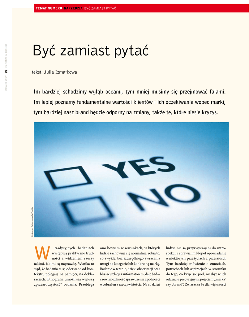 czerwiec 2009 52 Być zamiast pytać tekst: Julia Izmałkowa Im bardziej schodzimy wgłąb oceanu, tym mniej musimy się przejmować falami. Im lepiej poznamy fundamentalne wartości klientów i ich oczekiwania wobec marki, tym bardziej nasz brand będzie odporny na zmiany, także te, które niesie kryzys. © Gregor Schuster/zefa/Corbis marketing w praktyce temat numeru Narzędzia Być zamiast pytać W tradycyjnych badaniach występują praktyczne trudności z widzeniem rzeczy takimi, jakimi są naprawdę. Wynika to stąd, że badania te są oderwane od kontekstu, polegają na pamięci, na deklaracjach. Etnografia umożliwia większą „przezroczystość” badania. Przebiega ono bowiem w warunkach, w których ludzie zachowują się normalnie, robią to, co zwykle, bez szczególnego zwracania uwagi na kategorie lub konkretną markę. Badanie w terenie, dzięki obserwacji oraz bliższej relacji z informatorem, daje badaczowi możliwość sprawdzenia zgodności wyobrażeń z rzeczywistością. Na co dzień ludzie nie są przyzwyczajeni do introspekcji i sprawia im kłopot opowiadanie o niektórych przeżyciach z przeszłości. Tym bardziej mówienie o emocjach, potrzebach lub aspiracjach w stosunku do tego, co kryje się pod, niezbyt w ich odczuciu precyzyjnym, pojęciem „marka” czy „brand”. Zwłaszcza że dla większości Znaczenie kontekstu W życiu każdego konsumenta marki tworzą sieć drogowskazów, tyle że ten sam kierunkowskaz dla różnych grup ludzi może mieć inne znaczenie. Dlatego badając markę, musimy zbadać jak najwięcej kontekstów. Marka jogurtów będzie miała taką samą wagę znaczeniową dla matek dzieci alergików, co nazwa brandu kurtki z „Plotkary” dla nastolatki. W różnych okolicznościach dla różnych osób liczą się po prostu inne rzeczy. Ale to żadne odkrycie. Każda zdroworozsądkowo myśląca osoba jest w stanie mniej więcej ocenić, z której kategorii marki są ważne dla określonej grupy. Jednak konteksty nie zawsze są takie oczywiste. Bywają zaskakujące. I w takich przypadkach pomocna jest etnografia. Gdy robiliśmy badania kosmetyków, kobiety bardzo dokładnie opowiadały badaczom o powodach woboru poszczególnych marek. Wypowiadały się mądrze i rzeczowo. Zarówno badacze, jak i klient zamawiający badanie, mogliby być bardzo zadowoleni, ale… Podczas wywiadu w łazience zauważaliśmy, że kosmetyki niektórych marek były pochowane głęboko w szafkach, a inne – na wierzchu, pod ręką, ładnie wyeksponowane. Ponieważ cena nie stanowiła wytłumaczenia tego faktu – drążyliśmy dalej. I co się okazało? Przywiązanie do niektórych marek wynikało z… ich kolorystki. One po prostu pasowały do urody wnętrza. Tak wielka estetyzacja była możliwa tylko u kobiet o mało wymagającej cerze. Nie zmienia to jednak faktu, że na początku informatorki te wstydziły się po prostu przyznać do swojego głównego motywu zakupu danego kosmetyku. Różne definicje marki Konsumenci bardzo często stosują własne podziały – że to jest marka, a to z kolei nią nie jest. Warto więc uwzględniać, jak definiują i dzielą marki, bo badając „na siłę” możemy uzyskać wyniki, które będą miały niewiele wspólnego z prawdą. Głębsze metody etnograficzne, takie jak mieszkanie z badanymi (przez 1-7 dni), pozwalają badaczom poznać te rozmaite definicje marek, asocjacje z nimi związane oraz sposoby klasyfikacji. Ryba dowiaduje się, czym jest woda, dopiero kiedy się z niej wynurzy – podobnie jest z wypowiedziami na temat marek. Emocje związane z marką są tak subtelne, że można je wyjaśnić dopiero, kiedy rutyna zostanie przerwana lub gdy badacz zwróci na nią uwagę rozmówcy. Zdarza się, że badany chwali „świetny krem Soraya”, gdy w rzeczywistości na jego półce stoi krem DrEris i dopiero zaskoczenie badacza etnografa sprawia, że zdaje sobie sprawę z pomyłki. Dowiedzenie się, skąd taka pomyłka się wzięła, wymaga dużego kunsztu badawczego. Jeżeli kategoria jest rozmyta – „Nie wiem, jaki dżem jem. Na pewno jakiś markowy” – gdy dopytujemy się o stosunek do konkretnych marek, odpowiedzi często są wymyślane na poczekaniu. Etnografia umożliwia natychmiastowe ich sprawdzenie – zaglądamy do lodówki, pytamy dzieci. Dzięki temu wiemy, co cała rodzina myśli np. o jogurtach, 8 reklama 53 czerwiec 2009 konsumentów marka ma bardziej praktyczne niż filozoficzne znaczenie. Łatwiej się dowiedzieć, w jaki sposób respondenci badania używają danego produktu (zresztą i w tej kwestii często odbiegają od rzeczywistości), niż tego, jakie rzeczywiste znaczenie ma dla nich marka. Dlaczego więc etnografia jest tak dobrą techniką przy badaniu marek? Dlatego, że dzięki niej możemy rzeczywiście poznać całą tęczę znaczeń, motywacji zakupowych, skojarzeń, oczekiwań oraz wymagań wobec marki. marketing w praktyce Być zamiast pytać Narzędzia temat numeru marketing w praktyce temat numeru Narzędzia Być zamiast pytać czerwiec 2009 54 8 proszkach do prania czy kawie. Ale oprócz tego trzeba się dowiedzieć – i etnografia to umożliwia – co tworzy „markowość”, jakie są atrybuty stałe dla kategorii i z jakiego powodu marka, pomimo używania jej na co dzień, rozpoznawana jest tylko dzięki opakownaniu oraz stałemu miejscu na półce w sklepie. Rozmaitość kategoryzacji marek Portfel marki ułożony przez konsumenta często znacząco odbiega od marketingowego. Nic w tym złego – kategoryzacja marketingowa często jest niezbędna do realizacji celów biznesowych. Jednak świadomość, jak konsument segmentuje produkty, jest absolutnie niezbędna, aby móc skutecznie pracować z marką. Żeby zbadać naturalne odruchy konsumentów, warto użyć techniki obserwacji – ważne jest uzwględnienie oczekiwań, sposobów poszukiwania i reakcji na znalezienie (lub nie) poszukiwanej marki. Każdy pracujący w branży FMCG docenia rolę otoczenia marki. Wa