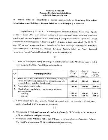 Uchwała Nr 658/10 Powiatu Krośnieńskiego z dnia 18 listopada 2010 r. Zarządu opłat w sprawie Młodzieżowym za korzystanie z miejsc noclegowych w Szkolnym Schronisku w Dukli przy Zespole Na podstawie § 67 ust. 1 i 2 Szkół im. Armii Krajowej w Jedliczu. Rozporządzenia z dnia 7 marca 2005 r. w sprawie rodzajów i Ministra Edukacji Narodowej i Sportu szczegółowych zasad działania publicznych, warunków pobytu dzieci i młodzieży w tych placówkach oraz odpłatności ·wysokości i zasad wnoszonej przez rodziców za pobyt ich dzieci w tych placówkach (Dz. U. Nr 52, poz. 467 ze zm.) w porozumieniu z Zarządem Młodzieżowych Krośnie w Zarząd w Jedliczu, placówek Oddziału na wniosek dyrektora Powiatu Krośnieńskiego uchwala co Polskiego Towarzystwa Schronisk Zespołu Szkół im. Armii Krajowej następuje: §1 1. Ustala się następujące opłaty przy Zespole Szkół Lp. za noclegi w Szkolnym Schronisku Młodzieżowym w Dukli im. Armii Krajowej w Jedliczu: Miejsce w pokoju Wyszczególnienie Miejsce w pokoju Miejsce w pokoju wie/oosob. 1-4 5-8 osobowvm osobowvm szkolna i akademicka, pracownicy oświatowi (także emerytowani), opiekunowie zorganizowan ych grup młodzieży szkolnej i studenckiej 16,00 zł. 14,00 zł. 10,00 zł. 2. Pozostali obywatele polscy 17,00 zł. 15,00 zł. 13,00 zł. 3. Obcokrajowcy posiadający: gościnną IYHF - juniorzy - semorzy 15,00 zł. 17,00 zł. 13,00 zł. 15,00 zł. 9,00 zł. 13,00 zł. I. Młodzież 2. Stawki określone doliczyć legitymację lub kartę w ust. 1 pkt. 2 i 3 tabeli podatek VAT w ustawowej są cenami netto i do powyższych kwot należy wysokości. §2 1. Członkowie z 20 % PTSM zniżki 2. Posiadacze Turystyki" legitymujący się ważną legitymacją PTSM mają prawo skorzystać od stawki podstawowej. Złotej Odznaki PTSM lub Odznaki w stopniu mają prawo do 50 % zniżki złotym „Zasłużony Działacz od stawki podstawowej. dłuższy niż 3. Ceny za nocleg nietypowych) mogą być 3 dni (z wyłączeniem obozów wędrownych po trasach zmniejszone przez vvychowawcę Schroniska do 30 % w stosunku do cen ustalonych w § 1. 4. W okresie od 1 września do 20 grudnia i od 20 lutego do 30 kwietnia może być stosowana przez wychowawcę Schroniska zniżka posezonowa w wysokości 25% od ceny ustalonej w§ 1. 5. W przypadku uprawmema do kilku zniżek przysługuje tylko jedna najkorzystniejsza zniżka. §3 1. Opłata za nocleg przygotowany na doraźnym posłaniu zastępczym (łóżko materac) wynosi 50% stawki podstawowej określonej polowe, w§ 1 za miejsca w pokoju wieloosobowym. 2. Opłata wstępu za korzystanie ze Schroniska w pomieszczeń do i wynosi w zależności ciągu dnia od godz. 10.00 - 17.00 (bez prawa wychowawcę noclegowych) ustalana jest przez Schroniska od stopnia wykorzystania 2 - 4 zł brutto od osoby. §4 1. Wszystkie osoby z własnej lub 2. Niezależnie korzystające wypożyczonej od opłat się 3. Aktualnie aktualnie korzystające z bielizny koszty jej prania określone przez obowiązującymi obowiązujący zobowiązane są do korzystania bielizny pościelowej. za nocleg osoby pokrywająjednorazowo kieruje z noclegu w Schronisku cenami w cennik znajduje się zakładach na tablicy pościelowej wychowawcę Schroniska Schroniska. który pralniczych. ogłoszeń w Schronisku. §5 Uchwała wchodzi w życie z dniem podjęcia. §6 Traci moc w sprawie w Dukli. Uchwała opłat za Nr 50/07 usługi Zarządu Powiatu Krośnieńskiego w Szkolnym Schronisku z dnia 27 hvietnia 2007 r. Młodzieżowym przy Zespole Szkół