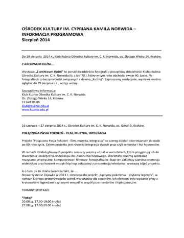 OŚRODEK KULTURY IM. CYPRIANA KAMILA NORWIDA – INFORMACJA PROGRAMOWA Sierpień 2014 Do 29 sierpnia 2014 r., Klub Kuźnia Ośrodka Kultury im. C. K. Norwida, os. Złotego Wieku 14, Kraków. Z ARCHIWUM KUŹNI…. Wystawa „Z archiwum Kuźni” to ponad dwadzieścia fotografii z początków działalności Klubu Kuźnia Ośrodka Kultury im. C. K. Norwida (tj. z lat ’70.), który w tym roku obchodzi swoje 40. Lecie. Na fotografiach zobaczymy ludzi związanych z dawną „Kuźnią”. Zapraszamy serdecznie, wystawę można oglądać do 29 sierpnia b.r., wstęp wolny . Szczegółowa Informacja: Klub Kuźnia Ośrodka Kultury im. C. K. Norwida Os. Złotego Wieku 14, Kraków 12 648 08 86 [email protected] www.kuznia.edu.pl 16 czerwca – 27 sierpnia 2014 r., Ośrodek Kultury im. C. K. Norwida, os. Górali 5, Kraków. POŁĄCZONA PASJA POKOLEŃ - FILM, MUZYKA, INTEGRACJA Projekt "Połączona Pasja Pokoleń - film, muzyka, integracja" to szereg działań skierowanych do osób po 60 roku życia. Celem projektu jest również integracja dwóch grup czyli seniorów i hip hopowców. W ramach działań głównych projektu seniorzy wezmą udział w warsztatach, które przygotują ich do stworzenia i nakręcenia wideoklipu do utworu hip hopowego. Warsztaty obejmą spotkania muzyczno-artystyczne, komputerowe i filmowo- fonograficzne. Etap ten zakończy szeroka promocja wideoklipu oraz koncert muzyki hip hop połączony z prezentacją teledysku i wystawą zdjęć projektu. A o tym, że to działa świadczy fakt, że….. Stowarzyszenie Zajawka w 2013 r. zrealizowało projekt „Łączymy pokolenia – czytamy legendy”, w ramach którego przeprowadziło szerek warsztatów dla seniorów. Ich efektem było wydanie płyty z krakowskimi legendami czytanymi wespół w zespół przez seniorów i hiphopowców. TERMINY SPOTKAŃ: *Foto:* 20.08 (g. 17.00-19.00 środa) 27.08 (g. 17.00-19.00 środa) Projekt "Połączona Pasja Pokoleń - film, muzyka, integracja" jest współfinansowany przez Ministerstwo Pracy i Polityki Społecznej. Dojazd: Tramwaj: 1 Autobus: 123, 139, 153, 193, 501 Organizator: Stowarzyszenie Zajawka Partner ARTzona Ośrodka Kultury im. C. K. Norwida, os. Górali 4, Kraków tel. 12/644 38 98 e-mail: [email protected] www.artzona.okn.edu.pl www.facebook.com/ARTzonaOKN 29 sierpnia 2014 r., godz. 16.00-21.00, Ośrodek Kultury im. C. K. Norwida, os. Górali 5, Kraków. OTWARTE SPOTKANIA BRYDŻYSTÓW I SZACHISTÓW Zapraszamy brydżystów i szachistów którzy chcą sprawdzić swoje umiejętności, spotkać się z innymi graczami. Zapewniamy komfortowe warunki, sympatyczną atmosferę kulturalnego miejsca i możliwość znalezienia partnerów do gry. Udostępniamy kilka kompletów szachów i kart do brydża. W Ośrodku Kultury im. Norwida mają Państwo do dyspozycji kawiarnię C2-Południe, Kino Studyjne Sfinks i Bibliotekę OKN. Wstęp wolny. Szczegółowe informacje: Ośrodek Kultury im. C. K. Norwida Os. Górali 5, Kraków 12 644 27 65 [email protected] www.okn.edu.pl 18-22 sierpnia 2014 r., Biblioteka Klubu Kuźnia Ośrodka Kultury im. C. K. Norwida, os. Złotego Wieku 14, Kraków. KIERMASZ KSIĄŻEK OD ZŁOTÓWKI Serdecznie zapraszamy do Klubu Kuźnia Ośrodka Kultury im. C. K. Norwida na Kiermasz książek od złotówki który będzie trwał od 18-go do 22-go sierpnia b.r. w godzinach pracy biblioteki: poniedziałki - 11.00 - 17.00 środy, piątki - 10.00 - 16.00 Szczegółowe informacje: Klub Kuźnia Ośrodka Kultury im. C. K. Norwida Os. Złotego Wieku 14 12 648 08 86 [email protected] www.kuznia.edu.pl 21, 28 sierpnia 2014 r., godz. 10.00, Ośrodek Kultury im. C. K. Norwida, os. Górali 5, Kraków. KOMPUTEROWY KLUB SENIORA Zapraszamy do Ośrodka Kultury im. C. K. Norwida na dwugodzinne otwarte spotkania komputerowointernetowe dla Seniorów. Spotkania odbywają się w sali komputerowej nr 27. W tym miesiącu poruszamy tematy: − 21 VIII godz. 10.00 - Wyszukiwanie informacji w Internecie − 28 VIII godz. 10.00 - Obsługa programu Skype Koszt pojedynczych zajęć 15 zł. od osoby. Informacje: Joanna Kornas, os. Górali 5, Kraków tel. 12 644 27 65 w. 24 [email protected]