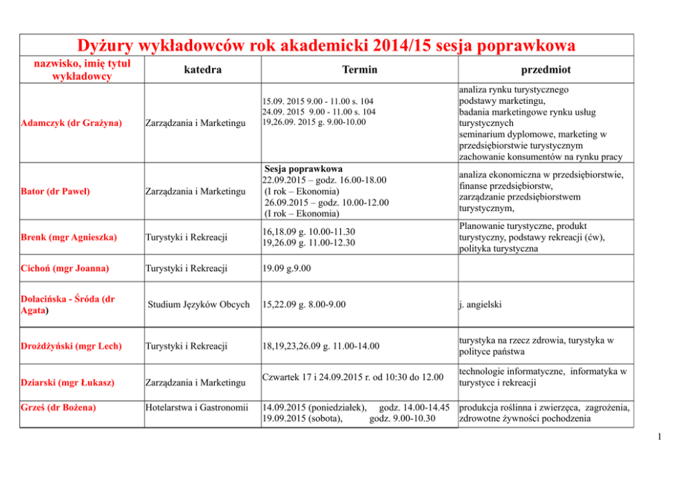 Dyżury wykładowców rok akademicki 2014/15 sesja letnia