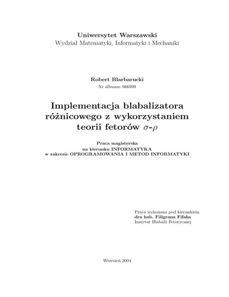 i realizujący go program komputerowy. Ostatni rozdział zawiera przemyślenia dotyczące możliwego wpływu dostępności efektywnej blabalizy numerycznej na rozwój blabalii fetorycznej.