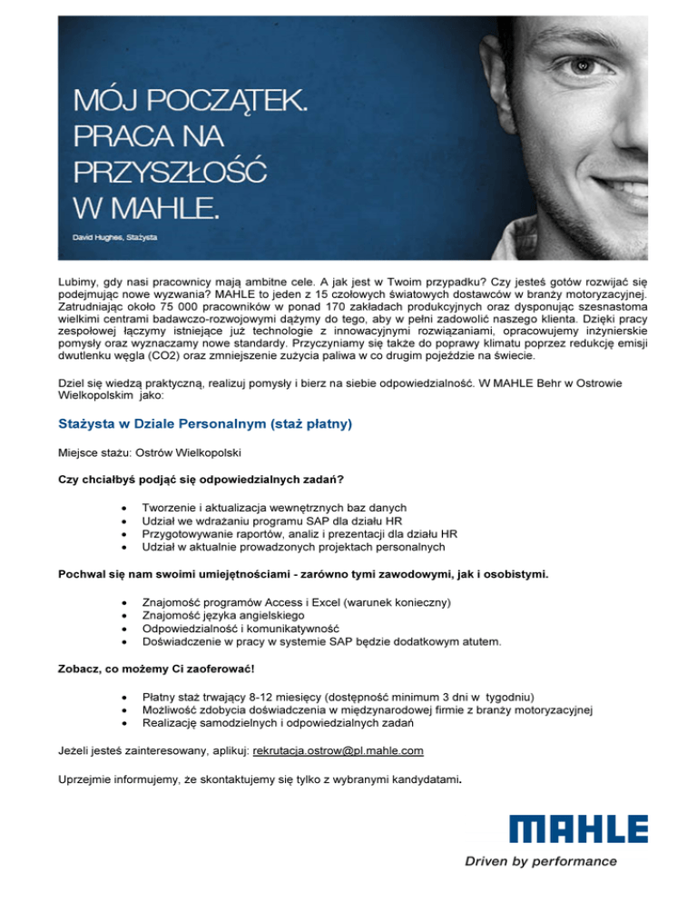 Lubimy, gdy nasi pracownicy mają ambitne cele. A jak jest w Twoim przypadku? Czy jesteś gotów rozwijać się podejmując nowe wyzwania? MAHLE to jeden z 15 czołowych światowych dostawców w branży motoryzacyjnej. Zatrudniając około 75 000 pracowników w ponad 170 zakładach produkcyjnych oraz dysponując szesnastoma wielkimi centrami badawczo-rozwojowymi dążymy do tego, aby w pełni zadowolić naszego klienta. Dzięki pracy zespołowej łączymy istniejące już technologie z innowacyjnymi rozwiązaniami, opracowujemy inżynierskie pomysły oraz wyznaczamy nowe standardy. Przyczyniamy się także do poprawy klimatu poprzez redukcję emisji dwutlenku węgla (CO2) oraz zmniejszenie zużycia paliwa w co drugim pojeździe na świecie. Dziel się wiedzą praktyczną, realizuj pomysły i bierz na siebie odpowiedzialność. W MAHLE Behr w Ostrowie Wielkopolskim jako: Stażysta w Dziale Personalnym (staż płatny) Miejsce stażu: Ostrów Wielkopolski Czy chciałbyś podjąć się odpowiedzialnych zadań? • • • • Tworzenie i aktualizacja wewnętrznych baz danych Udział we wdrażaniu programu SAP dla działu HR Przygotowywanie raportów, analiz i prezentacji dla działu HR Udział w aktualnie prowadzonych projektach personalnych Pochwal się nam swoimi umiejętnościami - zarówno tymi zawodowymi, jak i osobistymi. • • • • Znajomość programów Access i Excel (warunek konieczny) Znajomość języka angielskiego Odpowiedzialność i komunikatywność Doświadczenie w pracy w systemie SAP będzie dodatkowym atutem. Zobacz, co możemy Ci zaoferować! • • • Płatny staż trwający 8-12 miesięcy (dostępność minimum 3 dni w tygodniu) Możliwość zdobycia doświadczenia w międzynarodowej firmie z branży motoryzacyjnej Realizację samodzielnych i odpowiedzialnych zadań Jeżeli jesteś zainteresowany, aplikuj: [email protected] Uprzejmie informujemy, że skontaktujemy się tylko z wybranymi kandydatami.