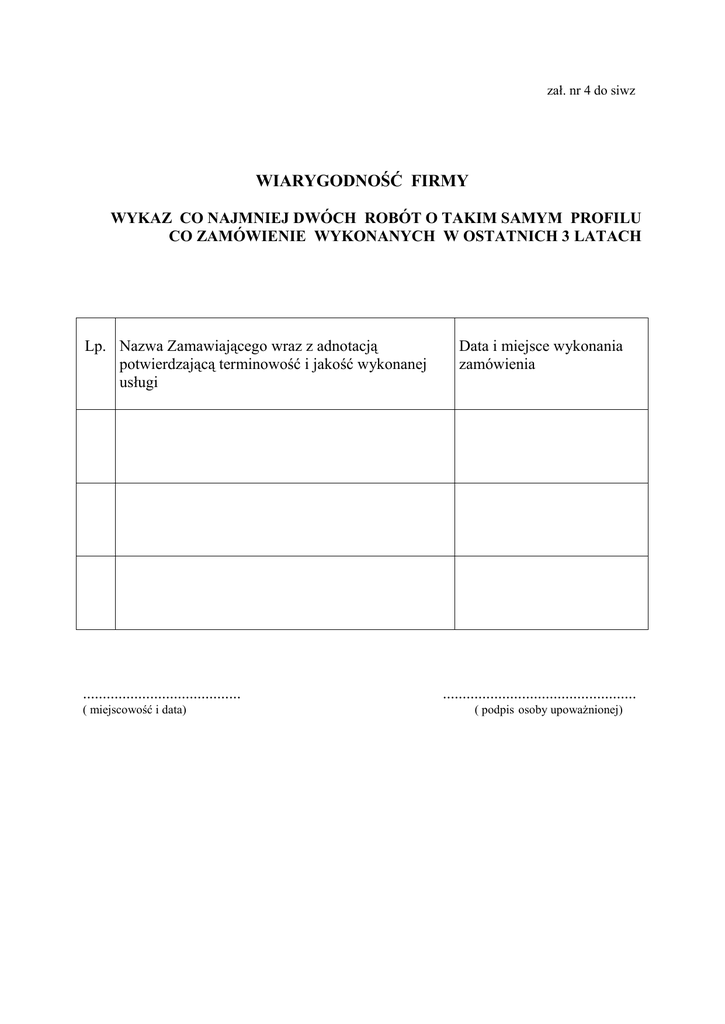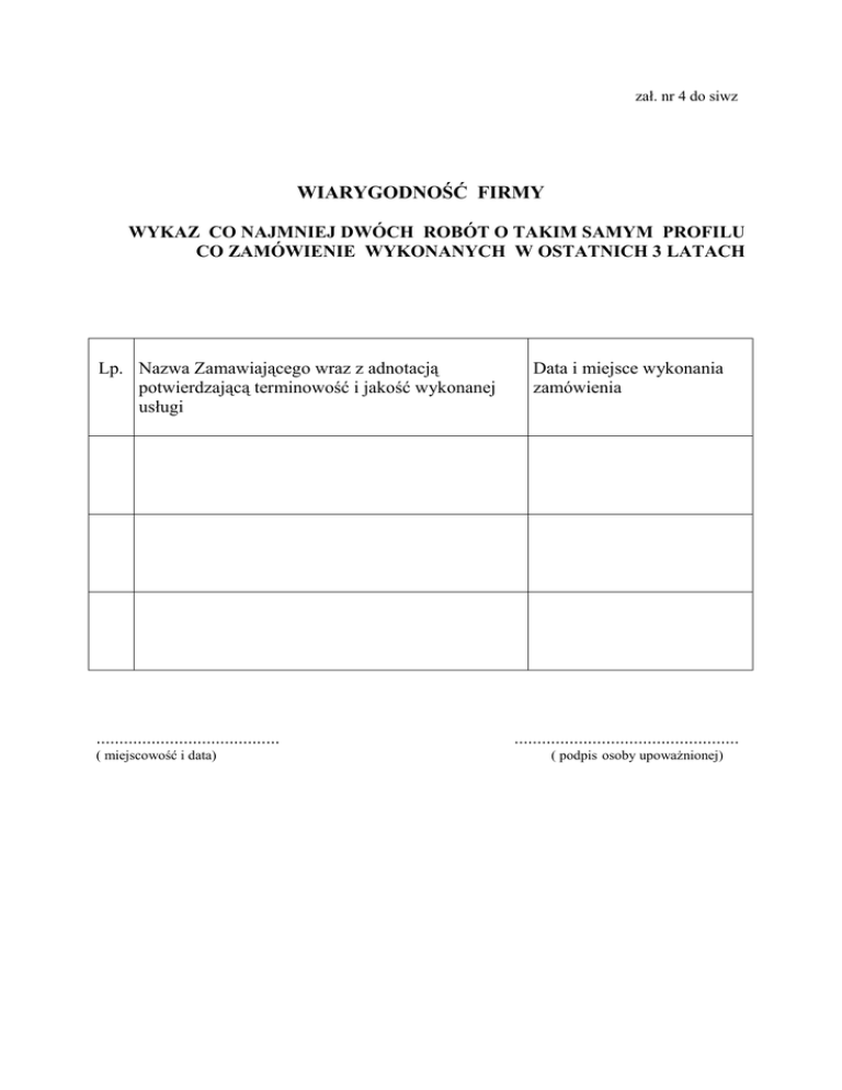 zał. nr 4 do siwz WIARYGODNOŚĆ FIRMY WYKAZ CO NAJMNIEJ DWÓCH ROBÓT O TAKIM SAMYM PROFILU CO ZAMÓWIENIE WYKONANYCH W OSTATNICH 3 LATACH Lp. Nazwa Zamawiającego wraz z adnotacją potwierdzającą terminowość i jakość wykonanej usługi ........................................ ( miejscowość i data) Data i miejsce wykonania zamówienia ................................................. ( podpis osoby upoważnionej)