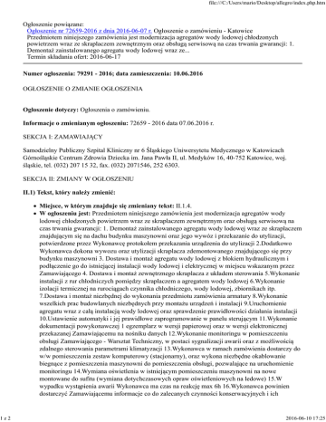 1z2 file:///C:/Users/mario/Desktop/allegro/index.php.htm Ogłoszenie powiązane: Ogłoszenie nr 72659-2016 z dnia 2016-06-07 r. Ogłoszenie o zamówieniu - Katowice Przedmiotem niniejszego zamówienia jest modernizacja agregatów wody lodowej chłodzonych powietrzem wraz ze skraplaczem zewnętrznym oraz obsługą serwisową na czas trwania gwarancji: 1. Demontaż zainstalowanego agregatu wody lodowej wraz ze... Termin składania ofert: 2016-06-17 Numer ogłoszenia: 79291 - 2016; data zamieszczenia: 10.06.2016 OGŁOSZENIE O ZMIANIE OGŁOSZENIA Ogłoszenie dotyczy: Ogłoszenia o zamówieniu. Informacje o zmienianym ogłoszeniu: 72659 - 2016 data 07.06.2016 r. SEKCJA I: ZAMAWIAJĄCY Samodzielny Publiczny Szpital Kliniczny nr 6 Śląskiego Uniwersytetu Medycznego w Katowicach Górnośląskie Centrum Zdrowia Dziecka im. Jana Pawła II, ul. Medyków 16, 40-752 Katowice, woj. śląskie, tel. (032) 207 15 32, fax. (032) 2071546, 252 6303. SEKCJA II: ZMIANY W OGŁOSZENIU II.1) Tekst, który należy zmienić: Miejsce, w którym znajduje się zmieniany tekst: II.1.4. W ogłoszeniu jest: Przedmiotem niniejszego zamówienia jest modernizacja agregatów wody lodowej chłodzonych powietrzem wraz ze skraplaczem zewnętrznym oraz obsługą serwisową na czas trwania gwarancji: 1. Demontaż zainstalowanego agregatu wody lodowej wraz ze skraplaczem znajdującym się na dachu budynku maszynowni oraz jego wywóz i przekazanie do utylizacji, potwierdzone przez Wykonawcę protokołem przekazania urządzenia do utylizacji 2.Dodatkowo Wykonawca dokona wywozu oraz utylizacji skraplacza zdemontowanego znajdującego się przy budynku maszynowni 3. Dostawa i montaż agregatu wody lodowej z blokiem hydraulicznym i podłączenie go do istniejącej instalacji wody lodowej i elektrycznej w miejscu wskazanym przez Zamawiającego 4. Dostawa i montaż zewnętrznego skraplacza z układem sterowania 5.Wykonanie instalacji z rur chłodniczych pomiędzy skraplaczem a agregatem wody lodowej 6.Wykonanie izolacji termicznej na rurociągach czynnika chłodniczego, wody lodowej, zbiornikach itp. 7.Dostawa i montaż niezbędnej do wykonania przedmiotu zamówienia armatury 8.Wykonanie wszelkich prac budowlanych niezbędnych przy montażu urządzeń i instalacji 9.Uruchomienie agregatu wraz z całą instalacją wody lodowej oraz sprawdzenie prawidłowości działania instalacji 10.Ustawienie automatyki i jej prawidłowe zaprogramowanie w panelu sterującym 11.Wykonanie dokumentacji powykonawczej 1 egzemplarz w wersji papierowej oraz w wersji elektronicznej przekazanej Zamawiającemu na nośniku danych 12.Wykonanie monitoringu w pomieszczeniu obsługi Zamawiającego - Warsztat Techniczny, w postaci sygnalizacji awarii oraz z możliwością zdalnego sterowania parametrami klimatyzacji 13.Wykonawca w ramach zamówienia dostarczy do w/w pomieszczenia zestaw komputerowy (stacjonarny), oraz wykona niezbędne okablowanie biegnące z pomieszczenia maszynowni do pomieszczenia obsługi, pozwalające na uruchomienie monitoringu 14.Wymiana oświetlenia w istniejącym pomieszczeniu maszynowni na nowe montowane do sufitu (wymiana dotychczasowych opraw oświetleniowych na ledowe) 15.W wypadku wystąpienia awarii Wykonawca ma czas na reakcję max 6h 16.Wykonawca powinien dostarczyć Zamawiającemu informacje co do zalecanych czynności konserwacyjnych i ich 2016-06-10 17:25 2z2 file:///C:/Users/mario/Desktop/allegro/index.php.htm częstości oraz wykaz zalecanych części zapasowych 17.W centralnym miejscu pomieszczenia maszynowni Wykonawca zawiesi schemat nowych urządzeń w taki sposób, aby obsługa a także BHP miała czytelny przegląd obsługi urządzeń.. W ogłoszeniu powinno być: 2.1 Demontaż zainstalowanego agregatu wody lodowej wraz ze skraplaczem znajdującym się na dachu budynku maszynowni Zamawiającego oraz jego wywóz i przekazanie do utylizacji, potwierdzone przez Wykonawcę protokołem przekazania urządzenia do utylizacji. 2.2 Wywóz oraz utylizacja skraplacza zdemontowanego znajdującego się przy budynku maszynowni Zamawiającego. 2.3 Dostawa i montaż agregatu wody lodowej z blokiem hydraulicznym i podłączenie go do istniejącej instalacji wody lodowej i elektrycznej w miejscu wskazanym przez Zamawiającego. 2.4 Dostawa i montaż w miejscu wskazanym przez Zamawiającego zewnętrznego skraplacza z układem sterowania. 2.5 Wykonanie instalacji z rur chłodniczych pomiędzy skraplaczem a agregatem wody lodowej. 2.6 Wykonanie izolacji termicznej na rurociągach czynnika chłodniczego, wody lodowej, zbiornikach itp. 2.7 Dostawa i montaż niezbędnej do wykonania przedmiotu zamówienia armatury. 2.8 Wykonanie wszelkich prac budowlanych niezbędnych przy montażu urządzeń i instalacji. 2.9 Uruchomienie agregatu wraz z całą instalacją wody lodowej oraz sprawdzenie prawidłowości działania instalacji. 2.10 Ustawienie automatyki i jej prawidłowe zaprogramowanie w panelu sterującym. 2.11 Wykonanie dokumentacji powykonawczej 1 egzemplarz w wersji papierowej oraz w wersji elektronicznej przekazanej Zamawiającemu na nośniku danych. 2.12 Wykonanie monitoringu w pomieszczeniu obsługi/warsztacie technicznym wskazanym przez Zamawiającego, w postaci sygnalizacji awarii z możliwością zdalnego sterowania parametrami klimatyzacji. 2.13 Dostarczenie w ramach przedmiotu umowy do pomieszczenia obsługi/warsztatu technicznego, o którym mowa w pkt 2.12 zestawu komputerowego (stacjonarnego), oraz wykonanie niezbędnego okablowanie biegnącego z pomieszczenia maszynowni Zamawiającego do pomieszczenia obsługi/warsztatu technicznego, pozwalającego na prawidłowe uruchomienie monitoringu. 2.14 Wymiana w ramach przedmiotu umowy oświetlenia w istniejącym pomieszczeniu maszynowni na nowe montowane do sufitu (wymiana dotychczasowych opraw oświetleniowych na ledowe). 2.15 Dostarczenie Zamawiającemu nie budzących wątpliwości informacji co do zalecanych czynności konserwacyjnych i ich częstości oraz wykaz zalecanych części zapasow