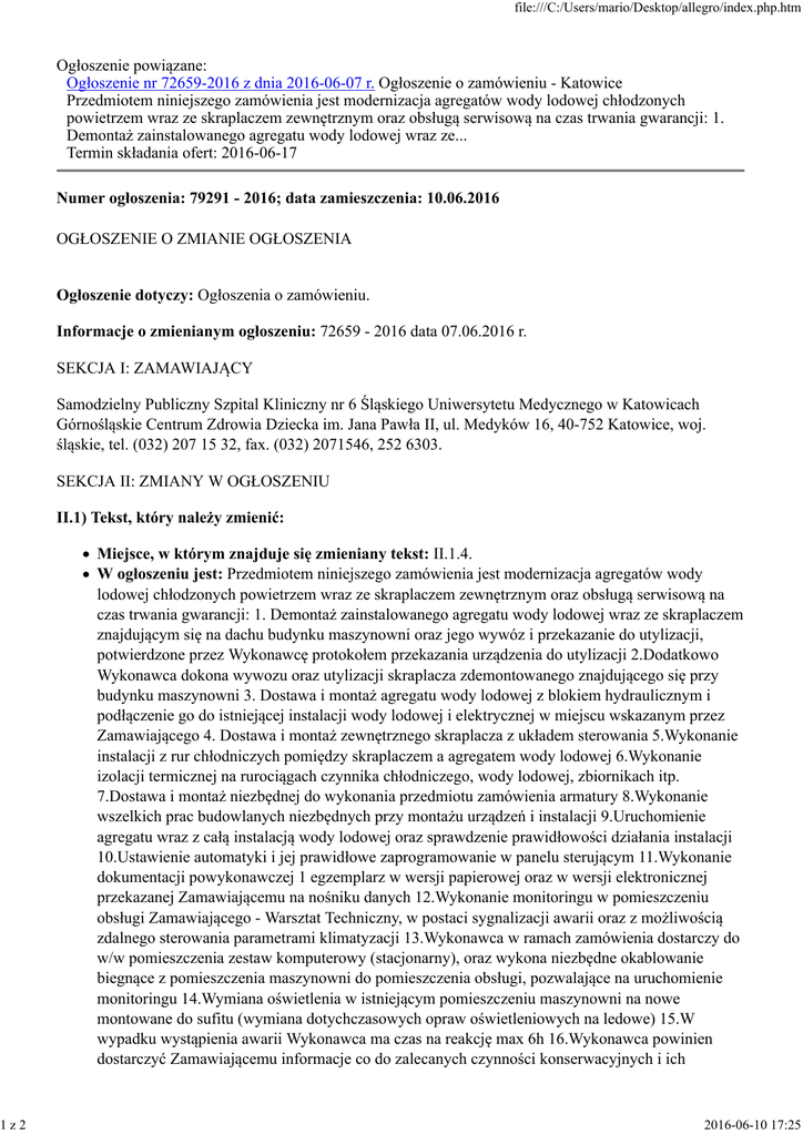Ogłoszenie o zmianie ogłoszenia - 10.06.2016