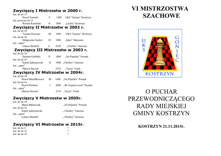 Zwycięzcy I Mistrzostw w 2000 r. kat. do lat 15 Paweł Tomicki kat. powyżej lat 15 Roman Kamiński V 1200 UKS ”Goniec” Kostrzyn II 1800 „Lechia” Kostrzyn VI MISTRZOSTWA SZACHOWE Zwycięzcy II Mistrzostw w 2002 r. kat. do lat 10 Tomasz Krzyżan kat. do lat 16 Małgorzata Szelest kat. „open” Łukasz Bardelli III 1600 UKS ”Goniec” Kostrzyn II+ 1800 „Iskra” Marzenin k 2228 „Chrobry” Gniezno Zwycięzcy III Mistrzostw w 2003 r. kat. do lat 10 Damian Goliński kat. do lat 16 Kamil Jędrzejewski kat. „open” Marcin Steczek II 1800 II 1800 „Chrobry” Gniezno 2332 „Na Pięterku” Poznań „Tęcza” Turek Zwycięzcy IV Mistrzostw w 2004r. kat. do lat 10 Paweł Musiałkiewicz kat. do lat 16 Paweł Piechota kat. „open” Marcin Steczek III 1600 „Na Pięterku” Poznań I 2000 „Bł. Express Lech” Poznań 2318 „Tęcza” Turek Zwycięzcy V Mistrzostw w 2005r. kat. do lat 10 Marta Babiarczuk kat. do lat 16 Kamil Jędrzejewski kat. „open” Łukasz Bardelli „Na Pięterku” Poznań „ Chrobry” Gniezno „ Chrobry” Gniezno Zwycięzcy VI Mistrzostw w 2015r. kat. do lat 8 kat. do lat 12 kat. do lat 18 ? ? ? O PUCHAR PRZEWODNICZĄCEGO RADY MIEJSKIEJ GMINY KOSTRZYN KOSTRZYN 21.11.2015r. miejsca w klasyfikacji generalnej. W grupie najmłodszej wszystkie dzieci otrzymają nagrody pocieszenia. W miarę możliwości sponsorów możliwe jest zwiększenie puli nagród. Termin i miejsce Turniej odbędzie się 21 listopada 2015 r. w sali gimnastycznej Szkoły Podstawowej w Kostrzynie, ul. Piasta 1 Potwierdzenie startu i zapisy 8 30 - 9 45. Rozpoczęcie o godz. 10 00. 11.Zgłoszenia : Zgłoszenia do dnia 18 listopada poprzez formularze zgłoszeniowe na stronie ChessArbiter Do 8 lat - http://www.chessarbiter.com/turnieje/2015/ti_5645/ Do 12 lat - http://www.chessarbiter.com/turnieje/2015/ti_5646/ Do 18 lat - http://www.chessarbiter.com/turnieje/2015/ti_5648/ lub na adres sędziego: [email protected] podając imię, nazwisko, klub, kategorię, ELO, datę urodzenia, grupę startową. Listy startowe będą uaktualniane na stronie www.chessarbiter.com. W dniu zawodów zgłoszenia będą przyjmowane tylko w przypadku wolnych miejsc. Cel imprezy - popularyzacja szachów miłe spędzenie wolnego czasu doskonalenie gry zawodników Kategorie - do lat 8 (rocznik 2007 i młodsi) do 12 lat (rocznik 2006 - 2003) do 18 lat ( rocznik 2002 – 1997) Uwagi Dla wszystkich uczestników przewidziano słodki poczęstunek. Dodatkowych informacji dotyczących turnieju udziela Piotr Smoliński tel. 692 497 651 Organizatorzy Rada Miejska Gminy Kostrzyn UKS „Goniec” Kostrzyn Sponsorzy Warunki uczestnictwa Prawo udziału mają wszyscy chętni po opłaceniu wpisowego w wysokości 20 zł. Zawodnicy UKS „Goniec” Kostrzyn i „UKS Czerlejno” płacą 10 zł. System rozgrywek Turniej zostanie rozegrany systemem szwajcarskim na dystansie 7 rund. Tempo gry 15 minut na partię dla zawodnika. Kojarzenie komputerowe. Obowiązują przepisy Kodeksu Szachowego. Sędzia główny turnieju jest ostateczną instancją odwoławczą przy wszelkich sporach. Nagrody Trzy najlepsze osoby w każdej grupie wiekowej otrzymają medale, dyplomy i nagrody rzeczowe, a zwycięzcy dodatkowo puchar. Nagrodę otrzymuje także najlepsza zawodniczka oraz najlepszy zawodnik i zawodniczka z gminy Kostrzyn, jeśli nie byli wśród wcześniej nagrodzonych – w innym przypadku nagrody przechodzą na dalsze CUKIERNIA - ANDRZEJ PIELAK PIEKARNIA „ BOGIENKA” BANK SPÓŁDZIELCZY w KOSTRZYNIE PIZZERIA „GIOVANNI” BAR – RESTAURACJA „GREYS” KOMPUTEROWE BIURO „KRZYŚKI” „DERFORM” SP.J.
