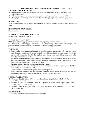 NADANIE DZIECKU NAZWISKA MĘŻA MATKI /ŻONY OJCA I. WYMAGANE DOKUMENTY: 1. Odpis skrócony aktu małżeństwa (o ile strony nie zawierały związku małżeńskiego w USC Pyrzyce). 2. Odpis zupełny aktu urodzenia dziecka, jeżeli został sporządzony w innym USC. 3. Do wglądu: dokumenty tożsamości matki dziecka i jej męża /ojca dziecka i jego żony. II. OPŁATY: 11 zł. – opłata skarbowa za sporządzenie protokołu nadania dziecku nazwiska męża matki/żony ojca. III. TERMIN ODPOWIEDZI: Niezwłocznie. IV. JEDNOSTKA ODPOWIEDZIALNA: Urząd Stanu Cywilnego (USC). V. TRYB ODWOŁAWCZY: Od decyzji, odmawiającej dokonania czynności, wydanej przez Kierownika USC w Pyrzycach, przysługuje odwołanie do Wojewody Zachodniopomorskiego, pośrednictwem kierownika USC, w terminie 14 dni od dnia jej doręczenia. za VI. UWAGI: 1. Jeżeli matka małoletniego dziecka zawarła małżeństwo z mężczyzną, który nie jest ojcem tego dziecka, małżonkowie mogą złożyć przed kierownikiem urzędu stanu cywilnego zgodne oświadczenia, że dziecko będzie nosić takie samo nazwisko, jakie nosi albo nosiłoby ich wspólne dziecko. 2. Nadanie dziecku nazwiska męża matki nie jest dopuszczalne, jeżeli nosi ono nazwisko ojca albo nazwisko utworzone na podstawie zgodnych oświadczeń rodziców dziecka przez połączenie nazwiska matki z nazwiskiem ojca. Dziecku można również nadać nazwisko żony ojca. 3. Oświadczenie o nadaniu dziecku nazwiska małżonka/i, można złożyć przed każdym kierownikiem USC na terenie RP. 4. Oświadczenie takie muszą złożyć małżonkowie wspólnie. 5. Jeżeli dziecko, któremu ma być nadane nazwisko męża matki ukończyło lat 13, do ważności tej czynności potrzebna jest jego zgoda wyrażona osobiście. PODSTAWA PRAWNA: 1. Ustawa z dnia 25 lutego 1964 r.- kodeks rodzinny i opiekuńczy (Dz.U. Nr 9 z 1964 r. , poz. 59 z późn. zm.). 2. Ustawa z dnia 29 września 1986 r. - prawo o aktach stanu cywilnego (Dz.U. z 2004 r. Nr 161, poz. 1688). 3. Ustawa z dnia 16 listopada 2006 r. o opłacie skarbowej (tekst jednolity: Dz.U. z 2006 r. Nr 225, poz. 1635.). ZAŁĄCZNIKI: 1. Wniosek o nadanie dziecku nazwiska męża matki. .