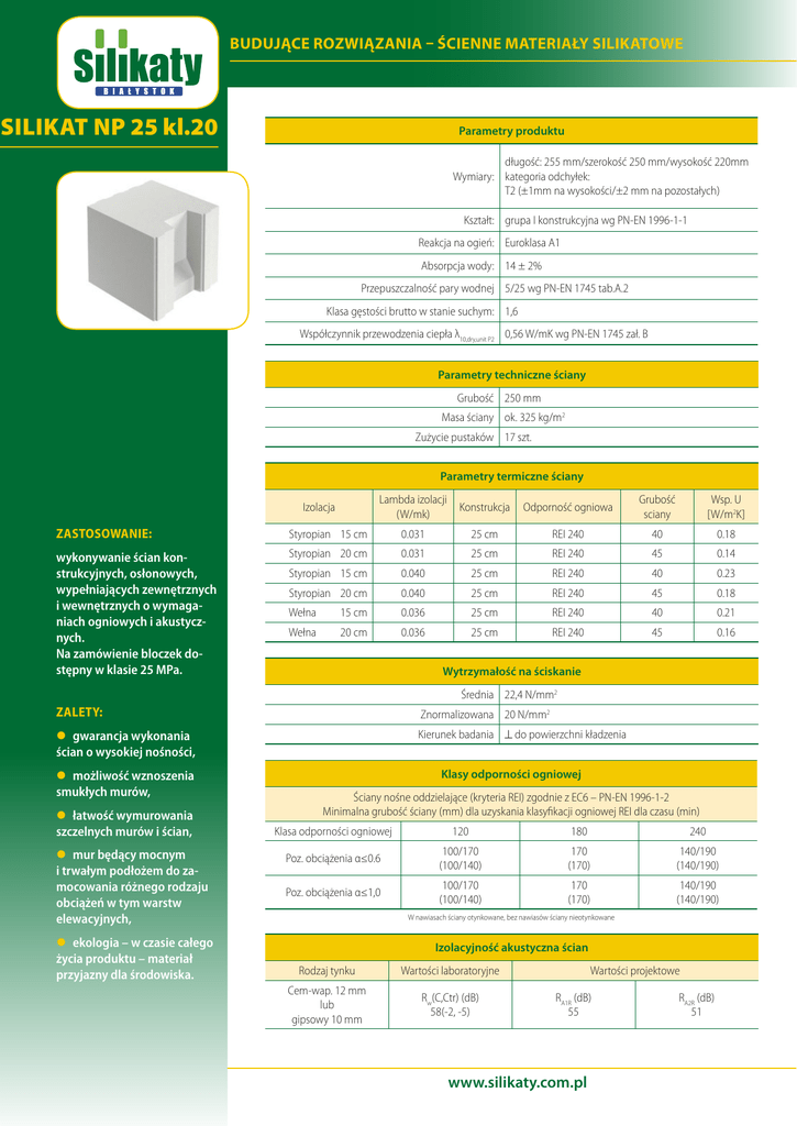 Budujące rozwiązania – Ścienne materiały silikatowe SILIKAT NP 25 kl.20 Parametry produktu długość: 255 mm/szerokość 250 mm/wysokość 220mm Wymiary: kategoria odchyłek: T2 (±1mm na wysokości/±2 mm na pozostałych) Kształt: grupa I konstrukcyjna wg PN-EN 1996-1-1 Reakcja na ogień: Euroklasa A1 Absorpcja wody: 14 ± 2% Przepuszczalność pary wodnej 5/25 wg PN-EN 1745 tab.A.2 Klasa gęstości brutto w stanie suchym: 1,6 Współczynnik przewodzenia ciepła λ10,dry,unit P2 0,56 W/mK wg PN-EN 1745 zał. B Parametry techniczne ściany Grubość 250 mm Masa ściany ok. 325 kg/m2 Zużycie pustaków 17 szt. Parametry termiczne ściany Izolacja Lambda izolacji (W/mk) Konstrukcja Odporność ogniowa Grubość sciany Wsp. U [W/m2K] Zastosowanie: Styropian 15 cm 0.031 25 cm REI 240 40 0.18 wykonywanie ścian konstrukcyjnych, osłonowych, wypełniających zewnętrznych i wewnętrznych o wymaganiach ogniowych i akustycznych. Na zamówienie bloczek dostępny w klasie 25 MPa. Styropian 20 cm 0.031 25 cm REI 240 45 0.14 Styropian 15 cm 0.040 25 cm REI 240 40 0.23 Styropian 20 cm 0.040 25 cm REI 240 45 0.18 Wełna 15 cm 0.036 25 cm REI 240 40 0.21 Wełna 20 cm 0.036 25 cm REI 240 45 0.16 Wytrzymałość na ściskanie Średnia 22,4 N/mm2 Zalety: Znormalizowana 20 N/mm2 zz gwarancja wykonania ścian o wysokiej nośności, Kierunek badania ^ do powierzchni kładzenia zz możliwość wznoszenia smukłych murów, zz łatwość wymurowania szczelnych murów i ścian, zz mur będący mocnym i trwałym podłożem do zamocowania różnego rodzaju obciążeń w tym warstw elewacyjnych, zz ekologia – w czasie całego życia produktu – materiał przyjazny dla środowiska. Klasy odporności ogniowej Ściany nośne oddzielające (kryteria REI) zgodnie z EC6 – PN-EN 1996-1-2 Minimalna grubość ściany (mm) dla uzyskania klasyfikacji ogniowej REI dla czasu (min) Klasa odporności ogniowej 120 180 240 Poz. obciążenia α≤0.6 100/170 (100/140) 170 (170) 140/190 (140/190) Poz. obciążenia α≤1,0 100/170 (100/140) 170 (170) 140/190 (140/190) W nawiasach ściany otynkowane, bez nawiasów ściany nieotynkowane Izolacyjność akustyczna ścian Rodzaj tynku Wartości laboratoryjne Cem-wap. 12 mm lub gipsowy 10 mm Rw(C,Ctr) (dB) 58(-2, -5) Wartości projektowe RA1R (dB) 55 www.silikaty.com.pl RA2R (dB) 51 Budujące rozwiązania – Ścienne materiały silikatowe Produkty uzupełniające SILIKAT PW24/25 kl.15 /250x240x220/ – pustak wentylacyjny do wykonywania pionów wentylacyjnych ø16 Zaprawa do silikatu biała do murowania na cienką spoinę (od 1-3 mm) ścian konstrukcyjnych i działowych wewnątrz i na zewnątrz budynków , klasa ≥ 10 MPa. Zaprawa murarska – nadaje się do murowania kondygnacji nadziemnych. Grubość spoiny wykonanej z zaprawy murarskiej powinna wynosić od 6 do 40mm. Można jej używać wewnątrz i na zewnątrz budynków. Zaprawa jest mrozoodporna i wodoodporna, klasa ≥ 5 MPa. Łącznik K1, K2 – połączeń murów z konstrukcją żelbetową lub z istniejącym murem, a także do połączeń murów wykonanych z elementów o różnym module wysokości. Łącznik D1, D2 – Odpowiedniki łączników K1, K2 stosowanych w miejscach, gdzie konieczne jest zachowanie dylatacji między łączonymi elementami. Łącznik D1, D2 – Odpowiedniki łączników K1, K2 stosowanych w miejscach, gdzie konieczne jest zachowanie dylatacji między łączonymi elementami. Elementy do połączeń murów Łącznik DS, DS2 – do połączeń ścian wypełniających ze stropem z zachowaniem dylatacji. Łącznik D3 – do połączeń fragmentów murów z zachowaniem dylatacji pionowej. Łącznik P30 – do połączeń między ścianami z elementów o tym samym module wysokości (np. ściany działowe ze ścianami nośnymi). Zastępuje przewiązania murarskie między ścianami. Kielnie do zaprawy cienkowarstwowej Dozowniki do zaprawy cienkowarstwowej www.silikaty.com.pl