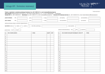 Usługa VIP - formularz rezerwacji * proszę zaznaczyć x Prosimy o wypełnienie i przesłanie poniższego formularza: fax +48 12 639 34 15, e-mail: [email protected] adres pocztowy: Międzynarodowy Port Lotniczy im. Jana Pawła II Kraków-Balice Sp. z o.o., ul. Kpt. M. Medweckiego 1, 32-083 Balice Terminal VIP: tel. +48 12 639 33 04 Rezerwacje: fax +48 12 639 34 15, e-mail: [email protected] Kierownik VIP & Business Services: tel. +48 12 639 33 54, e-mail: [email protected] przylot do Krakowa: data godz. nr rejsu port wylotowy port przesiadkowy odlot z Krakowa: data godz. nr rejsu port przesiadkowy port docelowy preferencje dotyczące miejsca w samolocie /niegwarantowane/ typ samolotu: rejsowy rządowy podróż lotnicza NIE* lp. TAK * imię i nazwisko pasażera prywatny znaki statku powietrznego nazwa operatora spotkanie handlowe/konferencja funkcja przylot* odlot* lp. 1. 1. 2. 2. 3. 3. 4. 4. 5. 5. 6. 6. 7. 7. 8. 8. 9. 9. 10. 10. 11. 11. 12. 12. 13. 13. 14. 14. 15. 15. 16. 16. 17. 17. 18. 18. 19. 19. 20. 20. TAK* NIE* w godzinach imię i nazwisko innych gości korzystających z salonu VIP funkcja Usługa VIP - formularz rezerwacji ** proszę zaznaczyć x korzystanie z parkingu VIP lp. marka i nr rejestracyjny pojazdu imię i nazwisko kierowcy korzystanie z dywanu/zawieszenie flag (flagi są dostarczane przez Zamawiającego) 1. 2. wjazd na płytę lotniska: 3. kolumna rządowa 4. 5. inny uprawniony pojazd: marka i nr rejestracyjny 6. 7. 8. zamówienie usługi gastronomicznej - opłata zgodna z rachunkiem zewnętrznego dostawcy MPL Services Sp. z o.o. 9. 10. imię i nazwisko osoby do kontaktów roboczych TAK** NIE** nr telefonu forma płatności: gotówka w PLN karta kredytowa przelew (dotyczy urzędów i instytucji) dane do wystawienia faktury VAT: Niniejszym akceptuję "Zasady korzystania z usługi VIP w Kraków Airport dostępne na stronie internetowej www.krakowairport.pl. TAK** pełna nazwa Niniejszym akceptuję "Zasady korzystania z usługi VIP w Kraków Airport przez delegacje rządowe” dostępne na stronie internetowej www.krakowairport.pl. TAK** adres NIP Wyrażam zgodę na przetwarzanie moich danych osobowych przez spółkę Międzynarodowy Port Lotniczy Kraków-Balice im. Jana Pawła II Sp. z o.o. z siedzibą w Balicach (32-083), ul. Kpt. M. Medweckiego 1 jako administratora danych osobowych, dla celów związanych z wykonaniem umowy. Oświadczam, iż podaję swoje dane dobrowolnie oraz zostałem (am) poinformowany(a) o celu zbierania tych danych, prawie dostępu do treści swoich danych oraz możliwości ich poprawiania (zgodnie z ustawą z dnia 29 sierpnia 1997 r. o ochronie danych osobowych (t. j. Dz. U. z 2002 r. nr 101, poz. 926 z póżn. zm.). adres do korespondencji W przypadku gdy Zleceniodawca składa zamówienie na usługę VIP w imieniu innych osób - zobowiązany jest do ich powiadomienia o fakcie zamówienia usługi VIP. imię i nazwisko oraz podpis osoby sporządzającej zgłoszenie uwagi