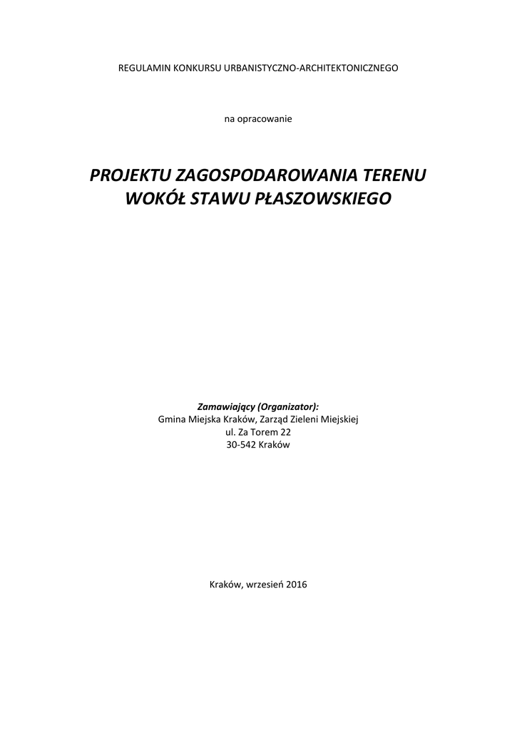 REGULAMIN KONKURSU URBANISTYCZNO-ARCHITEKTONICZNEGO na opracowanie PROJEKTU ZAGOSPODAROWANIA TERENU WOKÓŁ STAWU PŁASZOWSKIEGO Zamawiający (Organizator): Gmina Miejska Kraków, Zarząd Zieleni Miejskiej ul. Za Torem 22 30-542 Kraków Kraków, wrzesień 2016 1. INFORMACJE I POSTANOWIENIA OGÓLNE 1.1. Nazwa i adres organizatora oraz współorganizatora konkursu, patronaty 1.1.1. Zamawiającym (Organizatorem konkursu) jest: Gmina Miejska Kraków, Zarząd Zieleni Miejskiej w Krakowie ul. Za Torem 22 30-542 Kraków adres biura i adres do korespondencji: ul. Reymonta 20 30-059 Kraków tel. +48 12 341 85 14 1.1.2. Współorganizatorem konkursu jest: Instytut Architektury Krajobrazu, Wydział Architektury Politechniki Krakowskiej im. Tadeusza Kościuszki ul. Warszawska 24, 31 – 155 Kraków. 1.1.3. Osobą uprawnioną do kontaktów z uczestnikami konkursu jest Iwona KluzaWąsik (tel. 12 341 85 84, e-mail: [email protected]). Czynności zastrzeżone dla kierownika zamawiającego wykonuje Piotr Kempf, Gmina Miejska Kraków, Zarząd Zieleni Miejskiej w Krakowie 1.1.4. Konkurs został objęty honorowym patronatem Małopolskiego Oddziału Stowarzyszenia Polskich Architektów Krajobrazu: Oddział Małopolski Stowarzyszenia Polskich Architektów Krajobrazu ul. Warszawska 24 Adres: 31-155 Kraków Prezes: dr inż. Przemysław Kowalski 1.2. Sposób porozumiewania się z uczestnikami konkursu, sposób udzielania wyjaśnień do regulaminu 1.2.1. Wszelką korespondencję przesyłaną pocztą tradycyjną bądź elektroniczną związaną z konkursem należy kierować na adres: Zarząd Zieleni Miejskiej w Krakowie ul. W. Reymonta 20 30-059 Kraków e-mail: [email protected] na kopercie (w przypadku korespondencji przesyłanej pocztą) oraz w tytule wiadomości e-mail należy zamieścić oznaczenie: „Konkurs – Staw Płaszowski 2016” 1.2.2. W trosce o sprawną obsługę, zamawiający zachęca uczestników konkursu do przesyłania korespondencji pocztą elektroniczną z wyłączeniem wskazanych w regulaminie dokumentów wymaganych do przedkładania wyłącznie w formie pisemnej. 1.2.3. Wszelkie informacje dotyczące konkursu, a w tym: − regulamin wraz z załącznikami, − ewentualne zmiany regulaminu i zmiany dotyczące załączników, − niektóre terminy konkursu (oznaczone w regulaminie jako terminy do określenia później), − zapytania uczestników dotyczące regulaminu oraz odpowiedzi na te zapytania, − inne dodatkowe informacje, publikowane będą na stronie internetowej zamawiającego: www.zzm.krakow.pl w zakładce aktualności. 1.2.4. Ponadto organizator – o ile zajdzie taka potrzeba – będzie przekazywał wyjaśnienia oraz informacje pisemnie lub pocztą elektroniczną. 1.2.5. Uczestnicy konkursu mogą zwracać się pisemnie lub pocztą elektroniczną do organizatora o wyjaśnienie postanowień niniejszego regulaminu na adresy wymienione w pkt. 1.2.1. 1.2.6. Odpowiedzi zostaną udzielone w terminie określonym regulaminem pod warunkiem, że zapytania wpłyną w terminie oznaczonym w regulaminie. W przypadku gdy zapytanie wpłynie po upływie terminu określonego w pkt. 1.9., lub jego treść w sensie merytorycznym będzie zgodna z pytaniami na które wcześniej udzielono odpowiedzi, organizator konkursu może udzielić wyjaśnień albo pozostawić takie zapytanie bez rozpatrzenia. 1.2.7. Sposób udzielenia odpowiedzi – zgodnie z pkt. 1.2.3. oraz 1.2.4. 1.2.8. Organizator nie będzie ujawniał źródeł zapytań. 1.2.9. Odpowiedzi udzielone przez organizatora są wiążące dla wszystkich uczestników konkursu. 1.2.10. Pytania i odpowiedzi przekazane / udzielone ustnie lub telefonicznie są nieważne. 1.2.11. Wszelkie informacje, komunikaty, odpowiedzi na pytania, materiały konkursowe i wszelka inna korespondencja elektroniczna z uczestnikami konkursu – będą wysyłane wyłącznie z adresu e-mail wskazanego w pkt. 1.2.1., pod rygorem nieważności. 1.3. Podstawa prawna konkursu Podstawami prawnymi konkursu są w szczególności: − Ustawa z dn. 23 kwietnia 1963r. Kodeks cywilny (tj. Dz.U. z 2016 r. poz. 380 z późn. zm.); − Ustawa z dn. 4 lutego 1994r. o prawie autorskim i prawach pokrewnych (tj. Dz.U. z 2016 r., poz. 666 z późn. zm.); − Miejscowy plan zagospodarowania przestrzennego obszaru „Płaszowska-Krzywda” – Uchwała nr XXXIII/412/11 Rady Miasta Krakowa z dnia 7 grudnia 2011 r. ogłoszona w Dzienniku Urzędowym Województwa Małopolskiego nr 597, poz. 7027 z dn. 20 grudnia 2011 r. - Miejscowy plan zagospodarowania przestrzennego obszaru "ZABŁOCIE" - UCHWAŁA NR CXIII/1156/06 Rady Miasta Krakowa z dnia 28 czerwca 2006 r. w sprawie uchwalenia miejscowego planu zagospodarowania przestrzennego obszaru ogłoszona w Dzienniku Urzędowym Województwa Małopolskiego nr 559, poz. 3534 z dnia 19 września 2006 r. − Ustawa z dn. 7 lipca 1994r. Prawo budowlane (t.j. Dz. U. z 2016 r. poz. 290 z późn. zm.). - Ustawa z dn. 16 kwietnia 2004 r. o ochronie przyrody (t.j. Dz. U. 2004 nr 92 poz. 880). - Ustawa z dn. 27 kwietnia 2001 r. Prawo ochrony środowiska ( t.j. Dz. U. 2001 nr 62 poz 627). - Ustawa z dn. 18 lipca 2001 r. Prawo wodne ( t.j. Dz. U. 2001 nr 115 poz. 1229). 1.4. Forma konkursu 1.4.1. Konkurs jest konkursem studialnym, jednoetapowym, w którym w terminie określonym niniejszym regulaminem, zamawiający zaprasza do składania prac konkursowych wszystkich uczestników konkursu. 1.4.2. Konkurs jest ogólnopolski, prowadzony jest w języku polskim. Prace konkursowe oraz wszelkie składane przez uczestników konkursu informacje, wnioski, zawiadomienia, oświadczenia i dokumenty winny być składane w języku polskim. 1.4.3. Załączniki do regulaminu konkursu podzielone zostały na dwie grupy: − załączniki formalne (oznaczone literą „F” przed numerem załącznika), stanowiące wzory dokumentów wymaganych w konkursie (do użytku uczestników stosownie do wymagań określonych w niniejszym regulaminie); − załączniki merytoryczne (oznaczone literą 