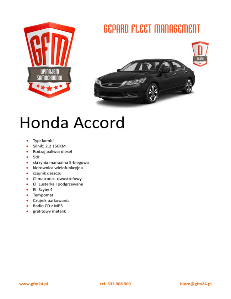Honda Accord • • • • • • • • • • • • • • Typ: kombi Silnik: 2.2 150KM Rodzaj paliwa: diesel 5dr skrzynia manualna 5-biegowa kierownica wielofunkcyjna czujnik deszczu Climatronic- dwustrefowy El. Lusterka I podgrzewane El. Szyby 4 Tempomat Czujnik parkowania Radio CD z MP3 grafitowy metalik www.gfm24.pl tel. 533 908 909 [email protected]