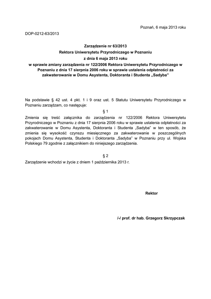 Zarządzenie Rektora nr 63_13 w sprawie zmiany zarządzenia nr