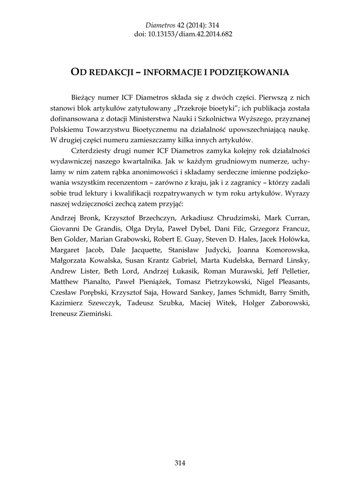 Diametros 42 (2014): 314 doi: 10.13153/diam.42.2014.682 OD REDAKCJI – INFORMACJE I PODZIĘKOWANIA Bieżący numer ICF Diametros składa się z dwóch części. Pierwszą z nich stanowi blok artykułów zatytułowany „Przekroje bioetyki”; ich publikacja została dofinansowana z dotacji Ministerstwa Nauki i Szkolnictwa Wyższego, przyznanej Polskiemu Towarzystwu Bioetycznemu na działalność upowszechniającą naukę. W drugiej części numeru zamieszczamy kilka innych artykułów. Czterdziesty drugi numer ICF Diametros zamyka kolejny rok działalności wydawniczej naszego kwartalnika. Jak w każdym grudniowym numerze, uchylamy w nim zatem rąbka anonimowości i składamy serdeczne imienne podziękowania wszystkim recenzentom – zarówno z kraju, jak i z zagranicy – którzy zadali sobie trud lektury i kwalifikacji rozpatrywanych w tym roku artykułów. Wyrazy naszej wdzięczności zechcą zatem przyjąć: Andrzej Bronk, Krzysztof Brzechczyn, Arkadiusz Chrudzimski, Mark Curran, Giovanni De Grandis, Olga Dryla, Paweł Dybel, Dani Filc, Grzegorz Francuz, Ben Golder, Marian Grabowski, Robert E. Guay, Steven D. Hales, Jacek Hołówka, Margaret Jacob, Dale Jacquette, Stanisław Judycki, Joanna Komorowska, Małgorzata Kowalska, Susan Krantz Gabriel, Marta Kudelska, Bernard Linsky, Andrew Lister, Beth Lord, Andrzej Łukasik, Roman Murawski, Jeff Pelletier, Matthew Pianalto, Paweł Pieniążek, Tomasz Pietrzykowski, Nigel Pleasants, Czesław Porębski, Krzysztof Saja, Howard Sankey, James Schmidt, Barry Smith, Kazimierz Szewczyk, Tadeusz Szubka, Maciej Witek, Holger Zaborowski, Ireneusz Ziemiński. 314