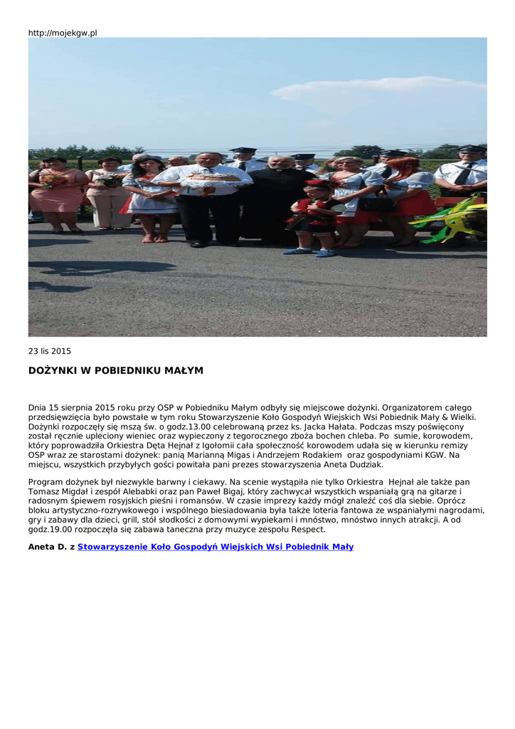 http://mojekgw.pl 23 lis 2015 DOŻYNKI W POBIEDNIKU MAŁYM Dnia 15 sierpnia 2015 roku przy OSP w Pobiedniku Małym odbyły się miejscowe dożynki. Organizatorem całego przedsięwzięcia było powstałe w tym roku Stowarzyszenie Koło Gospodyń Wiejskich Wsi Pobiednik Mały & Wielki. Dożynki rozpoczęły się mszą św. o godz.13.00 celebrowaną przez ks. Jacka Hałata. Podczas mszy poświęcony został ręcznie upleciony wieniec oraz wypieczony z tegorocznego zboża bochen chleba. Po sumie, korowodem, który poprowadziła Orkiestra Dęta Hejnał z Igołomii cała społeczność korowodem udała się w kierunku remizy OSP wraz ze starostami dożynek: panią Marianną Migas i Andrzejem Rodakiem oraz gospodyniami KGW. Na miejscu, wszystkich przybyłych gości powitała pani prezes stowarzyszenia Aneta Dudziak. Program dożynek był niezwykle barwny i ciekawy. Na scenie wystąpiła nie tylko Orkiestra Hejnał ale także pan Tomasz Migdał i zespół Alebabki oraz pan Paweł Bigaj, który zachwycał wszystkich wspaniałą grą na gitarze i radosnym śpiewem rosyjskich pieśni i romansów. W czasie imprezy każdy mógł znaleźć coś dla siebie. Oprócz bloku artystyczno-rozrywkowego i wspólnego biesiadowania była także loteria fantowa ze wspaniałymi nagrodami, gry i zabawy dla dzieci, grill, stół słodkości z domowymi wypiekami i mnóstwo, mnóstwo innych atrakcji. A od godz.19.00 rozpoczęła się zabawa taneczna przy muzyce zespołu Respect. Aneta D. z Stowarzyszenie Koło Gospodyń Wiejskich Wsi Pobiednik Mały