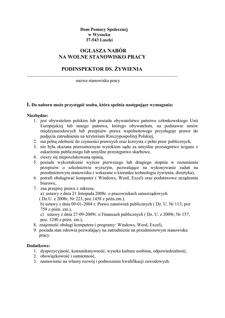 Dom Pomocy Społecznej w Wysocku 37-543 Laszki OGŁASZA NABÓR NA WOLNE STANOWISKO PRACY PODINSPEKTOR DS. ŻYWIENIA .................................................................................................................. nazwa stanowiska pracy I. Do naboru może przystąpić osoba, która spełnia następujące wymagania: Niezbędne: 1. jest obywatelem polskim lub posiada obywatelstwo państwa członkowskiego Unii Europejskiej lub innego państwa, którego obywatelom, na podstawie umów międzynarodowych lub przepisów prawa wspólnotowego przysługuje prawo do podjęcia zatrudnienia na terytorium Rzeczypospolitej Polskiej, 2. ma pełną zdolność do czynności prawnych oraz korzysta z pełni praw publicznych, 3. nie była skazana prawomocnym wyrokiem sądu za umyślne przestępstwo ścigane z oskarżenia publicznego lub umyślne przestępstwo skarbowe, 4. cieszy się nieposzlakowaną opinią, 5. posiada wykształcenie wyższe pierwszego lub drugiego stopnia w rozumieniu przepisów o szkolnictwie wyższym, pozwalające na wykonywanie zadań na przedmiotowym stanowisku ( wskazane o kierunku technologia żywienia, dietetyka), 6. potrafi obsługiwać komputer ( Windows, Word, Excel) oraz podstawowe urządzenia biurowe, 7. zna przepisy prawa z zakresu; a) ustawy z dnia 21 listopada 2008r. o pracownikach samorządowych ( Dz.U. z 2008r, Nr 223, poz.1458 z późn.zm.), b) ustawy z dnia 09-01-2004 r. Prawo zamówień publicznych ( Dz. U. Nr 113; poz 759 z późn. zm.), c) ustawy z dnia 27-09-2009r. o Finansach publicznych ( Dz. U. z 2009r, Nr 157, poz. 1240 z późn. zm.), 8. znajomość obsługi komputera ( programy: Windows, Word, Excel), 9. posiada stan zdrowia pozwalający na zatrudnienie na przedmiotowym stanowisku pracy. Dodatkowe: 1. dyspozycyjność, komunikatywność, wysoka kultura osobista, odpowiedzialność, 2. obowiązkowość i sumienność, 3. nastawienie na własny rozwój i podnoszenie kwalifikacji zawodowych. II. Zakres wykonywanych zadań na stanowisku: 1. Opracowywanie jadłospisów zgodnie z obowiązującymi normami żywieniowymi z uwzględnieniem diet osób starszych zalecanych przez Instytut Żywności i Żywienia 2. Prowadzenie dokumentacji dotyczącej żywienia mieszkańców oraz obliczanie kosztów żywienia 3. Zaopatrywanie Domu w artykuły żywnościowe zgodnie z zawartymi umowami oraz bieżące zaopatrywanie jednostki w materiały i sprzęt wyposażeniowy na podstawie zatwierdzonych zapotrzebowań 4. Sporządzanie zapotrzebowania na artykuły żywnościowe i ich wycena 5. Współpraca z pracownikami kuchni oraz pełnienie nadzoru nad przygotowywaniem posiłków zgodnie z normami 6. Obsługa programów komputerowych firmy Arisco: " Planowanie Zamówień Publicznych", " Diety" 7. Pełnienie zastępstwa magazyniera w czasie jego nieobecności 8. Udział w przygotowywaniu i organizowaniu przetargów na dostawę towarów i usług zgodnie z obowiązującymi przepisami o zamówieniach publicznych 9. Wykonywanie innych prac zleconych przez dyrektora czy kierownika działu niezbędnych dla zapewnienia prawidłowego funkcjonowania jednostki III. Warunki pracy na stanowisku: 1. praca w budynku Domu Pomocy Społecznej w Wysocku, 2. praca przy komputerze o charakterze administracyjno - biurowym, 3. praca od poniedziałku do piątku w godzinach od 7:00 do 15:00. IV. W miesiącu. lutym 2013r. ( tj. miesiącu poprzedzającym datę upublicznienia niniejszego ogłoszenia), wskaźnik zatrudnienia osób niepełnosprawnych w Domu Pomocy Społecznej w Wysocku, w rozumieniu przepisów o rehabilitacji zawodowej i społecznej oraz zatrudnianiu osób niepełnosprawnych, był niższy niż 6%. V. 1. 2. 3. 4. 5. 6. 7. Wymagane dokumenty: podpisany własnoręcznie list motywacyjny, podpisany własnoręcznie życiorys - CV wypełniony kwestionariusz osobowy dla osoby ubiegającej się o zatrudnienie, kopie dokumentów potwierdzających kwalifikacje zawodowe, wymagane do wykonywania oferowanej pracy, kopie świadectw pracy z poprzednich miejsc pracy lub inne dokumenty potwierdzające okresy zatrudnienia, obejmujące okresy pracy przypadające w roku kalendarzowym, w którym kandydat ubiega się o zatrudnienie, osoba ubiegająca się o zatrudnienie może dodatkowo przedłożyć kopie dokumentów potwierdzających jej umiejętności i osiągnięcia zawodowe, świadectw pracy z poprzednich miejsc pracy lub zaświadczenia potwierdzające okresy zatrudnienia, obejmujące okresy pracy przypadające w innym roku kalendarzowym niż rok, w którym kandydat ubiega się o zatrudnienie oraz dokumenty stanowiące podstawę do korzystania ze szczególnych uprawnień w zakresie stosunku pracy, referencje z poprzednich miejsc pracy, opinie ( jeżeli kandydat takie posiada) 8. oświadczenie kandydata złożone pod odpowiedzialnością karną o niekaralności za umyślne przestępstwo ścigane z oskarżenia publicznego lub umyślne przestępstwo skarbowe, 9. oświadczenie kandydata o posiadaniu pełnej zdolności do czynności prawnych i korzystaniu z pełni praw publicznych, 10. oświadczenie kandydata o braku przeciwwskazań zdrowotnych do wykonywania pracy na danym stanowisku urzędniczym, 11. oświadczenie kandydata o wyrażeniu zgody na przetwarzanie danych osobowych do celów rekrutacji, 12. oświadczenie kandydata o posiadaniu obywatelstwa polskiego, ( nie dotyczy osób ubiegających się o zatrudnienie na zasadach wskazanych w art. 11 ust.2 i ust.3 ustawy z dnia 21 listopada 2008r. o pracownikach samorządowych, które przedstawiają kopie właściwych dokumentów tożsamości i karty pobytu oraz zaświadczenia o znajomości języka polskiego wskazane w cytowanej ustawie), 13. w przypadku, gdy kandydatem jest osoba niepełnosprawna - kopia dokumentu potwierdzającego niepełnosprawność. Wymagane dokumenty aplikacyjne należy składać w zaklejonej kopercie w Sekretariacie Domu Pomocy Społecznej w Wysocku w godzinach pracy lub pocztą na adres Domu Pomocy Społecznej w Wysocku ( decyduje data w