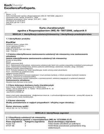 Strona 1 z 13 Karta charakterystyki zgodna z Rozporządzeniem (WE) Nr 1907/2006, załącznik II Opracowano dnia / wersja: 24.09.2013 / 0006 Zastępuje opracowanie z dnia / wersja: 19.01.2011 / 0005 Obowiązuje od: 24.09.2013 Data druku pdf: 06.11.2013 KocKlar Karta charakterystyki zgodna z Rozporządzeniem (WE) Nr 1907/2006, załącznik II SEKCJA 1: Identyfikacja substancji/mieszaniny i identyfikacja przedsiębiorstwa 1.1 Identyfikator produktu KocKlar Nadtlenek wodoru, roztwór 35% Numer rejestracji (ECHA): -Index: 008-003-00-9 EINECS, ELINCS, NLP: 231-765-0 CAS: 7722-84-1 1.2 Istotne zidentyfikowane zastosowania substancji lub mieszaniny oraz zastosowania odradzane Istotne zidentyfikowane zastosowania substancji lub mieszaniny: Środek do dezynfekcji Biocyd Sektor zastosowań [SU]: SU 3 - Zastosowania przemysłowe: zastosowania substancji jako takich lub w postaci preparatów w obiektach przemysłowych SU22 - Zastosowania profesjonalne: domena publiczna (administracja, szkolnictwo, rozrywka, usługi, rzemiosło) Kategoria produktu chemicznego [PC]: PC 8 - Produkty biobójcze (np. środki dezynfekcyjne, środki ochrony przed szkodnikami) PC37 - Chemikalia do uzdatniania wody Kategoria procesu [PROC]: PROC 4 - Zastosowanie w procesie wsadowym i innym procesie (synteza), w którym powstaje mozliwość narażenia Kategoria uwalniania do środowiska [ERC]: ERC 8b - Zastosowanie szeroko rozproszone, w pomieszczeniach, substancji reagujących w systemach otwartych Zastosowania odradzane: Aktualnie brak informacji na ten temat. 1.3 Dane dotyczące dostawcy karty charakterystyki Koch-Chemie GmbH, Einsteinstrasse 42, D-59423 Unna Telefon: +49 (0) 2303/9 86 70 - 0, Telefax: +49 (0) 2303/9 86 70 - 26 [email protected] www.KOCH-CHEMIE.de Adres e-mail osoby odpowiedzialnej: [email protected], [email protected] - proszę NIE używać do wysyłania próśb o karty charakterystyki. 1.4 Numer alarmowy Służby powiadamiane w nagłych przypadkach / oficjalny organ doradczy : --- Numer alarmowy spółki: +49 (0) 700 / 24 112 112 (KCC) SEKCJA 2: Identyfikacja zagrożeń 2.1 Klasyfikacja substancji lub mieszaniny 2.1.1 Klasyfikacja zgodnie z rozporządzeniem (WE) Nr 1272/2008 (CLP) Klasa zagrożenia Kategoria zagrożenia Zwrot określający zagrożenie Acute Tox. 4 H302-Działa szkodliwie po połknięciu. STOT SE 3 H335-Może powodować podrażnienie dróg oddechowych. Strona 2 z 13 Karta charakterystyki zgodna z Rozporządzeniem (WE) Nr 1907/2006, załącznik II Opracowano dnia / wersja: 24.09.2013 / 0006 Zastępuje opracowanie z dnia / wersja: 19.01.2011 / 0005 Obowiązuje od: 24.09.2013 Data druku pdf: 06.11.2013 KocKlar Skin Irrit. Eye Dam. Met. Corr. 2 1 1 H315-Działa drażniąco na skórę. H318-Powoduje poważne uszkodzenie oczu. H290-Może powodować korozję metali. 2.1.2 Klasyfikacja zgodnie z dyrektywami 67/548/EWG oraz 1999/45/WE (łącznie ze zmianami) Xn, Produkt szkodliwy, R22 Xi, Produkt drażniący, R37/38 Xi, Produkt drażniący, R41 2.2 Elementy oznakowania 2.2.1 Oznakowanie zgodnie z rozporządzeniem (WE) Nr 1272/2008 (CLP) Nadtlenek wodoru, roztwór 7722-84-1, Index:008-003-00-9 EC: 231-765-0 Niebezpieczeństwo Zwrot określający zagrożenie H302-Działa szkodliwie po połknięciu. H335-Może powodować podrażnienie dróg oddechowych. H315-Działa drażniąco na skórę. H318-Powoduje poważne uszkodzenie oczu. H290-Może powodować korozję metali. Zapobieganie P261-Unikać wdychania pary. P271-Stosować wyłącznie na zewnątrz lub w dobrze wentylowanym pomieszczeniu P280-Stosować rękawice ochronne/odzież ochronną oraz ochronę oczu/twarzy. Reagowanie P301+P312-W PRZYPADKU POŁKNIĘCIA: w przypadku złego samopoczucia skontaktować się z OŚRODKIEM ZATRUĆ/lekarzem. P302+P352-W PRZYPADKU KONTAKTU ZE SKÓRĄ: umyć dużą ilością wody z mydłem. P304+P340-W PRZYPADKU DOSTANIA SIĘ DO DRÓG ODDECHOWYCH: wyprowadzić lub wynieść poszkodowanego na świe?e powietrze i zapewnić mu warunki do swobodnego oddychania. P305+P351+P338-W PRZYPADKU DOSTANIA SIĘ DO OCZU: Ostrożnie płukać wodą przez kilka minut. Wyjąć soczewki kontaktowe, jeżeli są i można je łatwo usunąć. Nadal płukać. P310-Natychmiast skontaktować się z OŚRODKIEM ZATRUĆ/lekarzem. P390-Usunąć wyciek, aby zapobiec szkodom materialnym. Przechowywanie P403+P233-Przechowywać w dobrze wentylowanym miejscu. Przechowywać pojemnik szczelnie zamknięty. Usuwanie P501-Zawartość pojemnika jak i pojemnik utylizować zgodnie z lokalnymi, regionalnymi, narodowymi oraz międzynarodowymi przepisami. 2.3 Inne zagrożenia Brak substancji vPvB Brak substancji PBT Niska Wartość pH może uszkadzać wody. SEKCJA 3: Skład/informacja o składnikach 3.1 Substancja Nadtlenek wodoru, roztwór Numer rejestracji (REACH) Index -008-003-00-9 Strona 3 z 13 Karta charakterystyki zgodna z Rozporządzeniem (WE) Nr 1907/2006, załącznik II Opracowano dnia / wersja: 24.09.2013 / 0006 Zastępuje opracowanie z dnia / wersja: 19.01.2011 / 0005 Obowiązuje od: 24.09.2013 Data druku pdf: 06.11.2013 KocKlar EINECS, ELINCS, NLP CAS Stęż.% Klasyfikacja zgodnie z dyrektywą 67/548/EWG Klasyfikacja zgodnie z rozporządzeniem (WE) Nr 1272/2008 (CLP) 231-765-0 CAS 7722-84-1 35 R5 Produkt utleniający, O, R8 Produkt szkodliwy, Xn, R20/22 Produkt żrący, C, R35 Ox. Liq. 1, H271 Acute Tox. 4, H332 Acute Tox. 4, H302 Skin Corr. 1A, H314 3.2 Mieszanina n.s. Tekst formuł R i H, a także ich kod klasyfikacji (GHS/CLP) patrz sekcja 16. SEKCJA 4: Środki pierwszej pomocy 4.1 Opis środków pierwszej pomocy Drogi oddechowe Osobę usunąć z zagrożonej strefy. Osobie zapewnić dopływ świeżego powietrza, w zależności od objawów skonsultować się z lekarzem. W przypadku utraty przytomności poszkodowanego położyć w stabilnej pozycji bocznej i bezzwłocznie zasięgnąć porady lekarskiej. Kontakt ze skórą Umyć dużą ilością wody, zanieczyszczone, nasączone ubranie niezwłocznie usunąć, natychmiast wezwać lekarza, mieć przy sobi