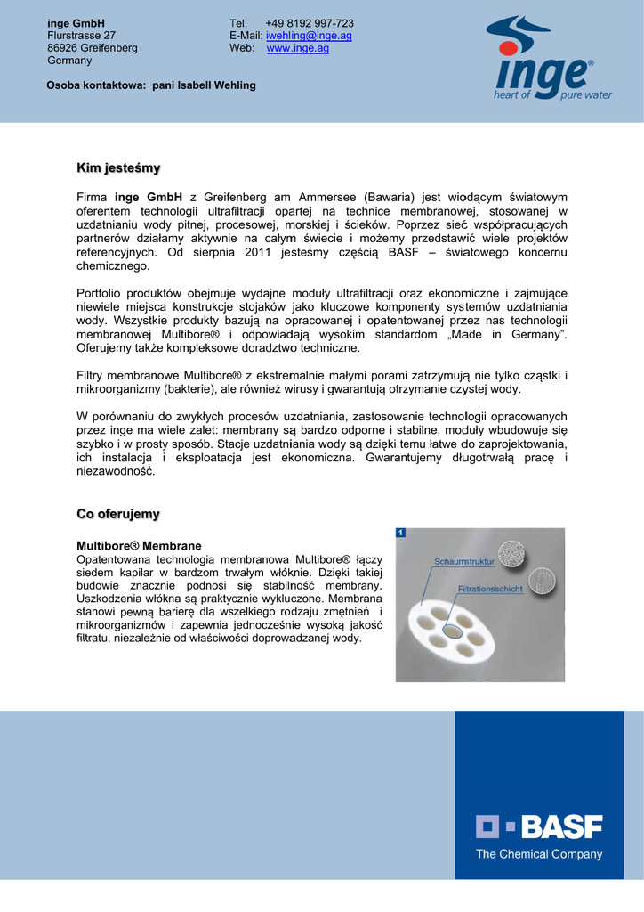 ing ge GmbH Flu urstrasse 27 86 6926 Greifenberg Ge ermany Tel. T +49 8 8192 997-723 3 E-Mail: E iwehl [email protected] g Web: W www .inge.ag Os soba kontak ktowa: pani Isabell Weh hling Kim jes steśmy Firma iinge GmbH z Greife enberg am Ammerse ee (Bawaria a) jest wioodącym św wiatowym oferente em techno ologii ultraffiltracji opa artej na technice t membranow m wej, stosow wanej w uzdatnia aniu wody pitnej, procesowej, m morskiej i ścieków. ś Po oprzez siećć współprac cujących partneró ów działam my aktywnie e na całym m świecie i możemy przedstaw wić wiele projektów referenccyjnych. Od O sierpnia a 2011 je steśmy cz zęścią BAS SF – świaatowego koncernu k chemiczznego. Portfolio o produktów w obejmuje e wydajne moduły ulttrafiltracji orraz ekonom miczne i za ajmujące stojaków jako kluczo niewiele e miejsca konstrukcje k owe kompo onenty systtemów uzd datniania wody. W Wszystkie produkty p ba azują na o opracowane ej i opatentowanej przzez nas tec chnologii membra anowej Mu ultibore® i odpowiad dają wysok kim standa ardom „Maade in Ge ermany”. Oferujemy także ko ompleksowe e doradztwo o techniczn ne. Filtry membranowe e Multibore® z ekstrem malnie mały ymi porami zatrzymująą nie tylko cząstki i mikroorrganizmy (bakterie), ale e również w wirusy i gwarantują otrz zymanie czyystej wody. wnaniu do zwykłych procesów W porów p uzzdatniania, zastosowa anie technollogii opraco owanych przez in nge ma wie ele zalet: membrany są ą bardzo od dporne i sta abilne, modduły wbudowuje się szybko i w prosty sposób. s Sta acje uzdatniiania wody są dzięki te emu łatwe ddo zaprojektowania, ich insstalacja i eksploatacjja jest ekkonomiczna a. Gwarantujemy dłuugotrwałą pracę i niezawo odność. Co ofe erujemy ore® Memb brane Multibo Opatenttowana tech hnologia me embranowa Multibore® ® łączy siedem kapilar w bardzom trw wałym włókknie. Dzięki takiej e znacznie e podnosi się stabiln mbrany. budowie ność mem Uszkodzzenia włókna są praktyc cznie wyklu czone. Mem mbrana stanowi pewną barrierę dla ws szelkiego ro dzaju zmętn nień i ganizmów i zapewnia jednocześn nie wysoką jakość mikroorg filtratu, n niezależnie od o właściwo ości doprowa adzanej wod dy. Moduły y dizzer® Kompakktowa i wysok kowydajna ultrafilttracja. w Zoptymalizowany, hydro-d dynamicznyy design połącze eniu z wysoką wydajno ością uzdatn niania membrany Multiborre® powod dują, że dizzer® możże uchodz zić za wzorzecc technolog gii ultrafiltrac cji. T-Rack® ® Oszczędność mie ejsca i zwiększenie e efektywnośc ci: TRack® jest ultrakkompaktowy ym system mem stojaków o budowie e modułow wej. Dzięk ki integraccji dopływów i odpływó ów w pokryywach końcowych mo odułów zna acznie zmniejssza się powierzchnia konieczna a do ustaw wienia konstrukcji. System Des sign (iSD) inge S iSD je est innowaccyjnym oprrogramowa aniem przez znaczonym do projekktowania urządzeń u ultrafilttracyjnych. Serwis s przed- i posprzedaż p żowy inge offeruje komp pleksowe do oradztwo te echniczne i wsparcie, począwszy p ood fazy planowania instala acji poprzez uruchomienie aż do o ptymalizacjji procesu eksploatacji.. Więcejj informacjji o firmie e i oferow wanych pro oduktach znajdą z Paaństwo na stronie www.in nge.ag. Kogo p poszukujem my ujemy biur inżynieryjnyych z własn nym działem m projektow wania, wyko onawców W Polscce poszuku instalaccji uzdatnian nia wody (planowanie ( e/wykonaws stwo dla firrm komunaalnych i prz zemysłu, woda p pitna i/lub ścieki, ś woda a morska), którzy byliby zaintere esowani naaszymi prod duktami. Poszukujemy też kontaktów k z firmami u uzdatniający ymi wodę dla d elektrow wni, wydoby ycia ropy czy proccesów Fraccking. H · Flurstraße 27 · 86926 Greifenberg · Germa any inge GmbH Phone +49 9 8192 997-700 · Fax +49 8192 2 997-999 · info [email protected] · www w.inge.ag Managing Board: Bruno Steis S (CEO), Dr. Peter Berg, Da aniela Calleri gister: Amtsgericcht Augsburg · HRB H 23537 · VA AT DE213269940 Trade Reg