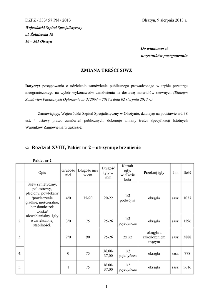 DZPZ / 333/ 57 PN / 2013 Olsztyn, 9 sierpnia 2013 r. Wojewódzki Szpital Specjalistyczny ul. Żołnierska 18 10 – 561 Olsztyn Do wiadomości uczestników postępowania ZMIANA TREŚCI SIWZ Dotyczy: postępowania o udzielenie zamówienia publicznego prowadzonego w trybie przetargu nieograniczonego na wybór wykonawców zamówienia na dostawę materiałów szewnych (Biuletyn Zamówień Publicznych Ogłoszenie nr 312064 – 2013 z dnia 02 sierpnia 2013 r.). Zamawiający, Wojewódzki Szpital Specjalistyczny w Olsztynie, działając na podstawie art. 38 ust. 4 ustawy prawo zamówień publicznych, dokonuje zmiany treści Specyfikacji Istotnych Warunków Zamówienia w zakresie: • Rozdział XVIII, Pakiet nr 2 – otrzymuje brzmienie Pakiet nr 2 Opis Szew syntetyczny, poliestrowy, pleciony, powlekany /powleczenie gładkie, nieścieralne, bez domieszek wosku/ niewchłanialny. Igły o zwiększonej stabilności. Grubość Długość nici nici w cm Długość igły w mm Kształt igły, wielkość koła Przekrój igły J.m Ilość 4/0 75-90 20-22 1/2 podwójna okrągła sasz. 1037 3/0 75 25-26 1/2 pojedyńcza okrągła sasz. 1296 3. 2/0 90 25-26 2x1/2 okrągła z zakończeniem tnącym sasz. 3888 4. 0 75 36,0037,00 1/2 pojedyńcza okrągła sasz. 778 5. 1 75 36,0037,00 1/2 pojedyńcza okrągła sasz. 5616 1. 2. 1 DZPZ / 333/ 57 PN / 2013 6. 3/0 7. 0 8. 2/0 9. 2/0 10. 2/0 11. 2/0 Olsztyn, 9 sierpnia 2013 r. 10 lub 12x60,0075,00 5 lub 6x60,0075,00 bez igły sasz. 778 bez igły sasz. 778 Szt. 2768 Szt. 4709 Szt. 1166 Szt. 518 Szew zastawkowy , igła podwójna, 1/2 koła, tapercut z podkładką teflonową 675,00-90,00 7x3x1,5 mm, nić w kolorze białym i kolorowym, min 8 szwów w op 16-17 mm Szew zastawkowy, igła podwójna , 1/2 koła, tapercut z podkładką teflonową 675-90 7x3x1,5mm, nić w kolorze białym i kolorowym, min 8 szwów w op, 25-26 mm Szew zastawkowy, igła podwójna , 1/2 koła, tapercut z podkładką teflonową 675-90 7x3x1,5mm, nić w kolorze białym i kolorowym, 2 lub 4 szwy w op. 25-26mm Szew zastawkowy, igła podwójna, 1/2 koła tapercut z podkładką teflonową 6- 7x3x1,5 75-90 mm, nić w kolorze białym i kolorowym, 2 lub 4 szwy w op. 16-17 mm Zamawiający dopuszcza tolerancję rozmiaru igieł w zakresie +_ 5% oraz długość nici w zakresie +_10% DYREKTOR WOJEWÓDZKIEGO SZPITALA SPECJALISTYCZNEGO W OLSZTYNIE Irena Kierzkowska ( Podpis osoby uprawnionej ) 2
