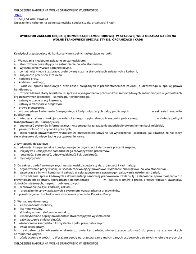 OGŁOSZENIE NABORU NA WOLNE STANOWISKO W JEDNOSTCE XML TREŚĆ JEST ARCHIWALNA Ogłoszenie o naborze na wolne stanowisko specjalisty ds. organizacji i kadr. DYREKTOR ZAKŁADU MIEJSKIEJ KOMUNIKACJI SAMOCHODOWEJ W STALOWEJ WOLI OGŁASZA NABÓR NA WOLNE STANOWISKO SPECJALISTY DS. ORGANIZACJI I KADR Kandydaci przystępujący do konkursu winni spełnić następujące warunki: 1. Wymagania niezbędne związane ze stanowiskiem: a. stan zdrowia pozwalający na zatrudnienie na w/w stanowisku, b. wykształcenie wyższe administracyjne, c. co najmniej 4 letni staż pracy, preferowany staż na stanowiskach związanych z kadrami, d. znajomość przepisów z zakresu : • kodeksu pracy, • kodeksu cywilnego, • kodeksu spółek handlowych oraz zasad związanych z przekształceniem zakładu budżetowego w spółkę prawa handlowego, • rozporządzenia Rady Ministrów w sprawie wynagradzania pracowników samorządowych zatrudnionych w jednostkach organizacyjnych jednostek samorządu terytorialnego, • ustawy o czasie pracy kierowcy, • ustawy o transporcie drogowym, • prawo przewozowe, • rozporządzeń Parlamentu Europejskiego i Rady dotyczących usług publicznych w zakresie transportu publicznego, • wiedza z zakresu funkcjonowania lokalnego i regionalnego transportu publicznego w świetle polityki transportowej Unii Europejskiej, e. znajomość systemów informatycznych wspomagania zarządzania przedsiębiorstwem komunikacji miejskiej, f. pełna zdolność do czynności prawnych, g. niekaralność prawomocnym wyrokiem za przestępstwo umyślne lub wykroczenie skarbowe, jak również, że nie toczy się w stosunku do niego żadne postępowanie karne. 2.Wymagania dodatkowe a. zdolności interpersonalne i predyspozycje do organizacji i kierowania pracami zespołu, b. inicjatywa i umiejętność samodzielnego rozwiązywania problemów, c. rzetelność, sumienność, odpowiedzialność i skrupulatność, d. dyspozycyjność 3. Do zakresu zadań wykonywanych na stanowisku specjalisty ds. organizacji i kadr należy: a. organizowanie pracy własnej w sposób zapewniający prawidłowe wykonanie obowiązków na w/w stanowisku, b. współpraca z innymi komórkami zakładu w celu zapewnienia sprawnego realizowania nałożonych zadań, c. prowadzenie spraw kadrowych i dokumentacji osobowej pracowników zakładu tj.: załatwianie spraw związanych z przyjmowaniem do pracy, sporządzanie dokumentacji w zakresie: umów o pracę, przeszeregowań, awansów, dodatków stażowych, nagród jubileuszowych, d. realizowanie polityki kadrowej zakładu, e. prowadzenie spraw związanych z systemem wynagradzania pracowników, f. przestrzeganie i kontrolowanie stosowania przepisów Kodeksu Pracy, 3. Wymagane dokumenty: a. kwestionariusz osobowy, b. list motywacyjny, c. aktualny numer telefonu do kontaktu, d. uwierzytelnione odpisy dokumentów stwierdzających wykształcenie, e. zaświadczenie o niekaralności, f. oświadczenie kandydata o korzystaniu z pełni praw publicznych, g. świadectwa pracy, h. aktualne zaświadczenie o stanie zdrowia kandydata, stwierdzające zdolność do pracy na stanowiskach administracyjnych, i. oświadczenie o treści : „ Wyrażam zgodę na przetwarzanie moich danych osobowych zawartych w ofercie pracy dla OGŁOSZENIE NABORU NA WOLNE STANOWISKO W JEDNOSTCE OGŁOSZENIE NABORU NA WOLNE STANOWISKO W JEDNOSTCE potrzeb niezbędnych do realizacji procesu rekrutacji zgodnie z ustawą z dnia 29.08.1997r, o ochronie danych osobowych ( Dz. U z 2002r. nr 101, poz.926 z późn. zmianami) oraz ustawą z dnia 21 listopada 2008r. o pracownikach samorządowych (Dz. U. Nr 223, poz. 1458). 4. Oferty powinny być składane osobiście w siedzibie Zakładu w sekretariacie w godz. 7.00 – 15.00 lub przesyłane listem poleconym na adres Zakładu Miejskiej Komunikacji Samochodowej, ul. Komunalna 3, 37-450 Stalowa Wola w terminie do dnia 30.08.2010 r. do godz. 15.00. w zamkniętej kopercie z adresem kandydata, numerem telefonu i z dopiskiem „nabór na wolne stanowisko specjalisty ds. organizacji i kadr”. W przypadku przesłania ofert pocztą decyduje czas doręczenia. 5. Zgłoszenia zostaną otwarte w dniu 31.08.2010r. o godz. 12.00 w siedzibie Zakładu. 6. Rozmowy kwalifikacyjne zostaną przeprowadzone w siedzibie Zakładu, do 06.09.2010r., o dokładnym terminie kandydaci zostaną powiadomieni telefonicznie co najmniej 3 dni przed terminem rozmowy. 7. Zgłoszenia kandydatów nie spełniające wymogów określonych w ogłoszeniu o postępowaniu kwalifikacyjnym oraz złożone po terminie określonym do ich przyjmowania nie będą podlegać rozpatrzeniu, a kandydaci nie wezmą udziału w postępowaniu kwalifikacyjnym. Kwestionariusz osobowy można uzyskać w Zakładzie Miejskiej Komunikacji Samochodowej w Stalowej Woli, pokój nr 11 (sekretariat) lub na stronie internetowej www.bip-stalowawola.e-zet.pl Lista kandydatów, którzy spełnili wymagania formalne postępowania rekrutacyjnego zostanie upowszechniona w BIP na stronie internetowej i na tablicy ogłoszeń ZMKS. UWAGA Komisja zastrzega sobie prawo nieskorzystania z oferty bez podania przyczyny. Z udziału w konkursie wyłączone są osoby, które w poprzednich miejscach pracy zostały odwołane ze stanowiska lub stosunek pracy został rozwiązany z przyczyn dyscyplinarnych. Podmiot publikujący Urząd Miasta Stalowa Wola Wytworzył Andrzej Szlęzak - Prezydent Miasta 2010-08-16 Publikujący - OGŁOSZENIE NABORU NA WOLNE STANOWISKO W JEDNOSTCE