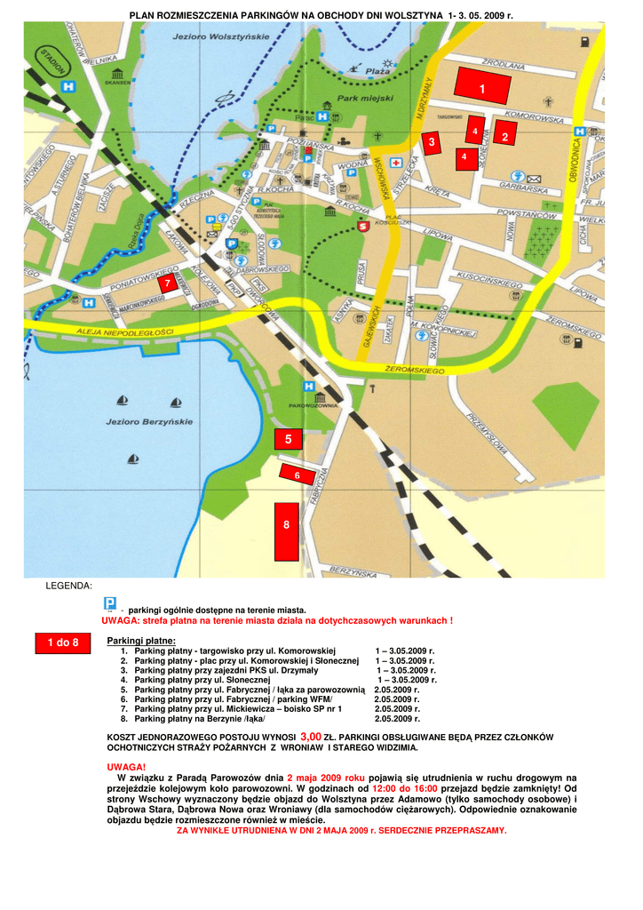 PLAN ROZMIESZCZENIA PARKINGÓW NA OBCHODY DNI WOLSZTYNA 1- 3. 05. 2009 r. 1 4 3 2 4 7 5 6 8 LEGENDA: - parkingi ogólnie dostępne na terenie miasta. UWAGA: strefa płatna na terenie miasta działa na dotychczasowych warunkach ! 1 do 8 Parkingi płatne: 1. 2. 3. 4. 5. 6. 7. 8. Parking płatny - targowisko przy ul. Komorowskiej Parking płatny - plac przy ul. Komorowskiej i Słonecznej Parking płatny przy zajezdni PKS ul. Drzymały Parking płatny przy ul. Słonecznej Parking płatny przy ul. Fabrycznej / łąka za parowozownią Parking płatny przy ul. Fabrycznej / parking WFM/ Parking płatny przy ul. Mickiewicza – boisko SP nr 1 Parking płatny na Berzynie /łąka/ 1 – 3.05.2009 r. 1 – 3.05.2009 r. 1 – 3.05.2009 r. 1 – 3.05.2009 r. 2.05.2009 r. 2.05.2009 r. 2.05.2009 r. 2.05.2009 r. KOSZT JEDNORAZOWEGO POSTOJU WYNOSI 3,00 ZŁ. PARKINGI OBSŁUGIWANE BĘDĄ PRZEZ CZŁONKÓW OCHOTNICZYCH STRAŻY POŻARNYCH Z WRONIAW I STAREGO WIDZIMIA. UWAGA! W związku z Paradą Parowozów dnia 2 maja 2009 roku pojawią się utrudnienia w ruchu drogowym na przejeździe kolejowym koło parowozowni. W godzinach od 12:00 do 16:00 przejazd będzie zamknięty! Od strony Wschowy wyznaczony będzie objazd do Wolsztyna przez Adamowo (tylko samochody osobowe) i Dąbrowa Stara, Dąbrowa Nowa oraz Wroniawy (dla samochodów ciężarowych). Odpowiednie oznakowanie objazdu będzie rozmieszczone również w mieście. ZA WYNIKŁE UTRUDNIENA W DNI 2 MAJA 2009 r. SERDECZNIE PRZEPRASZAMY.