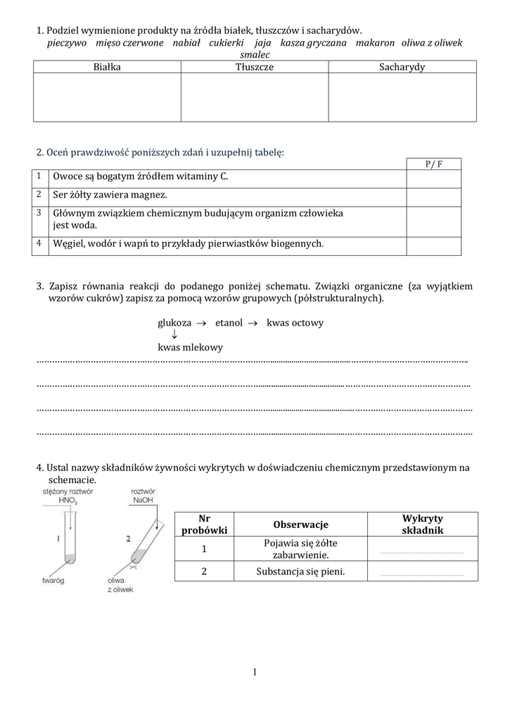 1. Podziel wymienione produkty na źródła białek, tłuszczów i sacharydów. pieczywo mięso czerwone nabiał cukierki jaja kasza gryczana makaron oliwa z oliwek smalec Białka Tłuszcze Sacharydy 2. Oceń prawdziwość poniższych zdań i uzupełnij tabelę: P/ F 1 Owoce są bogatym źródłem witaminy C. 2 Ser żółty zawiera magnez. 3 Głównym związkiem chemicznym budującym organizm człowieka jest woda. 4 Węgiel, wodór i wapń to przykłady pierwiastków biogennych. 3. Zapisz równania reakcji do podanego poniżej schematu. Związki organiczne (za wyjątkiem wzorów cukrów) zapisz za pomocą wzorów grupowych (półstrukturalnych). glukoza etanol kwas octowy kwas mlekowy ……………………………………………………………………………….......................................………………………………………. ……………………………………………………………………………........................................…………………………………………. ……………………………………………………………………………….........................................………………………………………. …………………………………………………………………………….........................................…………………………………………. 4. Ustal nazwy składników żywności wykrytych w doświadczeniu chemicznym przedstawionym na schemacie. Nr probówki Obserwacje Wykryty składnik 1 Pojawia się żółte zabarwienie. ______________________ 2 Substancja się pieni. ______________________ 1 5. Ustal wzory sumaryczne i nazwy systematyczne dodatków do żywności ukrytych w poniższych równaniach reakcji chemicznych. a) E 220 + H2O H2SO3 wzór sumaryczny: __________________ nazwa systematyczna: ________________________________________ b) NaOH + HNO3 E 251 + H2O wzór sumaryczny: __________________ nazwa systematyczna: ________________________________________ c) E 260 + C2H5OH CH3COOC2H5 + H2O wzór sumaryczny: __________________ nazwa systematyczna: ________________________________________ 6. Dzienne zapotrzebowanie na witaminę C u człowieka wynosi 75 mg. Szpinak zawiera 64 mg witaminy C w 100 g produktu. Oblicz, jaki procent dziennego zapotrzebowania na witaminę C pokryje zjedzenie porcji szpinaku o masie 90 g. 7. Oblicz masę glukozy, która uległa fermentacji, jeżeli powstało 100cm3 etanolu o gęstości 0,7851 g/cm3. 8. Zapisz instrukcję i obserwacje do doświadczenia przedstawionego na schemacie. Sformułuj wniosek i napisz równanie reakcji chemicznej. H2O dest + C6H12O6 drożdże spożywcze 9. Zaprojektuj doświadczenie pozwalające na wykrycie fruktozy w winogronach. W tym celu opisz jego przebieg, zapisz obserwację i sformułuj wniosek oraz napisz równanie reakcji. 10. Wyjaśnij pojęcia: mrożenie; wędzenie; liofilizacja; pasteryzacja; marynowanie; peklowanie; gotowanie. 2 kiszenie;