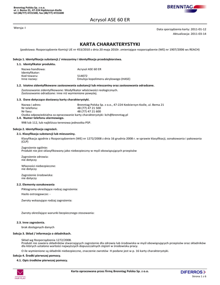 Brenntag Polska Sp. z o.o. ul. J. Bema 21, 47-224 Kędzierzyn-Koźle tel (48/77) 4721500, fax (48/77) 4721600 Acrysol ASE 60 ER Wersja: I Data sporządzenia karty: 2011-01-12 Aktualizacja: 2011-03-14 KARTA CHARAKTERYSTYKI (podstawa: Rozporządzenie Komisji UE nr 453/2010 z dnia 20 maja 2010r. zmieniające rozporządzenie (WE) nr 1907/2006 ws REACH) Sekcja 1. Identyfikacja substancji / mieszaniny i identyfikacja przedsiębiorstwa. 1.1. Identyfikator produktu. Nazwa handlowa: Identyfikator: Kod towaru: Inne nazwy: Acrysol ASE 60 ER 514072 Emulsja kopolimeru akrylowego (HASE) 1.2. Istotne zidentyfikowane zastosowania substancji lub mieszaniny oraz zastosowania odradzane. Zastosowanie zidentyfikowane: Modyfikator właściwości reologicznych. Zastosowanie odradzane: inne niż wymienione powyżej. 1.3. Dane dotyczące dostawcy karty charakterystyki. Nazwa i adres: Brenntag Polska Sp. z o.o., 47-224 Kedzierzyn-Koźle, ul. Bema 21 Nr telefonu: 48 (77) 47 21 500 Nr faxu: 48 (77) 47 21 600 Osoba odpowiedzialna za opracowanie karty charakterystyki: [email protected] 1.4. Numer telefonu alarmowego. 998 lub 112, lub najbliższa terenowa jednostka PSP. Sekcja 2. Identyfikacja zagrożeń. 2.1. Klasyfikacja substancji lub mieszaniny. Klasyfikacja zgodnie z Rozporządzeniem (WE) nr 1272/2008 z dnia 16 grudnia 2008 r. w sprawie klasyfikacji, oznakowania i pakowania (CLP) Zagrożenie ogólnie: Produkt nie jest sklasyfikowany jako niebezpieczny w myśl obowiązujących przepisów Zagrożenie zdrowia: nie dotyczy Własności niebezpieczne: nie dotyczy Zagrożenie środowiska: nie dotyczy 2.2. Elementy oznakowania Piktogramy określające rodzaj zagrożenia: Hasło ostrzegawcze: Zwroty wskazujące rodzaj zagrożenia: Zwroty określające warunki bezpiecznego stosowania: 2.3. Inne zagrożenia. brak dostępnych danych Sekcja 3. Skład / informacja o składnikach. Skład wg Rozporządzenia 1272/2008. Produkt nie zawiera składników stwarzających zagrożenie dla zdrowia lub środowiska w myśl obowiązujących przepisów oraz składników dla których ustalono wartości najwyższych dopuszczalnych stężeń w środowisku pracy. O ile wymienione są składniki niebezpieczne, znaczenie zwrotów H podane jest w p. 16 karty charakterystyki. Sekcja 4. Środki pierwszej pomocy. 4.1. Opis środków pierwszej pomocy. Karta opracowana przez firmę Brenntag Polska Sp. z o.o. Strona 1 z 6 Brenntag Polska Sp. z o.o. ul. J. Bema 21, 47-224 Kędzierzyn-Koźle tel (48/77) 4721500, fax (48/77) 4721600 Acrysol ASE 60 ER Wdychanie: W razie narażenia inhalacyjnego zapewnić dostęp świeżego powietrza. Kontakt ze skórą: W razie zanieczyszczenia skóry zmyć wodą z mydłem, gdy podrażnienie utrzymuje się skorzystać z pomocy lekarskiej. Kontakt z oczami: W razie zanieczyszczenia oczu płukać obficie wodą, gdy podrażnienie utrzymuje się skorzystać z pomocy lekarskiej. Spożycie: W razie spożycia podac do wypicia 1-2 szklanki wody. Nigdy nie podawać niczego doustnie osobie nieprzytomnej. Przy wystąpieniu niepokojących objawów skorzystać z pomocy medycznej. 4.2. Najważniejsze ostre i opóźnione objawy oraz skutki narażenia. brak dostępnych danych 4.3. Wskazania dotyczące wszelkiej natychmiastowej pomocy lekarskiej i szczególnego postępowania z poszkodowanym. brak dostępnych danych Sekcja 5. Postępowanie w przypadku pożaru. 5.1. Środki gaśnicze. Pożary w obecności produktu gasić środkami odpowiednimi dla palących się materiałów. 5.2. Szczególne zagrożenia związane z substancją lub mieszaniną. Produkt palny po odparowaniu wody. Materiał może rozpryskiwać powyżej 100°C. W czasie pożaru mogą wydzielać się monomery akrylowe. 5.3. Informacje dla straży pożarnej. Stosować niezależny aparat oddechowy oraz odzież ochronną. Sekcja 6. Postępowanie w przypadku niezamierzonego uwolnienia do środowiska. 6.1. Indywidualne środki ostrożności, wyposażenie ochronne i procedury w sytuacjach awaryjnych. Użyć środków ochrony osobistej (rękawice ochronne, gogle ochronne/szczelne okulary ochronne, odzież ochronną). Materiał może powodować śliskość nawierzchni. 6.2. Środki ostrożności w zakresie ochrony środowiska. Zapobiec rozprzestrzenianiu się lub dostaniu do kanalizacji, rowów i rzek; uszkodzone opakowanie umieścić w pojemniku ochronnym; W przypadku skażenia produktem rzek, jezior lub ścieków powiadomić odpowiednie władze. 6.3. Metody i materiały zapobiegające rozprzestrzenianiu się skażenia i służące do usuwania skażenia. Rozlewy zebrać za pomocą materiału chłonnego (piasek, ziemia) do oznakowanego pojemnika i przekazać do zniszczenia. Utrzymywać wyciek z dala od kanalizacji miejskich i otwartych zbiorników wodnych. Uwaga: niebezpieczeństwo pośliźnięcia się na rozlanym produkcie. 6.4. Odniesienia do innych sekcji. Usuwać zgodnie z zaleceniami przedstawionymi w sekcji 13 Sekcja 7. Postępowanie z substancjami i mieszaninami oraz ich magazynowanie. 7.1. Środki ostrożności dotyczące bezpiecznego postępowania. Unikać zanieczyszczenia oczu i skóry. Stosować wyłącznie w dobrze wentylowanych pomieszczeniach. Nie wdychać gazu/dymu/pary/mgły produktu. Zapewnić wentylację w miejscu pracy (zalecana wentylacja miejscowa) 7.2. Warunki bezpiecznego magazynowania, łącznie z informacjami dotyczącymi wszelkich wzajemnych niezgodności. Przechowywać w szczelnie zamkniętych opakowaniach w chłodnym i suchym pomieszczeniu o dobrej wentylacji w temperaturze 1-49°C. Chronić przed zamarzaniem. Przed użyciem wymieszać. 7.3. Szczególne zastosowania końcowe. brak dostępnych danych Sekcja 8. Kontrola narażenia / środki ochrony indywidualnej. 8.1. Parametry dotyczące kontroli. NDS, NDSCh - nie oznaczono (wg Rozporządzenia MPiPS z dn. 29 listopada 2002 ; Dz.U. Nr 217, poz. 1833 z późniejszymi zmianami) Zalecenia dotyczące procedury monitoringu zawartości składników niebezpiecznych w powietrzu – metodyka pomiarów: Karta opracowana pr