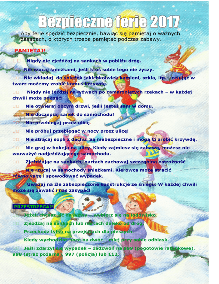 Bezpieczne ferie 2017 Aby ferie spędzić bezpiecznie, bawiąc się pamiętaj o ważnych zasadach, o których trzeba pamiętać podczas zabawy. PAMIĘTAJ! Nigdy nie zjeżdżaj na sankach w pobliżu dróg. Nie rzucaj śnieżkami, jeśli ktoś sobie tego nie życzy. Nie wkładaj do śnieżek jakichkolwiek kamieni, szkła, itp. - celując w twarz możemy zrobić komuś krzywdę. Nigdy nie jeździj na łyżwach po zamarzniętych rzekach – w każdej chwili może pęknąć! Nie otwieraj obcym drzwi, jeśli jesteś sam w domu. Nie przebiegaj przez ulicę. Nie doczepiaj sanek do samochodu! Nie próbuj przebiegać w nocy przez ulicę! Nie strącaj sopli z dachu. Są niebezpieczne i mogą Ci zrobić krzywdę. Nie graj w hokeja na ulicy. Kiedy zajmiesz się zabawą, możesz nie zauważyć nadjeżdżającego samochodu. Zjeżdżając na sankach, nartach zachowaj szczególną ostrożność Nie rzucaj w samochody śnieżkami. Kierowca może stracić równowagę i spowodować wypadek. Uważaj na źle zabezpieczone konstrukcje ze śniegu. W każdej chwili może się zawalić i nas zasypać! PRZESTRZEGAJ! Jeżeli chcesz iść na łyżwy – wybierz się na lodowisko. Przechodź tylko na przejściach dla pieszych. Zjeżdżaj na sankach lub nartach daleko od dróg. Kiedy wychodzisz nocą na dwór – miej przy sobie odblask. Jeśli zdarzył się wypadek – zadzwoń na 999 (pogotowie ratunkowe), 998 (straż pożarna), 997 (policja) lub 112.