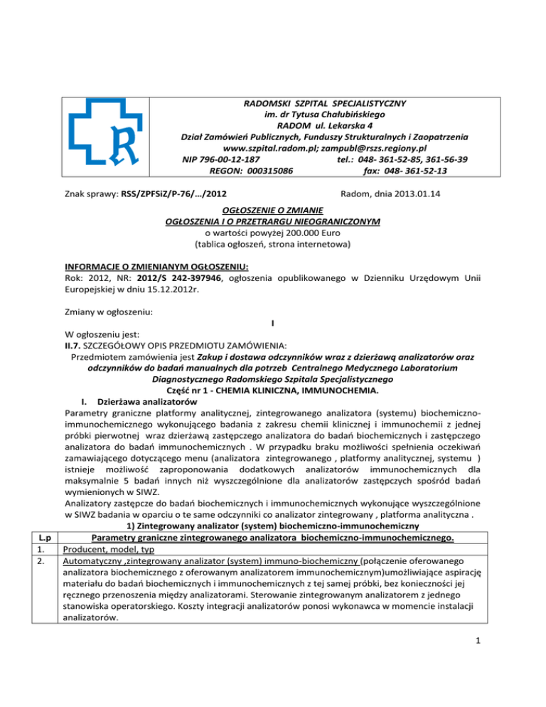 RADOMSKI SZPITAL SPECJALISTYCZNY im. dr Tytusa Chałubińskiego RADOM ul. Lekarska 4 Dział Zamówień Publicznych, Funduszy Strukturalnych i Zaopatrzenia www.szpital.radom.pl; [email protected] NIP 796-00-12-187 tel.: 048- 361-52-85, 361-56-39 REGON: 000315086 fax: 048- 361-52-13 Znak sprawy: RSS/ZPFSiZ/P-76/…/2012 Radom, dnia 2013.01.14 OGŁOSZENIE O ZMIANIE OGŁOSZENIA I O PRZETRARGU NIEOGRANICZONYM o wartości powyżej 200.000 Euro (tablica ogłoszeń, strona internetowa) INFORMACJE O ZMIENIANYM OGŁOSZENIU: Rok: 2012, NR: 2012/S 242-397946, ogłoszenia opublikowanego w Dzienniku Urzędowym Unii Europejskiej w dniu 15.12.2012r. Zmiany w ogłoszeniu: L.p 1. 2. I W ogłoszeniu jest: II.7. SZCZEGÓŁOWY OPIS PRZEDMIOTU ZAMÓWIENIA: Przedmiotem zamówienia jest Zakup i dostawa odczynników wraz z dzierżawą analizatorów oraz odczynników do badań manualnych dla potrzeb Centralnego Medycznego Laboratorium Diagnostycznego Radomskiego Szpitala Specjalistycznego Część nr 1 - CHEMIA KLINICZNA, IMMUNOCHEMIA. I. Dzierżawa analizatorów Parametry graniczne platformy analitycznej, zintegrowanego analizatora (systemu) biochemicznoimmunochemicznego wykonującego badania z zakresu chemii klinicznej i immunochemii z jednej próbki pierwotnej wraz dzierżawą zastępczego analizatora do badań biochemicznych i zastępczego analizatora do badań immunochemicznych . W przypadku braku możliwości spełnienia oczekiwań zamawiającego dotyczącego menu (analizatora zintegrowanego , platformy analitycznej, systemu ) istnieje możliwość zaproponowania dodatkowych analizatorów immunochemicznych dla maksymalnie 5 badań innych niż wyszczególnione dla analizatorów zastępczych spośród badań wymienionych w SIWZ. Analizatory zastępcze do badań biochemicznych i immunochemicznych wykonujące wyszczególnione w SIWZ badania w oparciu o te same odczynniki co analizator zintegrowany , platforma analityczna . 1) Zintegrowany analizator (system) biochemiczno-immunochemiczny Parametry graniczne zintegrowanego analizatora biochemiczno-immunochemicznego. Producent, model, typ Automatyczny ,zintegrowany analizator (system) immuno-biochemiczny (połączenie oferowanego analizatora biochemicznego z oferowanym analizatorem immunochemicznym)umożliwiające aspirację materiału do badań biochemicznych i immunochemicznych z tej samej próbki, bez konieczności jej ręcznego przenoszenia między analizatorami. Sterowanie zintegrowanym analizatorem z jednego stanowiska operatorskiego. Koszty integracji analizatorów ponosi wykonawca w momencie instalacji analizatorów. 1 3. 4. 5. 6. 7. 8. 9. 10. 11. 12. 13. 14. 15. 16. 17. 18. 19. 20. 21. 22. 23. L.p 1. 2. 3. 4. 5. 6. 7. 8. 9. 10. 11. L.p 1. 2. 3. 4. 5. 6. 7. 8. Analizator (system) nowy , rok produkcji 2011/2012. Analizator (system) pracujący w trybie rutynowym i trybie cito bez przerywania ciągłości pracy Pojemność analizatora (systemu) zintegrowanego nie mniej niż 150 próbek badanych. Wbudowany system kontroli jakości Możliwość pracy z różnymi typami próbek ( surowica, osocze, mocz, pmr,) Możliwość pracy z różnymi typami probówek (systemów zamkniętych) Możliwość dostawiania statywów z probówkami w trakcie pracy analizatora (systemu) Identyfikacja odczynników i prób badanych za pomocą wbudowanego czytnika kodów kreskowych. Analizatory wyposażone w pozycję STAT. Detekcja skrzepu oraz informacja o skrzepie dla operatora Rejestracja wykonywanych przeglądów i procedur konserwacyjnych przez analizator. Wyposażenie w modem serwisowy dla celów zdalnej diagnostyki serwisowej. Komputerowa archiwizacja danych. Funkcja automatycznego rozcieńczania próbki. Możliwość automatycznego wykonywania powtórzeń oznaczeń. Analizator (system) wyposażony w drukarkę zewnętrzną i komputer sterujący. Podtrzymanie pracy analizatorów w przypadku braku zasilania przez UPS przynajmniej przez 20 minut. Bezpłatne szkolenie personelu w obsłudze aparatu. Bezpłatny serwis analizatorów przez cały okres trwania dzierżawy łącznie z przeglądami okresowymi. Instrukcja obsługi w języku polskim Czas przyjazdu serwisanta – 12 godzin 2) Analizator-część biochemiczna systemu zintegrowanego Warunki graniczne, które musi spełniać oferowany analizator-część biochemiczna systemu zintegrowanego. Producent, model, typ W pełni automatyczny analizator , pracujący w trybie pacjent po pacjencie Wykonywanie analiz w fazie ciekłej Wydajność analizatora- minimum 600 ozn/ godz.dla oznaczeń fotometrycznych Możliwość itp. wykonywania analiz w surowicy, osoczu, moczu, pmr itp. Ilość jednocześnie dostępnych odczynników na pokładzie analizatora- minimum 60 Stałe monitorowanie poziomu odczynników Średnie zużycie wody ze stacji uzdatnianie maksymalnie 30 litrów na godzinę. Stacja uzdatniania wody- pokrywająca zapotrzebowanie na wodę- koszty utrzymania, eksploatacyjne i serwis pokrywa Wykonawca Odczynniki do badań płynne lub przygotowywane na pokładzie. Detekcja skrzepu. 3) Analizator immunochemiczny zintegrowanego systemu Warunki graniczne, które musi spełniać analizator immunochemiczny zintegrowanego systemu Producent, model, typ W pełni zautomatyzowany analizator immunochemiczny wykorzystujący metody nieizotopowe, niemikropłytkowe, oznaczający panel : wirusologiczny, tarczycowy, markerów nowotworowych, kardiologiczny. Wydajność minimum 160 oznaczeń na godzinę Odczyt oparty o technikę chemiluminescencji. Wykonywanie jednocześnie minimum 24 różnych testów Minimum 24 pozycji na odczynniki, pozycje chłodzone. Automatyczne monitorowanie stanu odczynników na pokładzie. Detekcja skrzepu. 4) Uzupełniający analizator immunochemiczny 2 L.p. 1. 2. 3. 4. 5. L.p 1. 2. 3. 4. 5. 6. 7. 8. 9. 10. L.p. 1. 2. 3. 4. 5. 6. 7. 8. Warunki graniczne dla Uzupełniającego analizatora immunochemicznego Producent, model, typ Analizator automatyczny Metoda - chemiluminescencja, fluorescencja, enzymoimmunofluorescencyjna. Możliw