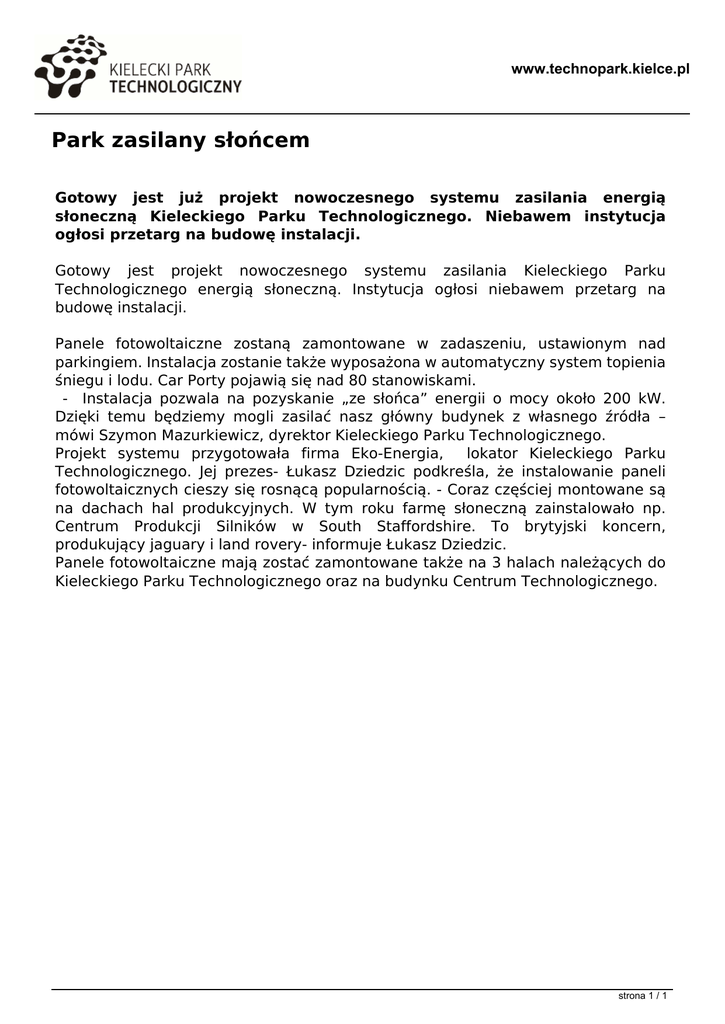 www.technopark.kielce.pl Park zasilany słońcem Gotowy jest już projekt nowoczesnego systemu zasilania energią słoneczną Kieleckiego Parku Technologicznego. Niebawem instytucja ogłosi przetarg na budowę instalacji. Gotowy jest projekt nowoczesnego systemu zasilania Kieleckiego Parku Technologicznego energią słoneczną. Instytucja ogłosi niebawem przetarg na budowę instalacji. Panele fotowoltaiczne zostaną zamontowane w zadaszeniu, ustawionym nad parkingiem. Instalacja zostanie także wyposażona w automatyczny system topienia śniegu i lodu. Car Porty pojawią się nad 80 stanowiskami. - Instalacja pozwala na pozyskanie „ze słońca” energii o mocy około 200 kW. Dzięki temu będziemy mogli zasilać nasz główny budynek z własnego źródła – mówi Szymon Mazurkiewicz, dyrektor Kieleckiego Parku Technologicznego. Projekt systemu przygotowała firma Eko-Energia, lokator Kieleckiego Parku Technologicznego. Jej prezes- Łukasz Dziedzic podkreśla, że instalowanie paneli fotowoltaicznych cieszy się rosnącą popularnością. - Coraz częściej montowane są na dachach hal produkcyjnych. W tym roku farmę słoneczną zainstalowało np. Centrum Produkcji Silników w South Staffordshire. To brytyjski koncern, produkujący jaguary i land rovery- informuje Łukasz Dziedzic. Panele fotowoltaiczne mają zostać zamontowane także na 3 halach należących do Kieleckiego Parku Technologicznego oraz na budynku Centrum Technologicznego. strona 1 / 1 Powered by TCPDF (www.tcpdf.org)