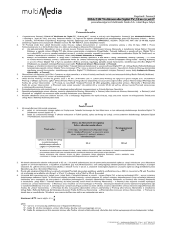 Regulamin Promocji 2016/610 ”Multiroom do Digital TV_12 m-cy_ed.2” prowadzonej przez Multimedia Polska S.A. z siedzibą w Gdyni §1 Postanowienia ogólne 1. 2. 3. 4. 5. 6. 7. Organizatorem Promocji 2016/610 ”Multiroom do Digital TV_12 m-cy_ed.2”, zwanej w dalszej części Regulaminu Promocją¹ jest Multimedia Polska S.A. z siedzibą w Gdyni (81-341), przy ulicy Tadeusza Wendy 7/9, wpisana do rejestru przedsiębiorców prowadzonego przez Sąd Rejonowy Gdańsk – Północ w Gdańsku, VIII Wydział Gospodarczy Krajowego Rejestru Sądowego pod numerem: 0000238931, REGON: 190007345, NIP: 586-10-44-881, kapitał zakładowy i łączna suma uiszczonych wkładów wynosi: 91 764 808 PLN, zwana dalej Operatorem. W Promocji może brać udział (Uczestnik) osoba fizyczna będąca konsumentem w rozumieniu przepisów ustawy z dnia 16 lipca 2004 r. Prawo Telekomunikacyjne (t. j.: Dz.U.2014.243 ze zm.), która zamieszkuje na Obszarze Promocji oraz: a) nie jest Abonentem Operatora i która w okresie trwania Promocji zawrze z Operatorem Umowę Abonencką o świadczenie Usługi Radia i Telewizji Kablowej w sposób cyfrowy (Digital TV) albo Umowę Abonencką o świadczenie Usługi Radia i Telewizji Kablowej w sposób cyfrowy (Digital TV) w technologii IPTV, w tym na zasadach odrębnej promocji, regulującą ponadto warunki korzystania z dodatkowego dekodera Digital TV (Multiroom), na zasadach wynikających z niniejszej Promocji, zwaną dalej Umową Abonencką w Promocji; b) korzysta w charakterze Abonenta z Usługi Radia i Telewizji Kablowej Operatora, w tym także z Usługi Dodatkowej Telewizji Cyfrowej DTV i która w okresie trwania Promocji zawrze z Operatorem Aneks do Umowy Abonenckiej regulujący warunki świadczenia Usługi Radia i Telewizji Kablowej w sposób cyfrowy (Digital TV), w tym na zasadach odrębnej promocji, regulujący ponadto zasady korzystania z dodatkowego dekodera Digital TV (Multiroom), na zasadach niniejszej Promocji, zwany dalej Aneksem do Umowy Abonenckiej - w Promocji; c) korzysta w charakterze Abonenta z Usługi Radia i Telewizji Kablowej świadczonej w sposób cyfrowy (Digital TV) lub z Usługi Radia i Telewizji Kablowej świadczonej w sposób cyfrowy (Digital TV) w technologii IPTV i która w okresie trwania Promocji zawrze z Operatorem Aneks do Umowy Abonenckiej regulujący warunki korzystania z dodatkowego dekodera Digital TV (Multiroom), na zasadach niniejszej Promocji, zwany dalej Aneksem do Umowy Abonenckiej - w Promocji. Obszar Promocji obejmuje części Sieci Operatora w miejscowościach, w których istnieją możliwości techniczne świadczenia Usługi Radia i Telewizji Kablowej w sposób cyfrowy (Digital TV), w tym w technologii IPTV. Okres trwania Promocji: od dnia 01 grudnia 2016 r. do dnia 30 kwietnia 2017 r. Zakończenie Promocji nie wpływa na prawa nabyte przez Uczestników Promocji w okresie jej trwania. Upływ okresu trwania Promocji nie pozbawia Uczestnika prawa zawarcia odpowiednio Umowy Abonenckiej w Promocji albo Aneksu do Umowy Abonenckiej – w Promocji, na warunkach niniejszej Promocji. W takim przypadku, odpowiednio Umowa Abonencka w Promocji albo Aneks do Umowy Abonenckiej - w Promocji może zostać zawarta/y nie później niż w terminie 14 dni od upływu okresu trwania Promocji oznaczonego w niniejszym Regulaminie Promocji. Promocja nie dotyczy osób zamieszkałych w zabudowie jednorodzinnej, niewyposażonej w Gniazdo Sieciowe Operatora. Operatorowi przysługuje prawo odmowy zawarcia odpowiednio Umowy Abonenckiej w Promocji albo Aneksu do Umowy Abonenckiej - w Promocji, jeżeli Uczestnik ma zaległości we wnoszeniu opłat za usługi świadczone przez Operatora. Wszelkie określenia oznaczone wielkimi literami, o ile z niniejszego Regulaminu nie wynika inaczej, mają znaczenie nadane im w Regulaminie Świadczenia Usługi Radia i Telewizji Kablowej Operatora. §2 Zasady Promocji 1. W ramach Promocji Uczestnik otrzymuje: a) rabat, po zastosowaniu którego opłata za Przyłączenie Gniazda Sieciowego do Sieci Operatora, w tym aktywację dodatkowego dekodera Digital TV (Multiroom) wynosić będzie 49 zł; b) rabat, po zastosowaniu którego w okresie wskazanym w Tabeli poniżej, opłata za dostęp do Usługi z wykorzystaniem dodatkowego dekodera Digital TV (Multiroom), wynosić będzie: Opłata za Abonament (miesięczna) i okres obowiązywania rabatu Tytuł opłaty Opłata za dostęp do Usługi z wykorzystaniem dodatkowego dekodera Digital TV (Multiroom) w miesiącu kalendarzowym aktywacji usługi objętej niniejszą Promocją *, a następnie przez okres kolejnych 11 pełnych miesięcy kalendarzowych 15 zł Kwota przyznanej ulgi ** 405 zł * W miesiącu kalendarzowym aktywacji Usługi objętej niniejszą Promocją, opłata za dostęp do Usługi (z uwzględnieniem przyznanego rabatu) naliczona zostanie proporcjonalnie do okresu jej świadczenia w tym miesiącu. ** Kwota przyznanej ulgi stanowi, liczoną za okres stosowania rabatu określony Promocją, różnicę pomiędzy ceną cennikową za Usługę, a ceną promocyjną za Usługę wskazaną w powyższej Tabeli. 2. 3. 4. W okresie stosowania rabatów wskazanych w §2 ust. 1 Uczestnik zobowiązany jest do ponoszenia pozostałych opłat za usługi świadczone przez Operatora zgodnie z Cennikiem Operatora, z wyjątkiem przypadków, gdy warunki korzystania z tych usług regulują odrębne promocje Operatora, do których przystąpił Uczestnik. Po upływie okresu stosowania rabatów, o których mowa w §2 ust. 1, Uczestnik zobowiązany będzie do uiszczania opłat za usługi świadczone przez Operatora, zgodnie z Cennikiem Operatora. Kwota ulgi przyznanej Uczestnikowi w ramach niniejszej Promocji, stanowiąca podstawę ustalenia wielkości zwrotu, o którym mowa jest w §2 ust. 4 poniżej, nie przekracza sumy rabatów określonych w §2 ust. 1 i wskazana jest w Tabeli w §2 ust. 1 powyżej. Uczestnik, który po rozpoczęciu świadczenia Usługi Radia i Telewizji Kablowej w sposób cyfrowy (Digital TV)