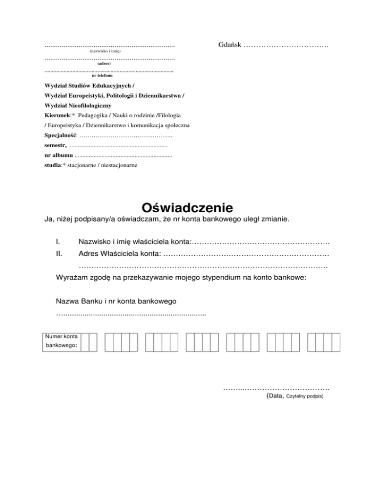 ..................................................................... Gdańsk ……………………………. (nazwisko i imię) ..................................................................... (adres) ……………………………………………………………………………. nr telefonu Wydział Studiów Edukacyjnych / Wydział Europeistyki, Politologii i Dziennikarstwa / Wydział Nieofilologiczny Kierunek:* Pedagogika / Nauki o rodzinie /Filologia / Europeistyka / Dziennikarstwo i komunikacja społeczna Specjalność: …….……………………………….. semestr, .............................................................. nr albumu .............................................................. studia:* stacjonarne / niestacjonarne Oświadczenie Ja, niżej podpisany/a oświadczam, że nr konta bankowego uległ zmianie. I. Nazwisko i imię właściciela konta:………………………………………………. II. Adres Właściciela konta: ………………………………………………………… ……………………………………………………………………………………… Wyrażam zgodę na przekazywanie mojego stypendium na konto bankowe: Nazwa Banku i nr konta bankowego ….................................................................... Numer konta bankowego: ……...……………………………. (Data, Czytelny podpis)