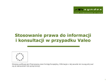 Stosowanie prawa do informacji i konsultacji w przypadku Valeo 1 Wiele zakładów z niezależnymi radami pracowników Valeo posiada kilka zakładów produkcyjnych w Hiszpanii mających status niezależnych jednostek : Zaragoza (wymienniki ciepła) Martorellas (systemy klimatyzacji) Getafe (centralna dystrybucja); ma możliwość wybierania zakładów, w których się zaopatruje, mogą to być zakłady konkurencyjne. Villaverde i Fuenlabrada. Każdy zakład ma swoją własną radę pracowników i odmienną reprezentację związkową, przy większościowym udziale CCOO i UGT. 2 … przy czym mechanizmy koordynacji mają charakter międzyzwiązkowy Istniejąca, bardzo wyraźna koordynacja międzyzwiązkowa (UGT/CCOO) jest wynikiem porozumienia podpisanego w 2007 r. i w 2009 r. przez federację pracowników hutnictwa, budownictwa i usług towarzyszących UGT oraz federację górników i hutnictwa CCOO w sprawie „Regulacji uczestnictwa związków zawodowych w Radach Pracowników” W świetle tego porozumienia: w trybie poprzedzającym zebrania rad pracowników przedstawiciele pracowników zwracają się do instancji przedstawicielskich w poszczególnych zakładach by zapoznać się z sytuacją każdego z nich i przygotować zebranie rady pracowników. Po spotkaniach rad pracowników, wszystkim pracownikom przekazywana jest informacja na temat przebiegu i treści dyskusji na spotkaniach. 3 Projekt organizacji Valeo wchodzi w zakres procesu informacji i konsultacji instancji reprezentujących pracowników Projekt nowej organizacji Valeo będzie miał konsekwencje dla zatrudnienia w zakładach grupy w Hiszpanii. W związku z tym realizacja tego projektu wchodzi w zakres procesu informacji i konsultacji zgodnie z art. 54 Statutu Pracowników: Art 64.5 „Rada pracowników ma prawo być informowaną i konsultowaną … na temat wszystkich decyzji przedsiębiorstwa … które mogłyby spowodować wyraźne zmiany w organizacji pracy i umowach o pracę w przedsiębiorstwie” Ten sam artykuł przewiduje, że „rada pracowników będzie miała prawo do wydania swojej opinii, przed wdrożeniem przez pracodawcę decyzji dotyczących:… realizacji i zmian w systemie zarządzania oraz kontroli pracy” 4 Proces informacji jest realizowany w większym stopniu na poziomie europejskim niż na poziomie krajowym / lokalnym… (1) Europejska Rada Zakładowa otworzyła proces informacji i konsultacji na temat projektu nowej organizacji pracy. W związku z tym członkowie ERZ dysponują informacjami (poufnymi) nt. wpływu projektu na zatrudnienie na poziomie krajowym i lokalnym. O ile członkowie ERZ dysponują szczegółową informacją nt. projektu i jego skutków, o tyle poziom informacji dostępnej na poziomie krajowym/lokalnym jest zdecydowanie gorszy. 5 Proces informacji jest realizowany w większym stopniu na poziomie europejskim niż na poziomie krajowym / lokalnym… 2) Po spotkaniu ERZ dyrekcja grupy opracowała dokument podsumowujący projekt i przedstawiający najważniejsze elementy strategii grupy w związku z projektem Dokument ten został przekazany krajowej i lokalnej dyrekcji, która przekazała go następnie radzie pracowników i wszystkim zatrudnionym. Dokument ten zawierał część informacji i dokumentów przekazanych ERZ. Dokument ten nie był przekazany cz łonkom rady pracowników Natomiast kompletny dokument (przetłumaczony na wszystkie języki ERZ)) przekazano członkom ERZ Można więc stwierdzić, że proces informacji, w takim zakresie w jakim opisano go powyżej, miał miejsce, jeśli chodzi natomiast o konsultację, to, jako taka, nie miała miejsca. 6 …natomiast konsultacja pozostaje główną, nieuregulowaną kwestią Według przedstawicieli pracowników z którymi odbyły się spotkania istnieje, mówiąc ogólnie, płynny system informacji Raz na dwa miesiące rada pracowników otrzymuje informacje nt. sytuacji zakładu w odniesieniu do zamówień, perspektyw sprzedaży i zatrudnienia. Natomiast pojęcie konsultacji nie jest jasno zdefiniowane ani realizowane; nie istnieją żadne zasady odnośnie przekazywania informacji niezbędnych, kalendarza informowania, analizy informacji i formułowania opinii w przypadkach, które mogłyby być przedmiotem procesu konsultacji. Kwestia poufności również jest źródłem konfliktów, przekazywanych informacji ma charakter poufny. gdyż wiele 7 Praktyka europejska pozwoliła na udoskonalenie instrumentów informowania na poziomie krajowym W uzupełnieniu istniejących uregulowań prawnych obowiązujących w Hiszpanii, istnieją, w przypadku Valeo, różne instancje i fora wymiany dyskusji, których utworzenie i funkcjonowanie wynikają bezpośrednio z charakteru ponadnarodowego grupy: Zebrania informacyjne raz lub dwa razy w roku w Madrycie, w których i uczestniczą przedstawiciele pracowników wszystkich zakładów grupy w Hiszpanii, jak i dyrektorzy zasobów ludzkich oraz dyrektor grupy odpowiedzialny za stosunki przemysłowe. Jedno zebranie roczne, w którym uczestniczą przedstawiciele wszystkich organizacji związkowych obecnych w każdym z zakładów (po jednym z każdej organizacji). Koszty organizacji tych zebrań są finansowane przez dyrekcję Valeo. 8