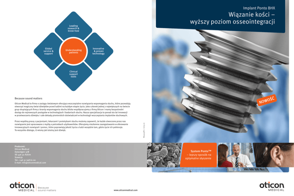 Implant Ponto BHX Wiązanie kości – wyższy poziom osseointegracji Leading research & know-how Global service & support Understanding patients Innovative & proven technology Clinical support tools OŚĆ W O N Because sound matters Przez wspólną pracę z pacjentami, lekarzami i protetykami słuchu możemy zapewnić, że każde stworzone przez nas rozwiązanie jest opracowane z myślą o potrzebach użytkowników. Oferujemy niezłomne zaangażowanie w oferowanie innowacyjnych rozwiązań i pomoc, które poprawiają jakość życia u ludzi wszędzie tam, gdzie życie ich pokieruje. To wszystko dlatego, iż wiemy jak istotny jest dźwięk. Producent: Oticon Medical Datavägen 37B SE-436 32 Askim Szwecja Tel.: +46 31 748 61 00 E-mail: [email protected] M52429PL / 2015.10 Oticon Medical to firma o zasięgu światowym oferująca wszczepialne rozwiązania wspomagania słuchu, które pozwalają otworzyć magiczny świat dźwięków przed ludźmi na każdym etapie życia. Jako członek jednej z największych na świecie grup skupiających firmy z branży wspomagania słuchu blisko współpracujemy z firmą Oticon i mamy bezpośredni dostęp do najnowszych postępów w technologiach i badaniach słuchu. Nasza specjalizacja to ponad sto lat innowacji w przetwarzaniu dźwięku i całe dekady pionierskich doświadczeń w technologii wszczepiania implantów słuchowych. System Ponto™ – lepszy sposób na optymalne słyszenie www.oticonmedical.com Ć NOWOŚ Implant Ponto BHX Mocniejsze niż kość Technologia Biohelix™ zwiększa siłę połączenia między kością a implantem o ponad 150%.1 W badaniach wykazano, że połączenie między kością a implantem BHX jest w rzeczywistości mocniejsze niż sama kość. Wyznaczanie nowych standardów w technologii implantów 45 Moment zerwania (Ncm) 40 35 P = 0.008 30 25 Linia pęknięcia 20 15 10 5 0 Po obróbce Biohelix Po 8 tygodniach gojenia średni moment zerwania, będący miarą stopnia osseointegracji, w implantach Ponto BHX jest większy o 153% w porównaniu z implantami jedynie obrabianymi maszynowo.1 Implant Ponto BHX to doskonałe połączenie sprawdzonej geometrii OptiGrip™ i najnowszej technologii powierzchni. Dzięki swoim mikro- i nanostrukturom przenosi osseointegrację na wyższy poziom — wiązania kości. Zmineralizowana kość przyrasta bezpośrednio na powierzchni tytanowego implantu wykonanej metodą ablacji laserowej. Próby momentu zerwania potwierdzają, że pęknięcie występuje w kości.1 To oznacza istnienie połączenia z kością w skali nano. Najwyższa stabilność od pierwszego dnia Pierwsza tytanowa powierzchnia wykonana metodą ablacji laserowej Powierzchnia implantu Ponto BHX odpowiada strukturalnym blokom kości 80 Biohelix™ powierzchnia właściwa dla miejsca wykonana metodą ablacji laserowej pozwala na szybsze i mocniejsze formowanie kości Makrogeometria OptiGrip™ pozwala na wysoką początkową stabilność implantu 70 Wielkości ISQ Biohelix™ to efekt najnowszych badań wiodących światowych ekspertów z zakresu osseointegracji z Goeteborga w Szwecji. Wyjątkowa technologia ablacji laserowej Biohelix™ pozwala na miejscowe modyfikacje na samym dnie rowków gwintu o sprawdzonej geometrii OptiGrip™. To pozwala utworzyć trzypoziomową topografię powierzchni dopasowanej do struktury naturalnej kości w makro-, mikro- i nanoskali. Geometria OptiGrip™ cechuje się najwyższą początkową stabilnością spośród wszystkich kotwiczonych w kości implantów słuchowych.2 Badania wykazują utrzymywanie i zwiększanie stabilności w czasie przy doskonałych wynikach klinicznych.3, 4, 5 6 mm 60 9 mm 12 mm 50 40 0 100 200 300 400 Dni Implant Makro Mikro Nano „Chropowatość w skali nano odgrywa ważną rolę w osseointegracji. Poprawa parametrów biomechanicznych jest jeszcze większa, niż sobie wyobrażałem.” R. Brånemark, Associate Professor MD Msc. PhD Struktura kości Kość dojrzała Osteocyt/ osteoblast Kość zmineralizowana 1.Johansson M. L., Omar O., Palmquist A., Simonsson H., Emanuelsson L., Norlindh B., Thomsen P.: „Site-specific laser modification promotes higher osseointegration of titanium implants”. Prezentacja Osseo, Lake Louise, Kanada, maj 2015 r. 2.Westerkull P., Jinton L., „The new wide Ponto implant design – clinical and surgical aspects”, opracowanie Oticon Medical, M51162, 2012. 3.Nelissen R. C., den Besten C. A., Mylanus E. A., Hol M. K., „Stability, survival, and tolerability of a 4.5-mm-wide bone-anchored hearing implant: 6-month data from a randomized controlled clinical trial”, Eur Arch Otorhinolaryngol, E-pub: 20 marca 2015. 4.Hultcrantz M., „Stability testing of a wide bone-anchored device after surgery without skin thinning”. BioMed Res Int, E-pub: ID artykułu 853072, 2015. 5.Foghsgaard Ss, Caye-Thomasen P., „A new wide-diameter bone-anchored hearing implant-prospective 1-year data on complications, implant stability, and survival”, Otol Neurotol, 35(7), ss. 1238-41, 2014.