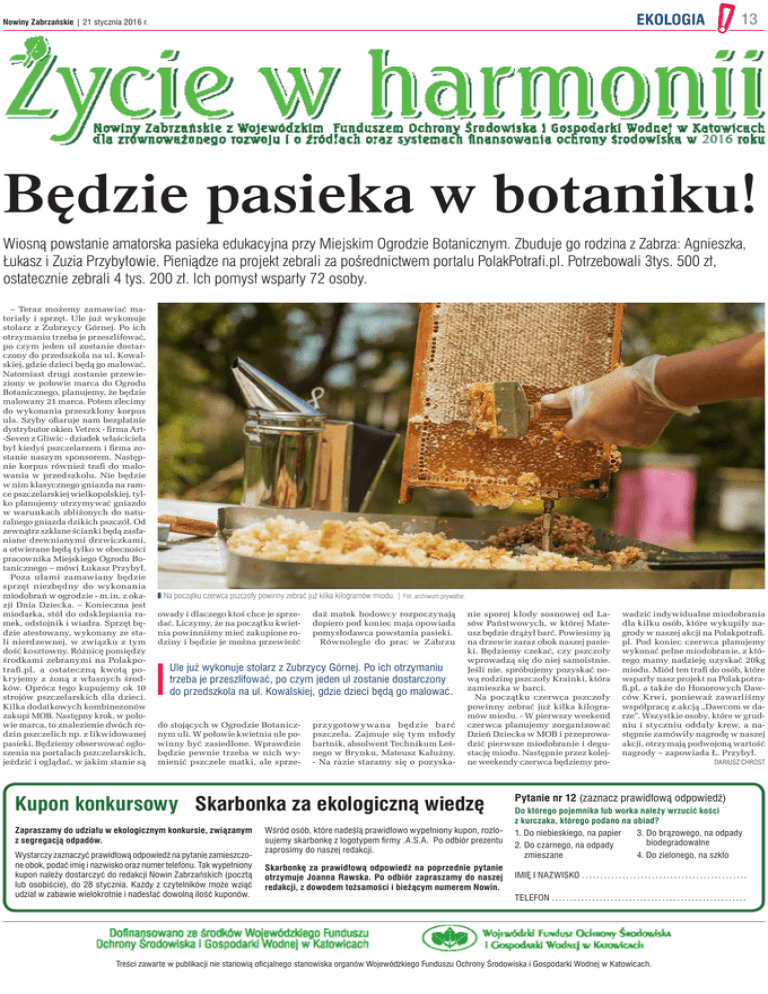 13 EKOLOGIA Nowiny Zabrzańskie | 21 stycznia 2016 r. Będzie pasieka w botaniku! Wiosną powstanie amatorska pasieka edukacyjna przy Miejskim Ogrodzie Botanicznym. Zbuduje go rodzina z Zabrza: Agnieszka, Łukasz i Zuzia Przybyłowie. Pieniądze na projekt zebrali za pośrednictwem portalu PolakPotrafi.pl. Potrzebowali 3tys. 500 zł, ostatecznie zebrali 4 tys. 200 zł. Ich pomysł wsparły 72 osoby. – Teraz możemy zamawiać materiały i sprzęt. Ule już wykonuje stolarz z Zubrzycy Górnej. Po ich otrzymaniu trzeba je przeszlifować, po czym jeden ul zostanie dostarczony do przedszkola na ul. Kowalskiej, gdzie dzieci będą go malować. Natomiast drugi zostanie przewieziony w połowie marca do Ogrodu Botanicznego, planujemy, że będzie malowany 21 marca. Potem zlecimy do wykonania przeszklony korpus ula. Szyby ofiaruje nam bezpłatnie dystrybutor okien Vetrex - firma Art-Seven z Gliwic - dziadek właściciela był kiedyś pszczelarzem i firma zostanie naszym sponsorem. Następnie korpus również trafi do malowania w przedszkolu. Nie będzie w nim klasycznego gniazda na ramce pszczelarskiej wielkopolskiej, tylko planujemy utrzymywać gniazdo w warunkach zbliżonych do naturalnego gniazda dzikich pszczół. Od zewnątrz szklane ścianki będą zasłaniane drewnianymi drzwiczkami, a otwierane będą tylko w obecności pracownika Miejskiego Ogrodu Botanicznego – mówi Łukasz Przybył. Poza ulami zamawiany będzie sprzęt niezbędny do wykonania miodobrań w ogrodzie - m.in. z okazji Dnia Dziecka. – Konieczna jest miodarka, stół do odsklepiania ramek, odstojnik i wiadra. Sprzęt będzie atestowany, wykonany ze stali nierdzewnej, w związku z tym dość kosztowny. Różnicę pomiędzy środkami zebranymi na Polakpotrafi.pl, a ostateczną kwotą pokryjemy z żoną z własnych środków. Oprócz tego kupujemy ok 10 strojów pszczelarskich dla dzieci. Kilka dodatkowych kombinezonów zakupi MOB. Następny krok, w połowie marca, to znalezienie dwóch rodzin pszczelich np. z likwidowanej pasieki. Będziemy obserwować ogłoszenia na portalach pszczelarskich, jeździć i oglądać, w jakim stanie są Na początku czerwca pszczoły powinny zebrać już kilka kilogramów miodu. | Fot. archiwum prywatne. owady i dlaczego ktoś chce je sprzedać. Liczymy, że na początku kwietnia powinniśmy mieć zakupione rodziny i będzie je można przewieźć daż matek hodowcy rozpoczynają dopiero pod koniec maja opowiada pomysłodawca powstania pasieki. Równolegle do prac w Zabrzu Ule już wykonuje stolarz z Zubrzycy Górnej. Po ich otrzymaniu trzeba je przeszlifować, po czym jeden ul zostanie dostarczony do przedszkola na ul. Kowalskiej, gdzie dzieci będą go malować. do stojących w Ogrodzie Botanicznym uli. W połowie kwietnia ule powinny być zasiedlone. Wprawdzie będzie pewnie trzeba w nich wymienić pszczele matki, ale sprze- przygotowywana będzie barć pszczela. Zajmuje się tym młody bartnik, absolwent Technikum Leśnego w Brynku, Mateusz Kałużny. - Na razie staramy się o pozyska- nie sporej kłody sosnowej od Lasów Państwowych, w której Mateusz będzie drążył barć. Powiesimy ją na drzewie zaraz obok naszej pasieki. Będziemy czekać, czy pszczoły wprowadzą się do niej samoistnie. Jeśli nie, spróbujemy pozyskać nową rodzinę pszczoły Krainki, która zamieszka w barci. Na początku czerwca pszczoły powinny zebrać już kilka kilogramów miodu. - W pierwszy weekend czerwca planujemy zorganizować Dzień Dziecka w MOB i przeprowadzić pierwsze miodobranie i degustację miodu. Następnie przez kolejne weekendy czerwca będziemy pro- Kupon konkursowy Skarbonka za ekologiczną wiedzę Zapraszamy do udziału w ekologicznym konkursie, związanym z segregacją odpadów. Wystarczy zaznaczyć prawidłową odpowiedź na pytanie zamieszczone obok, podać imię i nazwisko oraz numer telefonu. Tak wypełniony kupon należy dostarczyć do redakcji Nowin Zabrzańskich (pocztą lub osobiście), do 28 stycznia. Każdy z czytelników może wziąć udział w zabawie wielokrotnie i nadesłać dowolną ilość kuponów. Wśród osób, które nadeślą prawidłowo wypełniony kupon, rozlosujemy skarbonkę z logotypem firmy .A.S.A. Po odbiór prezentu zaprosimy do naszej redakcji. Skarbonkę za prawidłową odpowiedź na poprzednie pytanie otrzymuje Joanna Rawska. Po odbiór zapraszamy do naszej redakcji, z dowodem tożsamości i bieżącym numerem Nowin. wadzić indywidualne miodobrania dla kilku osób, które wykupiły nagrody w naszej akcji na Polakpotrafi. pl. Pod koniec czerwca planujemy wykonać pełne miodobranie, z którego mamy nadzieję uzyskać 20kg miodu. Miód ten trafi do osób, które wsparły nasz projekt na Polakpotrafi.pl, a także do Honorowych Dawców Krwi, ponieważ zawarliśmy współpracę z akcją „Dawcom w darze”. Wszystkie osoby, które w grudniu i styczniu oddały krew, a następnie zamówiły nagrodę w naszej akcji, otrzymają podwojoną wartość nagrody – zapowiada Ł. Przybył. DARIUSZ CHROST Pytanie nr 12 (zaznacz prawidłową odpowiedź) Do którego pojemnika lub worka należy wrzucić kości z kurczaka, którego podano na obiad? 1. Do niebieskiego, na papier 2. D o czarnego, na odpady zmieszane 3. Do brązowego, na odpady biodegradowalne 4. Do zielonego, na szkło Imię i nazwisko . . . . . . . . . . . . . . . . . . . . . . . . . . . . . . . . . . . . . . . . . . . . . telefon . . . . . . . . . . . . . . . . . . . . . . . . . . . . . . . . . . . . . . . . . . . . . . . . . . . . . Treści zawarte w publikacji nie stanowią oficjalnego stanowiska organów Wojewódzkiego Funduszu Ochrony Środowiska i Gospodarki Wodnej w Katowicach.