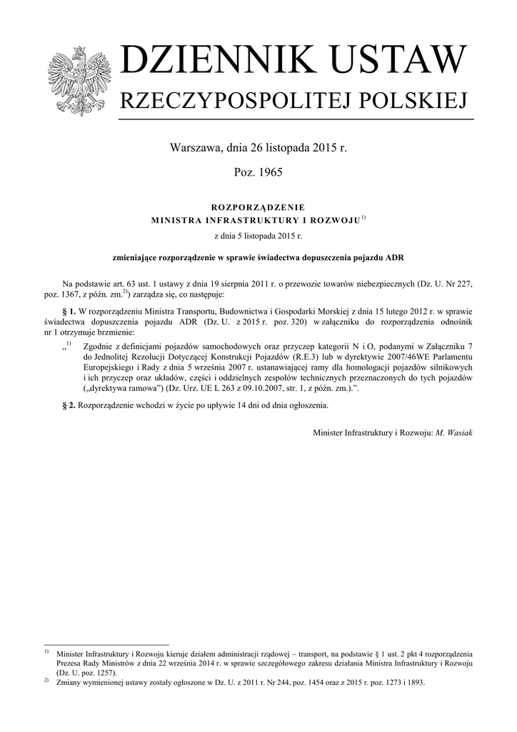 DZIENNIK USTAW RZECZYPOSPOLITEJ POLSKIEJ Warszawa, dnia 26 listopada 2015 r. Poz. 1965 RO ZPO R ZĄ D ZE N I E M INI S TR A INF RA S T R UK TU RY I RO ZW O J U 1) z dnia 5 listopada 2015 r. zmieniające rozporządzenie w sprawie świadectwa dopuszczenia pojazdu ADR Na podstawie art. 63 ust. 1 ustawy z dnia 19 sierpnia 2011 r. o przewozie towarów niebezpiecznych (Dz. U. Nr 227, poz. 1367, z późn. zm.2)) zarządza się, co następuje: § 1. W rozporządzeniu Ministra Transportu, Budownictwa i Gospodarki Morskiej z dnia 15 lutego 2012 r. w sprawie świadectwa dopuszczenia pojazdu ADR (Dz. U. z 2015 r. poz. 320) w załączniku do rozporządzenia odnośnik nr 1 otrzymuje brzmienie: „1) Zgodnie z definicjami pojazdów samochodowych oraz przyczep kategorii N i O, podanymi w Załączniku 7 do Jednolitej Rezolucji Dotyczącej Konstrukcji Pojazdów (R.E.3) lub w dyrektywie 2007/46WE Parlamentu Europejskiego i Rady z dnia 5 września 2007 r. ustanawiającej ramy dla homologacji pojazdów silnikowych i ich przyczep oraz układów, części i oddzielnych zespołów technicznych przeznaczonych do tych pojazdów („dyrektywa ramowa”) (Dz. Urz. UE L 263 z 09.10.2007, str. 1, z późn. zm.).”. § 2. Rozporządzenie wchodzi w życie po upływie 14 dni od dnia ogłoszenia. Minister Infrastruktury i Rozwoju: M. Wasiak 1) 2) Minister Infrastruktury i Rozwoju kieruje działem administracji rządowej – transport, na podstawie § 1 ust. 2 pkt 4 rozporządzenia Prezesa Rady Ministrów z dnia 22 września 2014 r. w sprawie szczegółowego zakresu działania Ministra Infrastruktury i Rozwoju (Dz. U. poz. 1257). Zmiany wymienionej ustawy zostały ogłoszone w Dz. U. z 2011 r. Nr 244, poz. 1454 oraz z 2015 r. poz. 1273 i 1893.