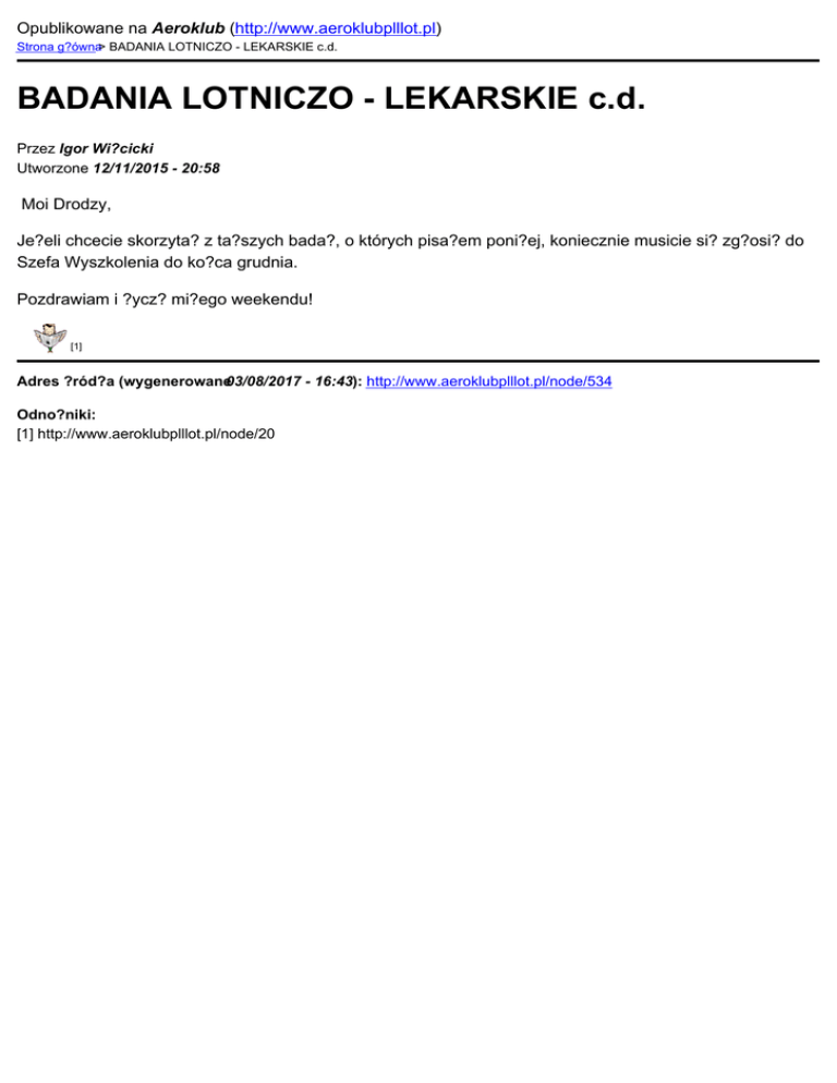 Opublikowane na Aeroklub (http://www.aeroklubplllot.pl) Strona g?ówna> BADANIA LOTNICZO - LEKARSKIE c.d. BADANIA LOTNICZO - LEKARSKIE c.d. Przez Igor Wi?cicki Utworzone 12/11/2015 - 20:58 Moi Drodzy, Je?eli chcecie skorzyta? z ta?szych bada?, o których pisa?em poni?ej, koniecznie musicie si? zg?osi? do Szefa Wyszkolenia do ko?ca grudnia. Pozdrawiam i ?ycz? mi?ego weekendu! [1] Adres ?ród?a (wygenerowane03/08/2017 - 16:43): http://www.aeroklubplllot.pl/node/534 Odno?niki: [1] http://www.aeroklubplllot.pl/node/20