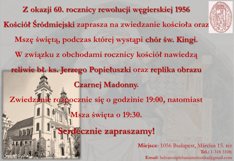 Z okazji 60. rocznicy rewolucji węgierskiej 1956 Kościół Śródmiejski zaprasza na zwiedzanie kościoła oraz Mszę świętą, podczas której wystąpi chór św. Kingi. W związku z obchodami rocznicy kościół nawiedzą reliwie bł. ks. Jerzego Popiełuszki oraz replika obrazu Czarnej Madonny. Zwiedzanie rozpocznie się o godzinie 19:00, natomiast Msza święta o 19:30. Serdecznie zapraszamy! Miejsce: 1056 Budapest, Március 15. tér Tel.: 1-318 3108; Email: [email protected]
