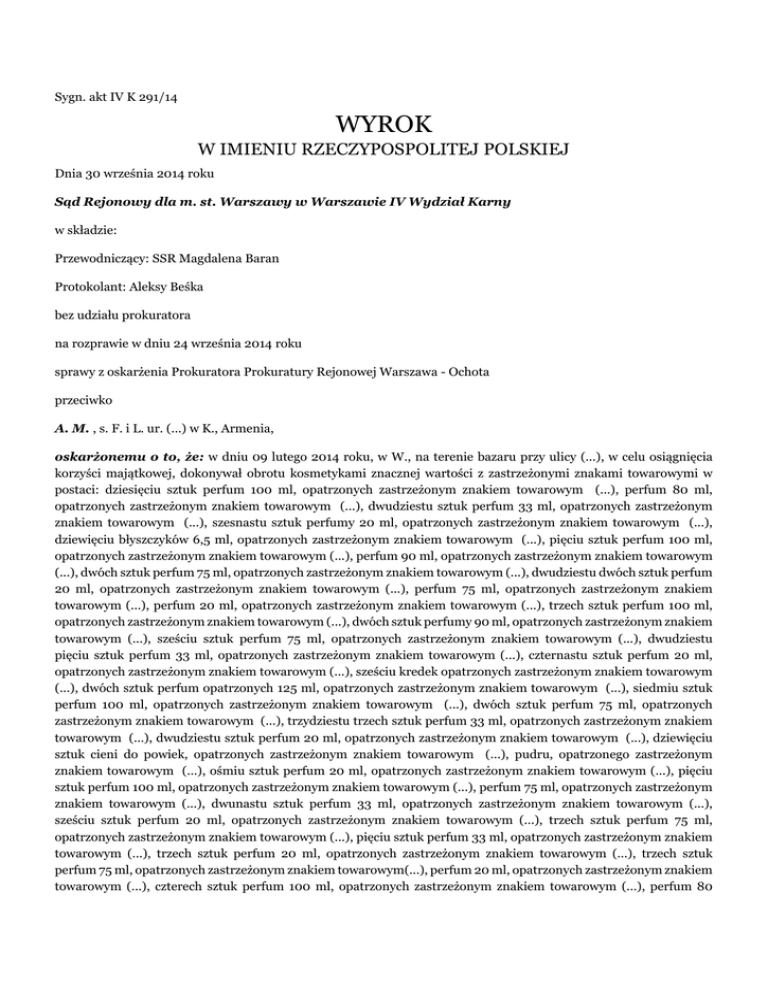 Sygn. akt IV K 291/14 WYROK W IMIENIU RZECZYPOSPOLITEJ POLSKIEJ Dnia 30 września 2014 roku Sąd Rejonowy dla m. st. Warszawy w Warszawie IV Wydział Karny w składzie: Przewodniczący: SSR Magdalena Baran Protokolant: Aleksy Beśka bez udziału prokuratora na rozprawie w dniu 24 września 2014 roku sprawy z oskarżenia Prokuratora Prokuratury Rejonowej Warszawa - Ochota przeciwko A. M. , s. F. i L. ur. (...) w K., Armenia, oskarżonemu o to, że: w dniu 09 lutego 2014 roku, w W., na terenie bazaru przy ulicy (...), w celu osiągnięcia korzyści majątkowej, dokonywał obrotu kosmetykami znacznej wartości z zastrzeżonymi znakami towarowymi w postaci: dziesięciu sztuk perfum 100 ml, opatrzonych zastrzeżonym znakiem towarowym (...), perfum 80 ml, opatrzonych zastrzeżonym znakiem towarowym (...), dwudziestu sztuk perfum 33 ml, opatrzonych zastrzeżonym znakiem towarowym (...), szesnastu sztuk perfumy 20 ml, opatrzonych zastrzeżonym znakiem towarowym (...), dziewięciu błyszczyków 6,5 ml, opatrzonych zastrzeżonym znakiem towarowym (...), pięciu sztuk perfum 100 ml, opatrzonych zastrzeżonym znakiem towarowym (...), perfum 90 ml, opatrzonych zastrzeżonym znakiem towarowym (...), dwóch sztuk perfum 75 ml, opatrzonych zastrzeżonym znakiem towarowym (...), dwudziestu dwóch sztuk perfum 20 ml, opatrzonych zastrzeżonym znakiem towarowym (...), perfum 75 ml, opatrzonych zastrzeżonym znakiem towarowym (...), perfum 20 ml, opatrzonych zastrzeżonym znakiem towarowym (...), trzech sztuk perfum 100 ml, opatrzonych zastrzeżonym znakiem towarowym (...), dwóch sztuk perfumy 90 ml, opatrzonych zastrzeżonym znakiem towarowym (...), sześciu sztuk perfum 75 ml, opatrzonych zastrzeżonym znakiem towarowym (...), dwudziestu pięciu sztuk perfum 33 ml, opatrzonych zastrzeżonym znakiem towarowym (...), czternastu sztuk perfum 20 ml, opatrzonych zastrzeżonym znakiem towarowym (...), sześciu kredek opatrzonych zastrzeżonym znakiem towarowym (...), dwóch sztuk perfum opatrzonych 125 ml, opatrzonych zastrzeżonym znakiem towarowym (...), siedmiu sztuk perfum 100 ml, opatrzonych zastrzeżonym znakiem towarowym (...), dwóch sztuk perfum 75 ml, opatrzonych zastrzeżonym znakiem towarowym (...), trzydziestu trzech sztuk perfum 33 ml, opatrzonych zastrzeżonym znakiem towarowym (...), dwudziestu sztuk perfum 20 ml, opatrzonych zastrzeżonym znakiem towarowym (...), dziewięciu sztuk cieni do powiek, opatrzonych zastrzeżonym znakiem towarowym (...), pudru, opatrzonego zastrzeżonym znakiem towarowym (...), ośmiu sztuk perfum 20 ml, opatrzonych zastrzeżonym znakiem towarowym (...), pięciu sztuk perfum 100 ml, opatrzonych zastrzeżonym znakiem towarowym (...), perfum 75 ml, opatrzonych zastrzeżonym znakiem towarowym (...), dwunastu sztuk perfum 33 ml, opatrzonych zastrzeżonym znakiem towarowym (...), sześciu sztuk perfum 20 ml, opatrzonych zastrzeżonym znakiem towarowym (...), trzech sztuk perfum 75 ml, opatrzonych zastrzeżonym znakiem towarowym (...), pięciu sztuk perfum 33 ml, opatrzonych zastrzeżonym znakiem towarowym (...), trzech sztuk perfum 20 ml, opatrzonych zastrzeżonym znakiem towarowym (...), trzech sztuk perfum 75 ml, opatrzonych zastrzeżonym znakiem towarowym(...), perfum 20 ml, opatrzonych zastrzeżonym znakiem towarowym (...), czterech sztuk perfum 100 ml, opatrzonych zastrzeżonym znakiem towarowym (...), perfum 80 ml, opatrzonych zastrzeżonym znakiem towarowym (...), pięciu sztuk perfum 33 ml, opatrzonych zastrzeżonym znakiem towarowym (...), dziesięciu sztuk perfum 20 ml, opatrzonych zastrzeżonym znakiem towarowym (...), sześciu sztuk perfum 200 ml, opatrzonych zastrzeżonym znakiem towarowym (...), trzech sztuk perfum 125 ml, opatrzonych zastrzeżonym znakiem towarowym (...), czternastu sztuk perfum 100 ml, opatrzonych zastrzeżonym znakiem towarowym (...), dwudziestu sześciu sztuk perfum 33 ml, opatrzonych zastrzeżonym znakiem towarowym (...), czterdziestu jeden sztuk perfum 75 ml, opatrzonych zastrzeżonym znakiem towarowym (...), siedemnastu sztuk tuszy do rzęs, opatrzonych zastrzeżonym znakiem towarowym (...), trzech sztuk podkładów do twarzy opatrzonych zastrzeżonym znakiem towarowym (...), błyszczykiem do ust, opatrzonym zastrzeżonym znakiem towarowym (...), ośmiu sztuk pomadek, opatrzonych zastrzeżonym znakiem towarowym (...), dwóch sztuk perfum 100 ml, opatrzonych zastrzeżonym znakiem towarowym (...), sześciu sztuk perfum 90 ml, opatrzonych zastrzeżonym znakiem towarowym (...), dziesięciu sztuk perfum 33 ml, opatrzonych zastrzeżonym znakiem towarowym (...), siedemnastu sztuk perfum 20 ml, opatrzonych zastrzeżonym znakiem towarowym (...), dziewięciu sztuk tuszy do rzęs, opatrzonych zastrzeżonym znakiem towarowym (...), siedmiu sztuk błyszczyków, opatrzonych zastrzeżonym znakiem towarowym (...), dwunastu sztuk pudrów, opatrzonych zastrzeżonym znakiem towarowym (...), cieni do powiek, opatrzonych zastrzeżonym znakiem towarowym (...), pomadki, opatrzonej zastrzeżonym znakiem towarowym (...), sześciu sztuk perfum 100 ml, opatrzonych zastrzeżonym znakiem towarowym (...), perfum 50 ml, opatrzonych zastrzeżonym znakiem towarowym(...), dwudziestu sztuk perfum 33 ml, opatrzonych zastrzeżonym znakiem towarowym (...), dziesięciu sztuk perfum 20 ml, opatrzonych zastrzeżonym znakiem towarowym (...), perfum 100 ml, opatrzonych zastrzeżonym znakiem towarowym (...), czterech sztuk perfum 90 ml, opatrzonych zastrzeżonym znakiem towarowym (...), perfum 20 ml, opatrzonych zastrzeżonym znakiem towarowym (...), pięciu pomadek, opatrzonych zastrzeżonym znakiem towarowym (...), błyszczyka, opatrzonego zastrzeżonym znakiem towarowym (...), pięciu sztuk kremu zestawu, opatrzonego zastrzeżonym znakiem towarowym (...), pięciu sztuk perfum 100 ml, opatrzonych zastrzeżonym znakiem towarowym (...), szesnastu sztuk perfum 33 ml, opatrzonych zastrzeżonym znakiem towarowym (...), kremu, opatrzonego zastrzeżonym znakiem towarowym (...), dwun