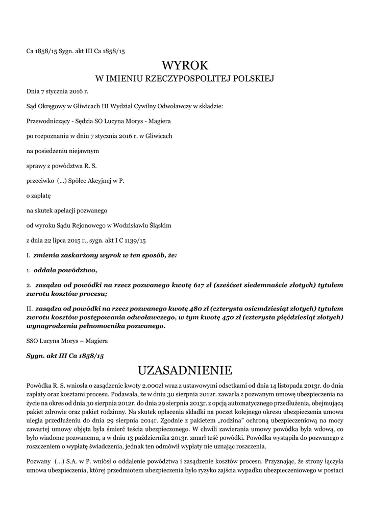 Ca 1858/15 Sygn. akt III Ca 1858/15 WYROK W IMIENIU RZECZYPOSPOLITEJ POLSKIEJ Dnia 7 stycznia 2016 r. Sąd Okręgowy w Gliwicach III Wydział Cywilny Odwoławczy w składzie: Przewodniczący - Sędzia SO Lucyna Morys - Magiera po rozpoznaniu w dniu 7 stycznia 2016 r. w Gliwicach na posiedzeniu niejawnym sprawy z powództwa R. S. przeciwko (...) Spółce Akcyjnej w P. o zapłatę na skutek apelacji pozwanego od wyroku Sądu Rejonowego w Wodzisławiu Śląskim z dnia 22 lipca 2015 r., sygn. akt I C 1139/15 I. zmienia zaskarżony wyrok w ten sposób, że: 1. oddala powództwo, 2. zasądza od powódki na rzecz pozwanego kwotę 617 zł (sześćset siedemnaście złotych) tytułem zwrotu kosztów procesu; II. zasądza od powódki na rzecz pozwanego kwotę 480 zł (czterysta osiemdziesiąt złotych) tytułem zwrotu kosztów postępowania odwoławczego, w tym kwotę 450 zł (czterysta pięćdziesiąt złotych) wynagrodzenia pełnomocnika pozwanego. SSO Lucyna Morys – Magiera Sygn. akt III Ca 1858/15 UZASADNIENIE Powódka R. S. wniosła o zasądzenie kwoty 2.000zł wraz z ustawowymi odsetkami od dnia 14 listopada 2013r. do dnia zapłaty oraz kosztami procesu. Podawała, że w dniu 30 sierpnia 2012r. zawarła z pozwanym umowę ubezpieczenia na życie na okres od dnia 30 sierpnia 2012r. do dnia 29 sierpnia 2013r. z opcją automatycznego przedłużenia, obejmującą pakiet zdrowie oraz pakiet rodzinny. Na skutek opłacenia składki na poczet kolejnego okresu ubezpieczenia umowa uległa przedłużeniu do dnia 29 sierpnia 2014r. Zgodnie z pakietem „rodzina” ochroną ubezpieczeniową na mocy zawartej umowy objęta była śmierć teścia ubezpieczonego. W chwili zawierania umowy powódka była wdową, co było wiadome pozwanemu, a w dniu 13 października 2013r. zmarł teść powódki. Powódka wystąpiła do pozwanego z roszczeniem o wypłatę świadczenia, jednak ten odmówił wypłaty nie uznając roszczenia. Pozwany (...) S.A. w P. wniósł o oddalenie powództwa i zasądzenie kosztów procesu. Przyznając, że strony łączyła umowa ubezpieczenia, której przedmiotem ubezpieczenia było ryzyko zajścia wypadku ubezpieczeniowego w postaci między innym śmierci rodzica i teścia małżonka ubezpieczonego z sumą ubezpieczenia 2000zł, zarzucił, powołując się na ogólne warunki ubezpieczenia, że powódka nie spełnia warunków umowy ubezpieczenia, bowiem w chwili zdarzenia mąż powódki nie żył, a więc nie pozostawał z powódką w związku małżeńskim. Podnosił, że zapisy umowy mają w pierwszej kolejności zastosowanie, zatem powoływane przez powódkę przepisy kodeksu cywilnego dotyczące powinowactwa, mogły by mieć zastosowanie, gdyby umowa tej kwestii nie regulowała. Zaskarżonym wyrokiem z dnia 22 lipca 2015r. Sąd Rejonowy w Wodzisławiu Śląskim w pkt 1 zasądził od pozwanego na rzecz powódki kwotę 2.000zł (dwa tysiące złotych) z ustawowymi odsetkami od dnia 14 listopada 2013r. do dnia zapłaty; w pkt 2 zaś zasądził od pozwanego na rzecz powódki kwotę 647zł (sześćset czterdzieści siedem złotych) tytułem zwrotu kosztów procesu. Bezspornym było, że strony łączyła umowa ubezpieczenia „życie plus”, zawarta w dniu 30 sierpnia 2012r., na okres do 29 sierpnia 2013r., następnie przedłużona do dnia 29 sierpnia 2014r. Ochroną ubezpieczeniową objęte były między innymi takie zdarzenia jak: śmierć ubezpieczonego, trwały uszczerbek na zdrowiu, pokrycie kosztów leczenia, poważne zachorowanie ubezpieczonego, pobyt w szpitalu w następstwie nieszczęśliwego wypadku i choroby. Dodatkowo umowa obejmowała tzw. pakiet „rodzina”, na podstawie którego ochroną ubezpieczeniową objęte były między innymi takie zdarzenia jak: śmierć współmałżonka ubezpieczonego, czy śmierć rodzica i teścia ubezpieczonego (Klauzula 10). W przypadku śmierci rodzica lub teścia była przewidziana suma ubezpieczenia w kwocie 2000zł. Ustalił Sąd Rejonowy, iż zgodnie z postanowieniami umownymi współmałżonek to współubezpieczony, osoba pozostająca z ubezpieczonym w związku małżeńskim,, w stosunku do którego nie została orzeczona separacja zgodnie z obowiązującymi przepisami prawa. Za współmałżonka uznaje się również niespokrewnionego z ubezpieczonym partnera, który ukończył 18 rok życia, który posiada od minimum 12 miesięcy przed datą przystąpienia do ubezpieczenia ten sam adres zameldowania co ubezpieczony lub wspólnie z ubezpieczonym zaciągnął kredyt hipoteczny i wspólnie prowadzą gospodarstwo domowe lub posiada z ubezpieczonym przynajmniej jedno dziecko i wspólnie prowadzą gospodarstwo domowe (§ 2 pkt 28 OWU). Z kolei teść ubezpieczonego to współubezpieczony, bez względu na wiek, ojciec lub matka małżonka ubezpieczonego lub osoba, która dokonała pełnego lub częściowego przysposobienia małżonka ubezpieczonego (klauzula 10 § 1 pkt 2 OWU). Jak ustalono, w dniu 11 sierpnia 2012r. zmarł mąż powódki A. S., a w dniu 13 października 2013r. zmarł teść powódki J. S.. Powódka wystąpiła do pozwanego o wypłatę świadczenia w związku ze śmiercią teścia. Pozwany ostatecznie w piśmie z dnia 29 listopada 2013r. odmówił wypłaty świadczenia. W tym stanie rzeczy uznał Sąd Rejonowy, iż powództwo zasługiwało na uwzględnienie, kierując się regulacją art. 805 § 1 - 4k.c. Uznał, że elementami przedmiotowo istotnymi umowy ubezpieczenia jest z jednej strony zobowiązanie do spełnienia określonego świadczenia przez ubezpieczyciela w razie zajścia określonego w umowie wypadku, z drugiej zaś strony zobowiązanie do zapłaty składki przez ubezpieczającego. Stwierdził, że wypadek ubezpieczeniowy jest zdarzeniem prawnym, gdyż od jego nastąpienia uzależnione jest powstanie określonych skutków prawnych – powstanie obowiązku wypłaty odszkodowania lub innego świadczenia powodującego przemianę ekspektatywy prawa do świadczenia, które miał ubezpieczający od chwili powstania s