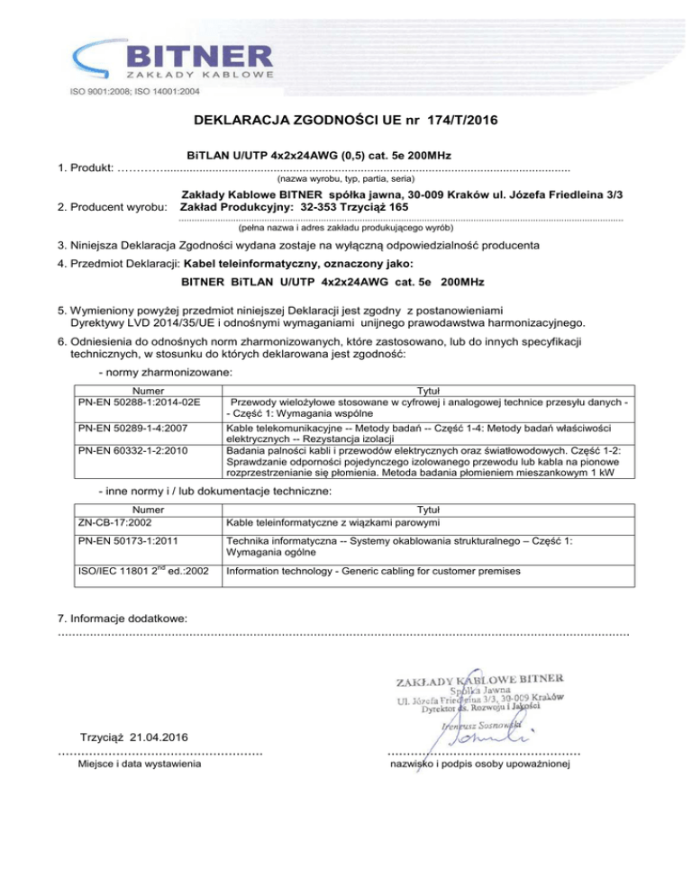 DEKLARACJA ZGODNOŚCI UE nr 174/T/2016 BiTLAN U/UTP 4x2x24AWG (0,5) cat. 5e 200MHz 1. Produkt: ………….............................................................................................................................. (nazwa wyrobu, typ, partia, seria) Zakłady Kablowe BITNER spółka jawna, 30-009 Kraków ul. Józefa Friedleina 3/3 Zakład Produkcyjny: 32-353 Trzyciąż 165 2. Producent wyrobu: ............................................................................................................................................................................ (pełna nazwa i adres zakładu produkującego wyrób) 3. Niniejsza Deklaracja Zgodności wydana zostaje na wyłączną odpowiedzialność producenta 4. Przedmiot Deklaracji: Kabel teleinformatyczny, oznaczony jako: BITNER BiTLAN U/UTP 4x2x24AWG cat. 5e 200MHz 5. Wymieniony powyżej przedmiot niniejszej Deklaracji jest zgodny z postanowieniami Dyrektywy LVD 2014/35/UE i odnośnymi wymaganiami unijnego prawodawstwa harmonizacyjnego. 6. Odniesienia do odnośnych norm zharmonizowanych, które zastosowano, lub do innych specyfikacji technicznych, w stosunku do których deklarowana jest zgodność: - normy zharmonizowane: Numer PN-EN 50288-1:2014-02E Tytuł Przewody wielożyłowe stosowane w cyfrowej i analogowej technice przesyłu danych - Część 1: Wymagania wspólne PN-EN 50289-1-4:2007 Kable telekomunikacyjne -- Metody badań -- Część 1-4: Metody badań właściwości elektrycznych -- Rezystancja izolacji Badania palności kabli i przewodów elektrycznych oraz światłowodowych. Część 1-2: Sprawdzanie odporności pojedynczego izolowanego przewodu lub kabla na pionowe rozprzestrzenianie się płomienia. Metoda badania płomieniem mieszankowym 1 kW PN-EN 60332-1-2:2010 - inne normy i / lub dokumentacje techniczne: Numer ZN-CB-17:2002 Tytuł Kable teleinformatyczne z wiązkami parowymi PN-EN 50173-1:2011 Technika informatyczna -- Systemy okablowania strukturalnego – Część 1: Wymagania ogólne ISO/IEC 11801 2 nd ed.:2002 Information technology - Generic cabling for customer premises 7. Informacje dodatkowe: ................................................................................................................................................................. Trzyciąż 21.04.2016 ..................................................... Miejsce i data wystawienia .................................................. nazwisko i podpis osoby upoważnionej